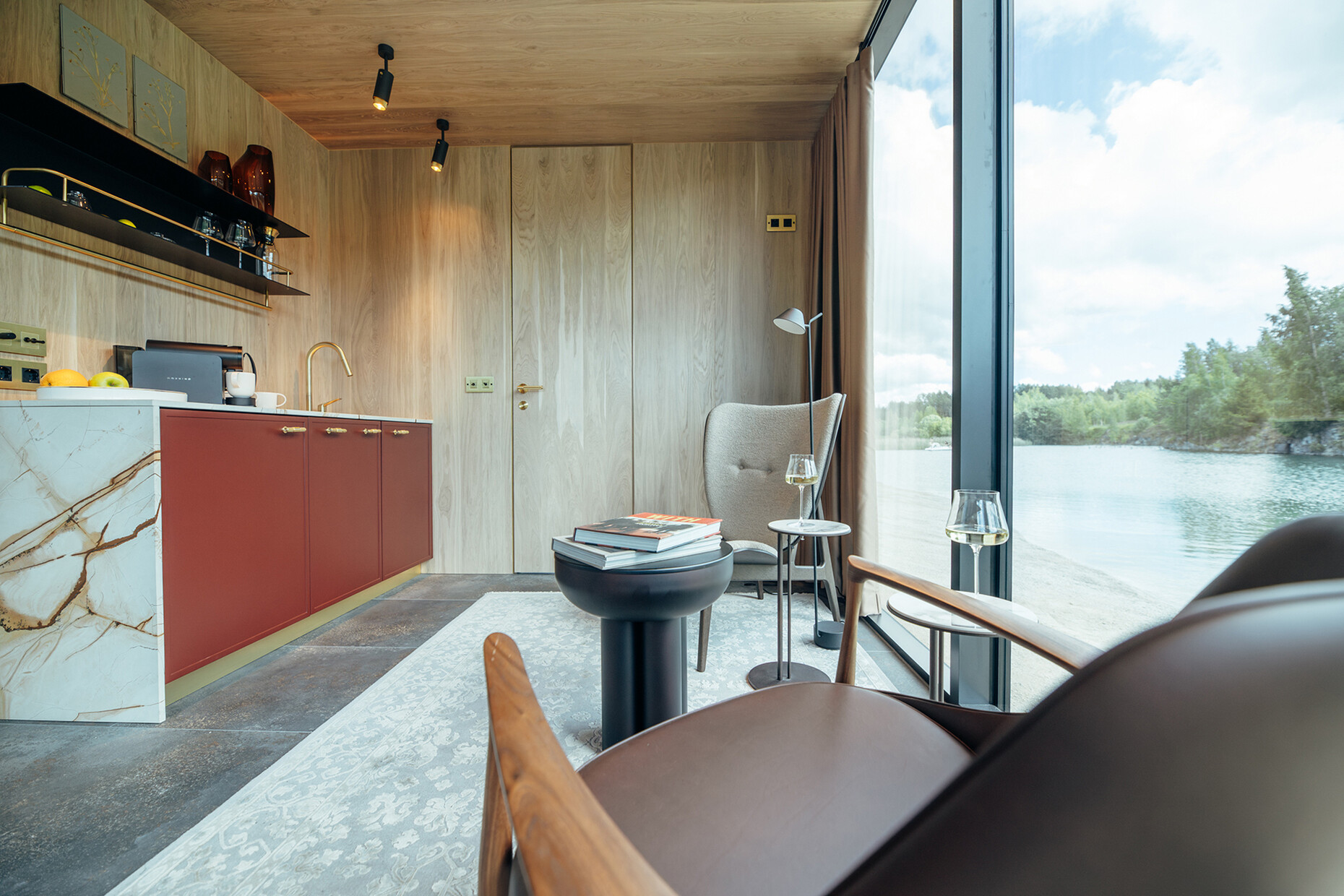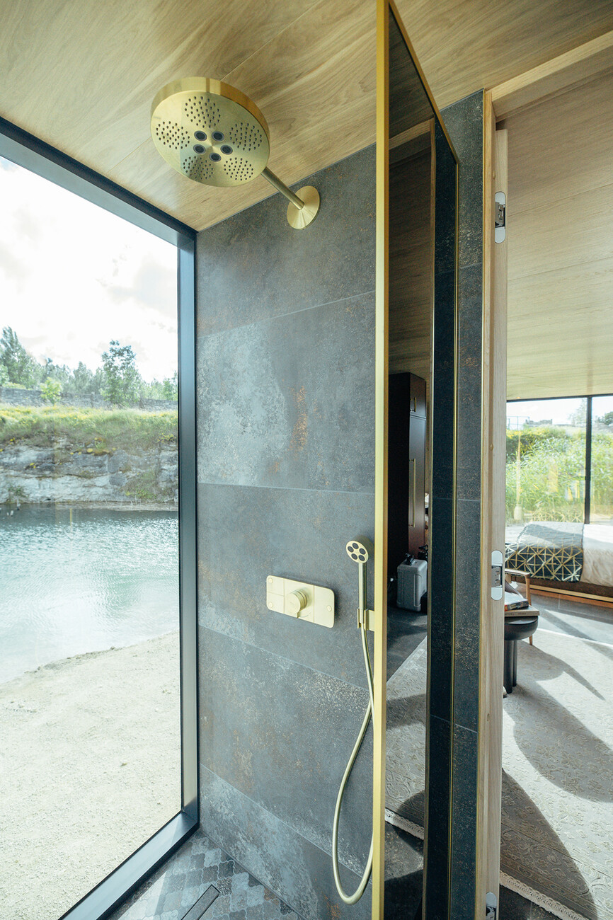 Andreas Tiik: Die Größe zu den Mirror Houses ist ähnlich, aber alles andere unterscheidet sich, sowohl im Interior Design wie in der Art des Glases für die Außenhaut. Für die Innenausstattung haben wir Elemente wie Beschläge aus Messing sowie messingbeschichtete Leuchten verwendet, damit die Systeme zum Produkt passen und sich in das Thema des gesamten Hauses einfügen. Das Interior Design soll außergewöhnlich sein, ohne zu stark aufzutragen.