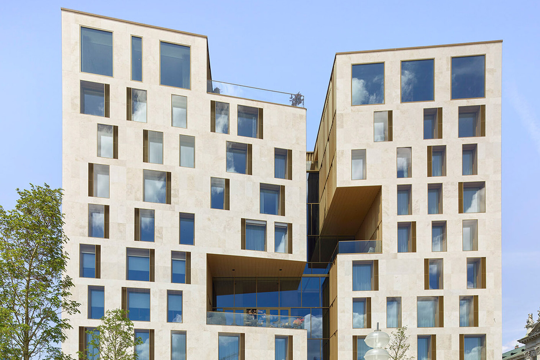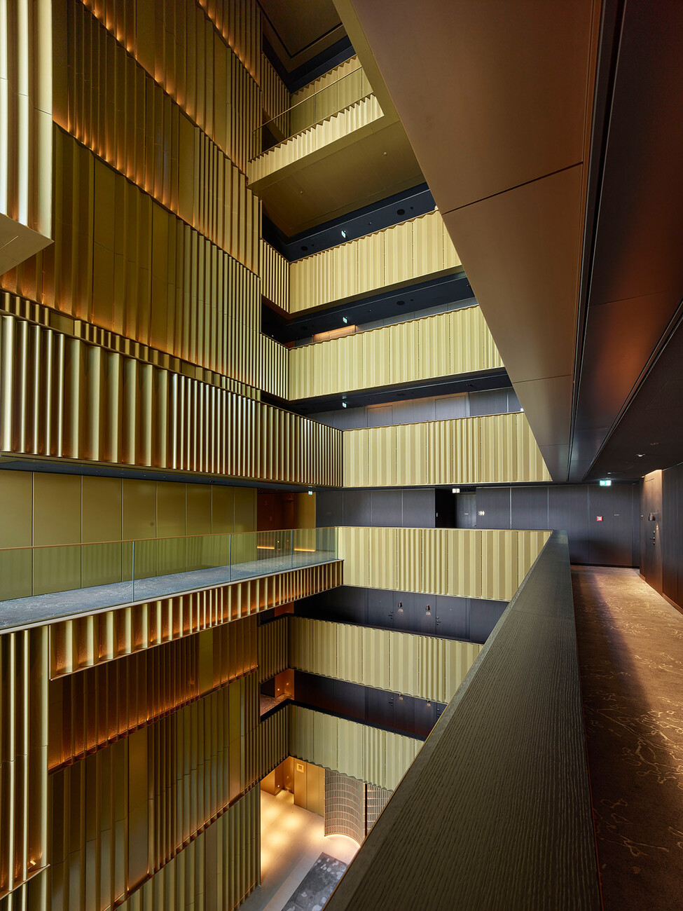 Die kubische Bauweise auf neun Etagen wird so von einem vertikalen Einschnitt in der Fassade unterbrochen, der den Bau visuell in zwei Teile öffnet. Sowohl durch die Gebäudefuge, wie durch die zahlreichen Holz-Metall-Kastenfenster fällt viel Tageslicht. Die goldenen Lamellenstrukturen, die eine Symbiose von außen und innen schaffen, werden so perfekt in Szene gesetzt. Ebenso dienen sie im Innenraum als anmutige Akustikelemente, so dass der Schall in dem 20 Meter langem Atrium trotz dessen imposanter Größe stets gedämpft ist. Der geschliffene Travertin des Baus schafft indes im Verbund mit dem markanten, zeitgenössischen Charakter der Architektur eine optische Harmonie zum Bestand in der Nachbarschaft. Kaum eröffnet, gehört der Koenigshof bereits zu den beliebtesten Adressen der Stadt, wenn es edel sein darf – dank dem Restaurant und der Bar auf dem Dach auch bei den Einheimischen.