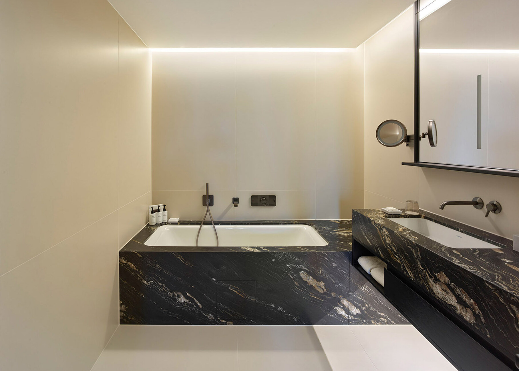 Zu den Annehmlichkeiten, die die Gäste des Koenigshof genießen dürfen, zählt die luxuriöse Ausstattung der 106 Zimmer: Bis in die Bäder haben die Innenarchitekten Landau + Kindelbacher diese kuratiert und setzen dabei auf natürliche Materialien, sanfte Farben und maximalen Komfort. Die eleganten Formen von AXOR passen perfekt in diese angenehme Atmosphäre und komplementieren mit der Farbgebung in Brushed Black Chrome (PVD) die dunklen Marmorverkleidungen der Waschbecken und Badewannen. Für diese wurde die "AXOR One Einhebel Waschtischarmatur" wie das "AXOR One Thermostat Untermodul" und die "AXOR Starck Stabhandbrause" gewählt. Neben der ästhetischen Gestaltung ist die Funktion der Produkte von AXOR fein justiert: Mit integriertem Luftsprudler und der AirPower Technologie läuft der Wasserstrahl besonders leicht und angenehm, während der Verbrauch der Ressource gesenkt wird. Auch die Stabhandbrause von Designer Philippe Starck spart mittels der EcoSmart Technologie reichlich Wasser und Energie, in dem die maximale Durchflussmenge nur acht Liter pro Minute beträgt.