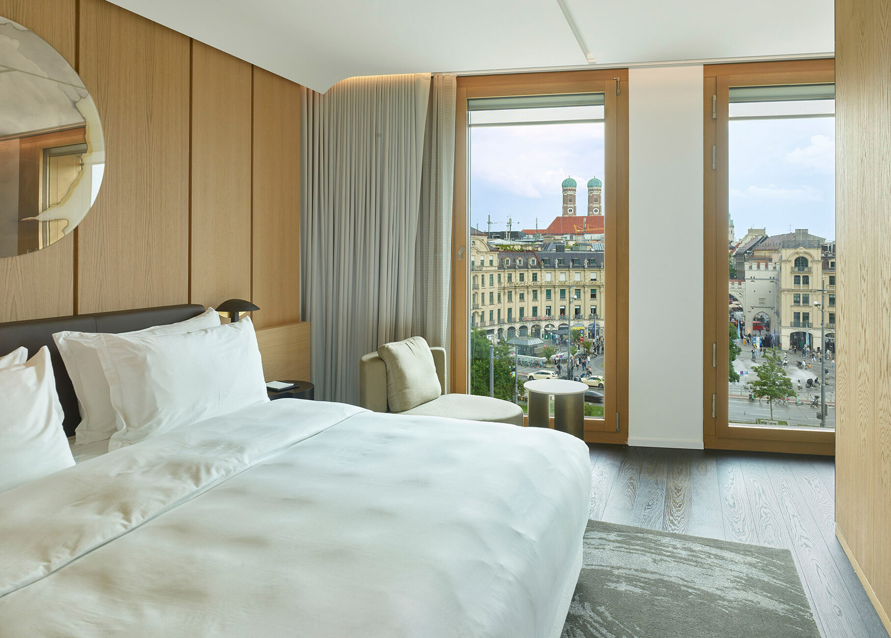 Das Grundstück am Stachus, dem Karlsplatz in München, ist seit jeher der Gastfreundschaft gewidmet: In prominenter Innenstadtlage in Nähe des Hauptbahnhofes fanden bereits Ende des 19. Jahrhunderts die gut betuchten BesucherInnen der Stadt ein temporäres Zuhause. Die Architektur war indes nicht minder wechselhaft, bedingt durch die zerstörerischen Folgen des zweiten Weltkriegs und funktionalistischen Strukturen der Nachkriegsplanung. 2019 erfolgte der endgültige Abriss des Bestands. Der Neubau des spanischen Architekturbüros Nieto Sobejano für den Koenigshof mit 24.200 Quadratmetern ist somit in vielerlei Hinsicht ein frischer Start – und das direkt aus der Pole Position heraus: Das neue Hotel ist Teil der Luxury Collection der Marriott-Hotelgruppe und bis in die Details eindrucksvoll entworfen.
