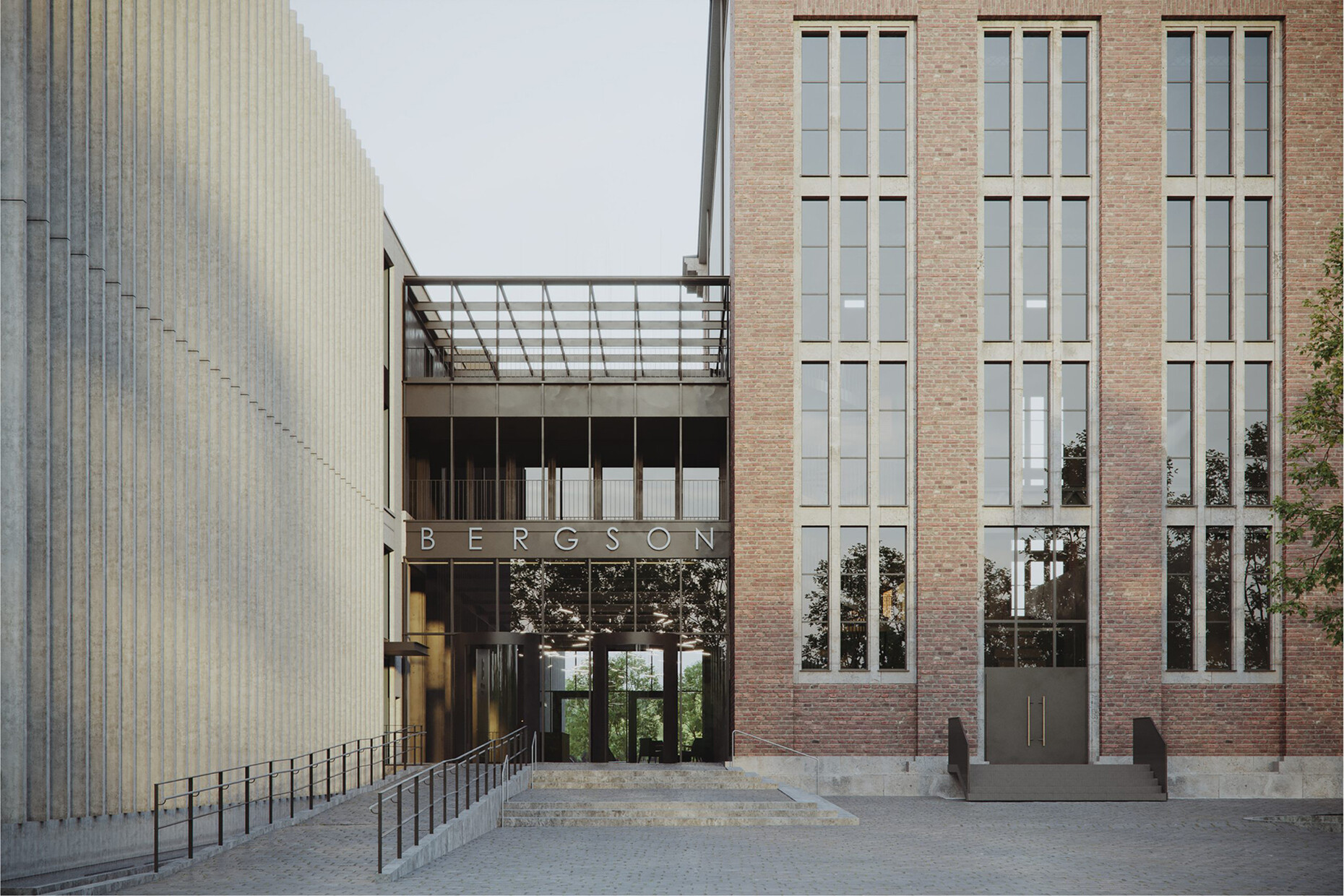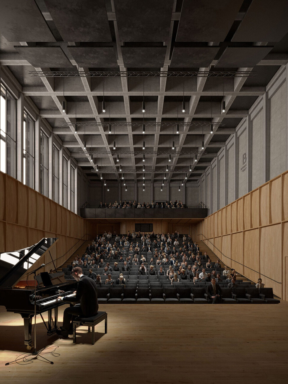 Das ehemalige Heizkraftwerk in einem unscheinbaren Wohn- und Gewerbegebiet am Münchner Stadtrand bietet dafür mit seiner Stahlbeton-Ziegel-Architektur und den schmalen, hohen, die Flächen senkrecht rhythmisierenden Fensterbändern eine einzigartige Kulisse. Es wurde zwar in der Zeit des Nationalsozialismus errichtet, die bauliche Gestaltung entstammt aber dem Historismus des frühen 20. Jahrhunderts. "Die Fassade entspricht daher nicht dem 'nationalsozialistischen Stil'", sagt Architekt Markus Stenger. Der imposante Kubus soll auch in Zukunft die Optik des Ortes bestimmen. Ihm zur Seite gestellt wird ein in der Höhe deutlich untergeordneter, kubischer Neubau, dessen vor eine Glashülle gesetzte Lamellenfassade die vertikale Fenstereinteilung des historischen Bauwerks aufnimmt. Durch die gleichmäßige Anordnung der Lamellen über die gesamte Länge des Neubaus entsteht eine Art Leinwand, vor der die Architektur des alten Heizkraftwerks noch besser zur Geltung kommt. Das ergänzende Gebäude sei nötig, um die vielfältige Nutzung zu ermöglichen, erklärt Stenger. Es beherbergt neben Show- und Tagungsräumen die "Pulpo Gallery", die über vier Stockwerke reicht, und mit dem "Elektra Tonquartier" einen Konzertsaal für 476 Personen im klassischen rechteckigen "Shoebox"-Design.