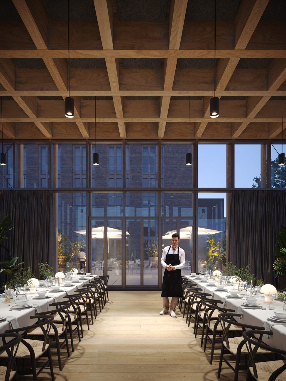 In einen solch gigantischen Raum Aufenthaltsqualität in menschlichem Maßstab zu bringen, war Aufgabe der Interior Experten von Arnold/Werner. "Auf der klassischen Linie von Stenger2 Architekten mit Sichtbeton, Eichenholz und einem dunklen Gussasphalt-Terrazzo konnten wir gut aufbauen", sagt Sascha Arnold. Grundlage des Interior-Entwurfs ist ein Farb- und Materialkonzept, das die hier einst stattfindenden Verbrennungsprozesse erlebbar macht. Im weitläufigen Foyer-Bereich mit Tages-Bar dominiert ein Mix aus schwefelgelben und aschgrauen Farbtönen. An der Südseite ist das Fine-Dining-Restaurant "Zeitlang" mit separatem Lounge- und Barbereich platziert. Dort erzeugen Oberflächen aus karbonisiertem Holz und schwarz geschlemmten Ziegeln räumliche Geborgenheit innerhalb der rohen Stahlbeton-Skelettstruktur der Halle. "Das Restaurant haben wir mit Absicht sehr dunkel gehalten, denn es wird wohl hauptsächlich abends frequentiert", erklärt Arnold. Gute Akustik, ein gutes Lichtkonzept und Eckplätze macht er als Grundpfeiler für ein gelungenes Gastronomie-Interior fest. Für die Tages-Bar und das Restaurant im "Atrium" heißt das: Gepolsterte Sitzbänke mit hohen Rückenlehnen, unter die Tischplatten geklebtes Akustikmaterial, um den Schallpegel zu dämpfen, ein durchdachtes Lichtkonzept mit einer Grundbeleuchtung mit schmalen Kegeln von der Decke herab und dimmbaren Szenespots über den Tischen.
