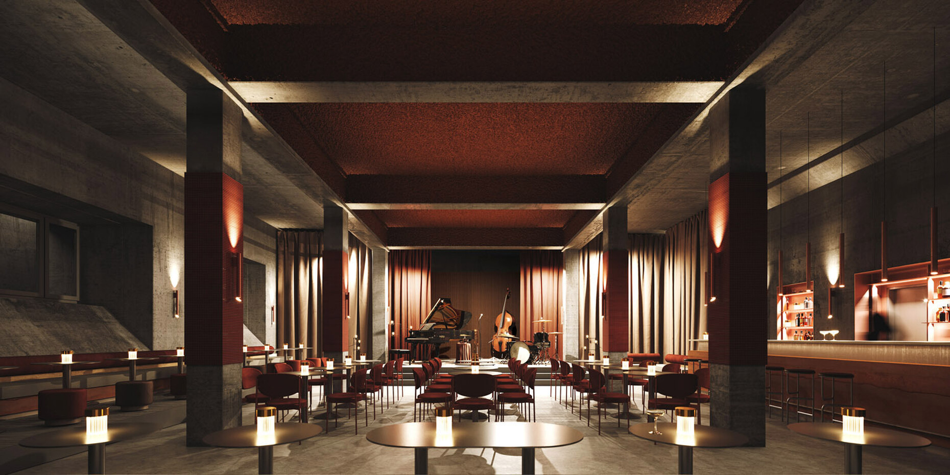 Und wenn draußen die Sonne untergeht, gehen im Live-Club "Barbastelle" im bunkerartigen Untergeschoss der ehemaligen Kesselhalle die Scheinwerfer an. Auf der Bühne: Jazzmusiker, Comedians oder Schriftsteller. Schwere Vorhänge und kleine runde Tische mit Tischbeleuchtung, dazu glutrote Farbtöne und eine Bar mit kleiner Speisekarte kreieren ein intimes Ambiente. "Wir haben versucht, die Atmosphäre der New Yorker Jazzclubs der 1930er-Jahre in die Jetztzeit zu transferieren", sagt Arnold. Der Live-Club wurde nach der seltenen Mopsfledermaus (barbastella barbastellus) benannt, die das stillgelegte Heizwerk als Winterquartier nutzte. Damit sich die streng geschützte Art auch im Bergson Kunstkraftwerk wohlfühlt, hat man ihr im Untergeschoss eine eigene abgeschottete Wohnhöhle eingerichtet, samt Flugtunnel als Verbindung zur Oberfläche in einiger Distanz zum künftigen Kulturbetrieb, der sich hier ab Oktober 2023 abspielen soll.