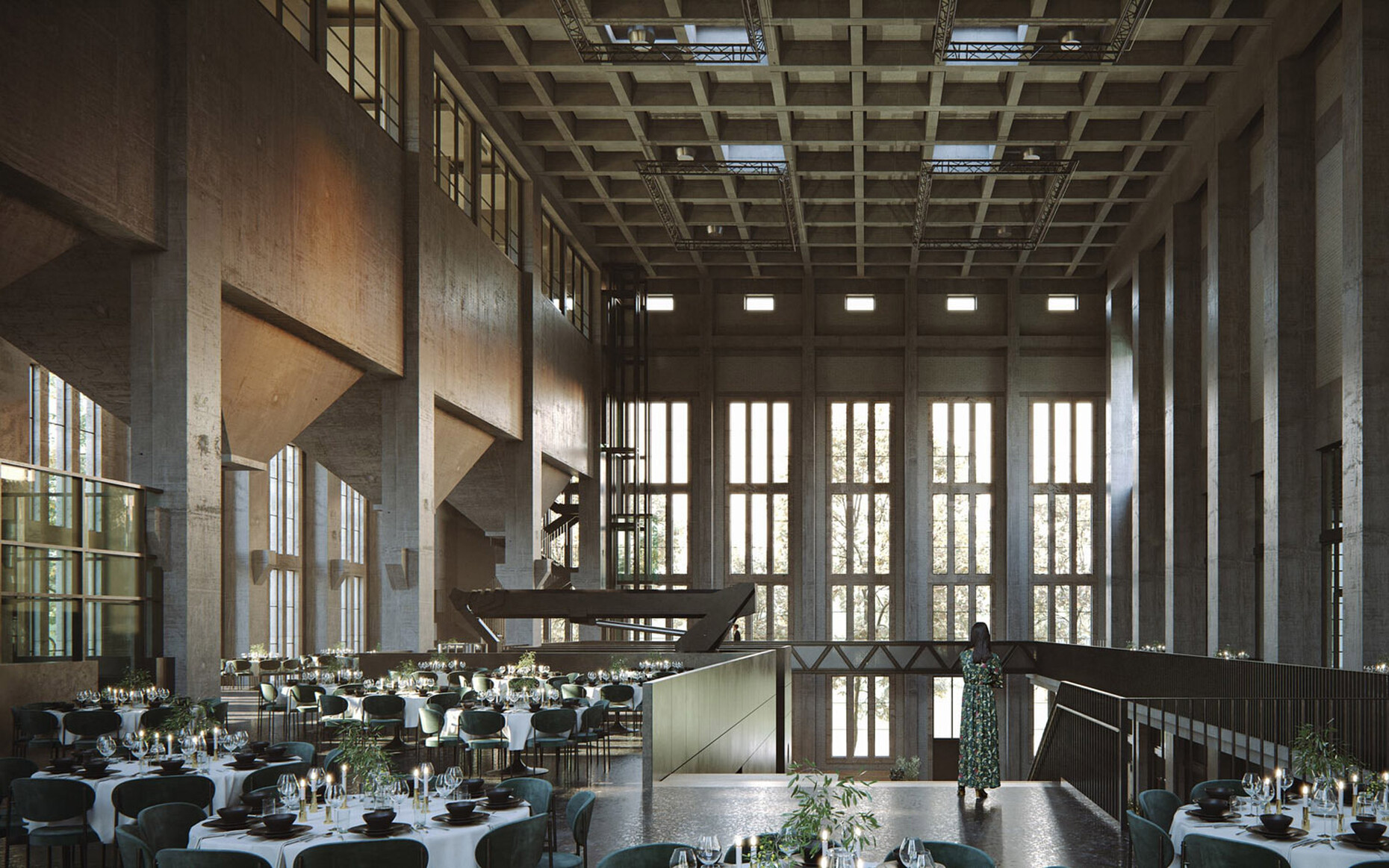 Herzkammer des Bergson Kunstkraftwerks ist die beinahe 25 Meter hohe ehemalige Kesselhalle des Heizkraftwerks: das "Atrium", konstruktiv ein Stahlbetonskelett mit historisierender Hülle und neu hinzugefügten Erschließungsbauteilen. "Man muss den Kopf in den Nacken legen, um die Decke sehen zu können", sagt Stenger. "Ein Gefühl wie beim Pantheon in Rom." Einen Eindruck, den die ArchitektInnen durch den Einbau einer statisch notwendigen Stahlbetondecke in Kassettenform unterstützen. Leitidee sei von Anfang an gewesen, die Wirkung des gewaltigen Raumvolumens zu erhalten und die Horizontale dennoch erlebbar zu machen. Eingebaut werden deshalb lediglich ein monolithischer Technikblock zur Versorgung der Gastronomie im Erdgeschoss, eine Tagesbar, schwarzverkleidet und in ihrer Kubatur an die früheren Heizkessel erinnernd, sowie eine breite Treppe in der Mitte der Halle, die mit Sitzstufen aus Eichenholz zum Verweilen einlädt und auf die "Bel Étage" führt. Die Rundum-Galerie in sechs Metern Höhe bietet fantastische Ausblicke in die kathedralenhafte Weite der Halle.