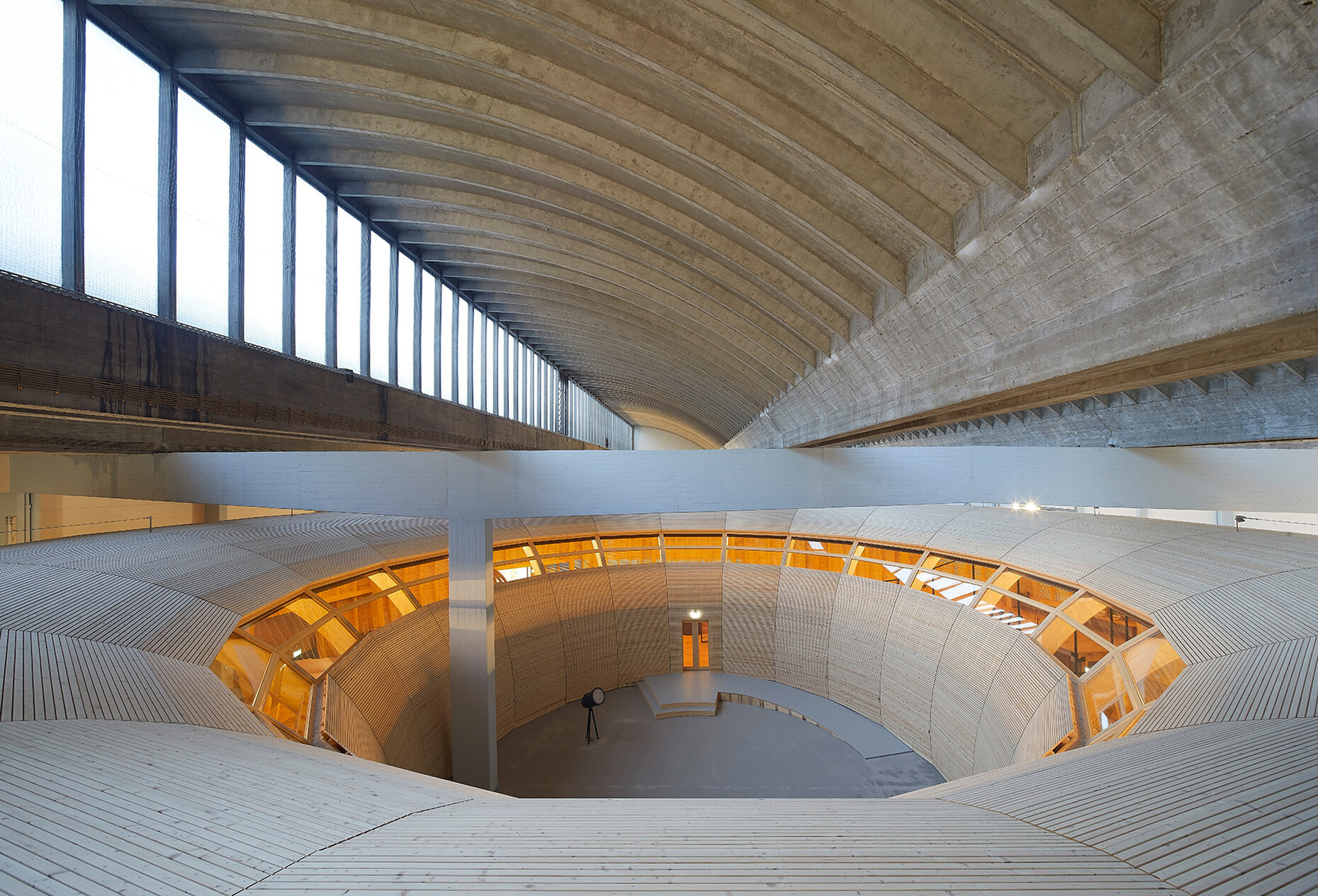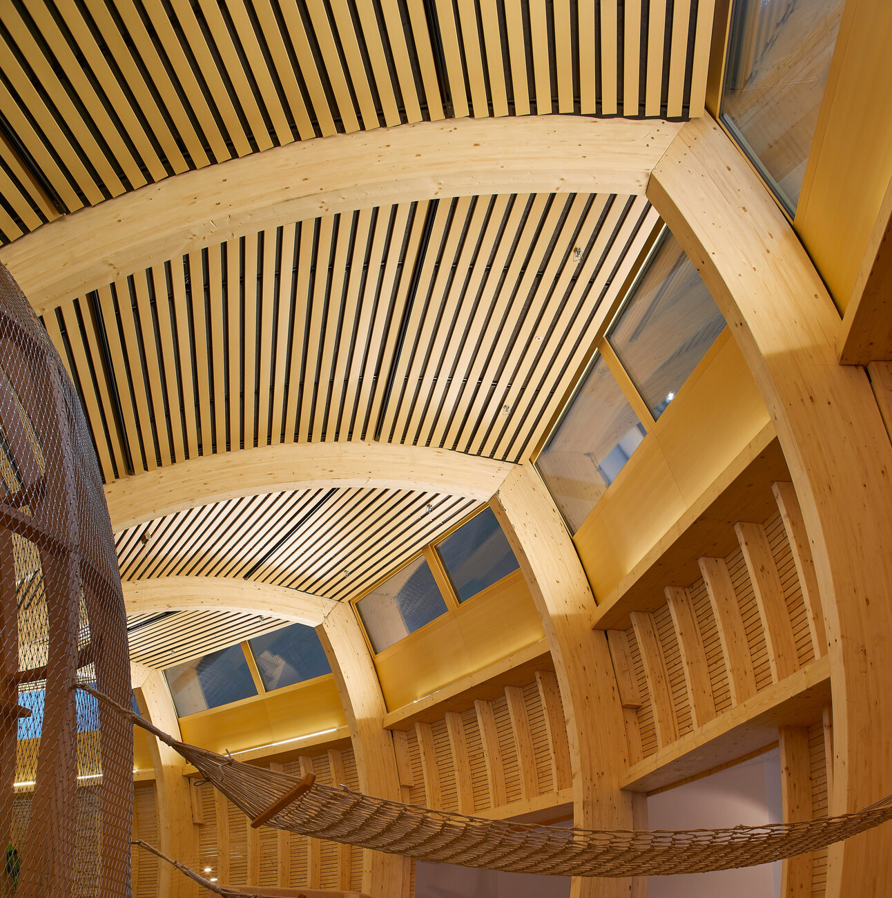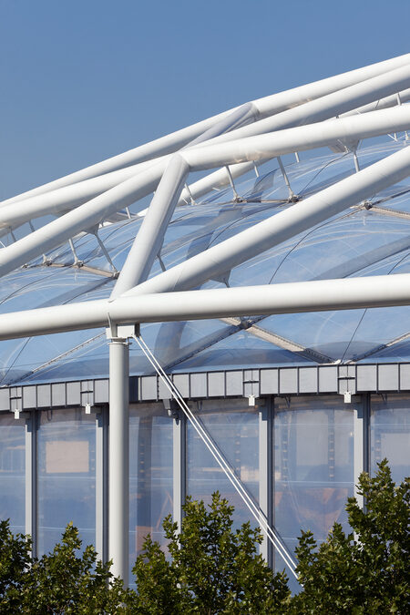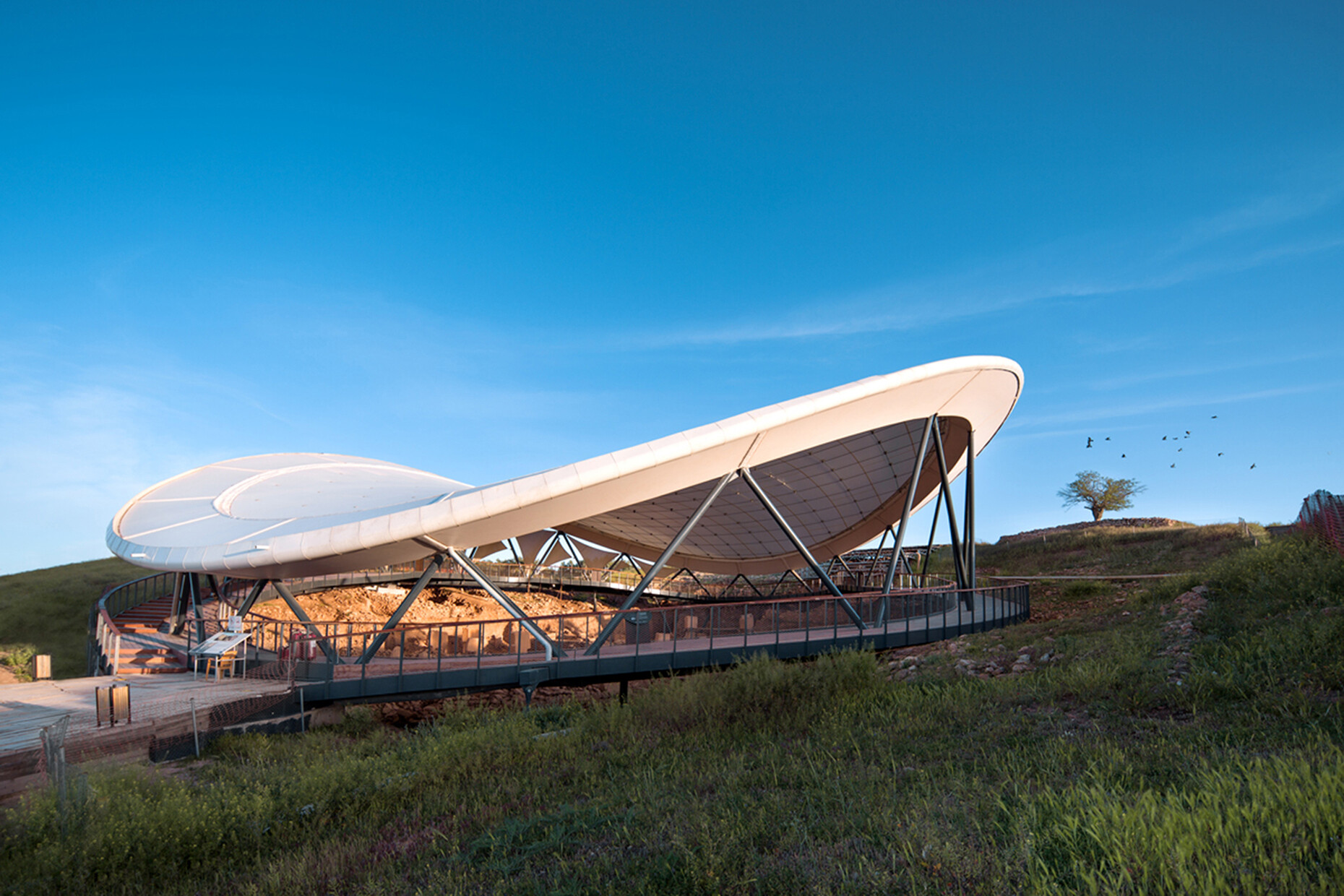 Offensichtlich und unverkleidet kann man das Tragwerk wie seine Funktion und somit auch die Arbeit der TragwerksplanerInnen zudem bei einem Bauwerk im fernen Anatolien beobachten, das 2019 mit dem Rudolf-Finsterwalder Ingenieurbaupreis ausgezeichnet wurde. Man könnte sagen, dass es sich um "Bauen im Bestand" handelt, denn das Stahldach der Ausgrabungsstätte am Göbekli Tepe schützt den ältesten bekannte Ritualbau der Menschheit, ein Stelenfeld aus der Zeit 10.000 bis 8.000 vor Christus (mit kleyer.koblitz.letzel.freivogel Architekten). Bei dem filigranen Seilnetzkonstrukt kam es darauf an, den archäologischen Untergrund so wenig wie möglich zu beeinträchtigen, und so balanciert das 39 x 45 Meter messende Dach auf nur neun Gründungspunkten. Den besonderen Anforderungen an Transportierbarkeit und schnelle Montage wurden die IngenieurInnen mit dem ultraleichten Seilnetz-Membrandach gerecht. Mit seiner an Stapelchips erinnernden dynamischen Form fügt sich das Dach in die hügelige Landschaft.