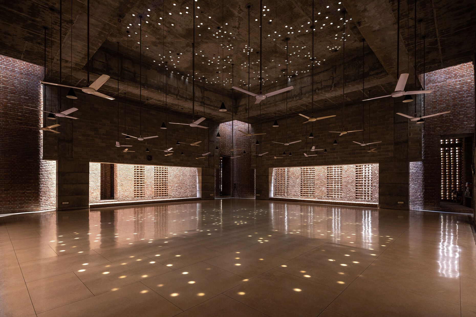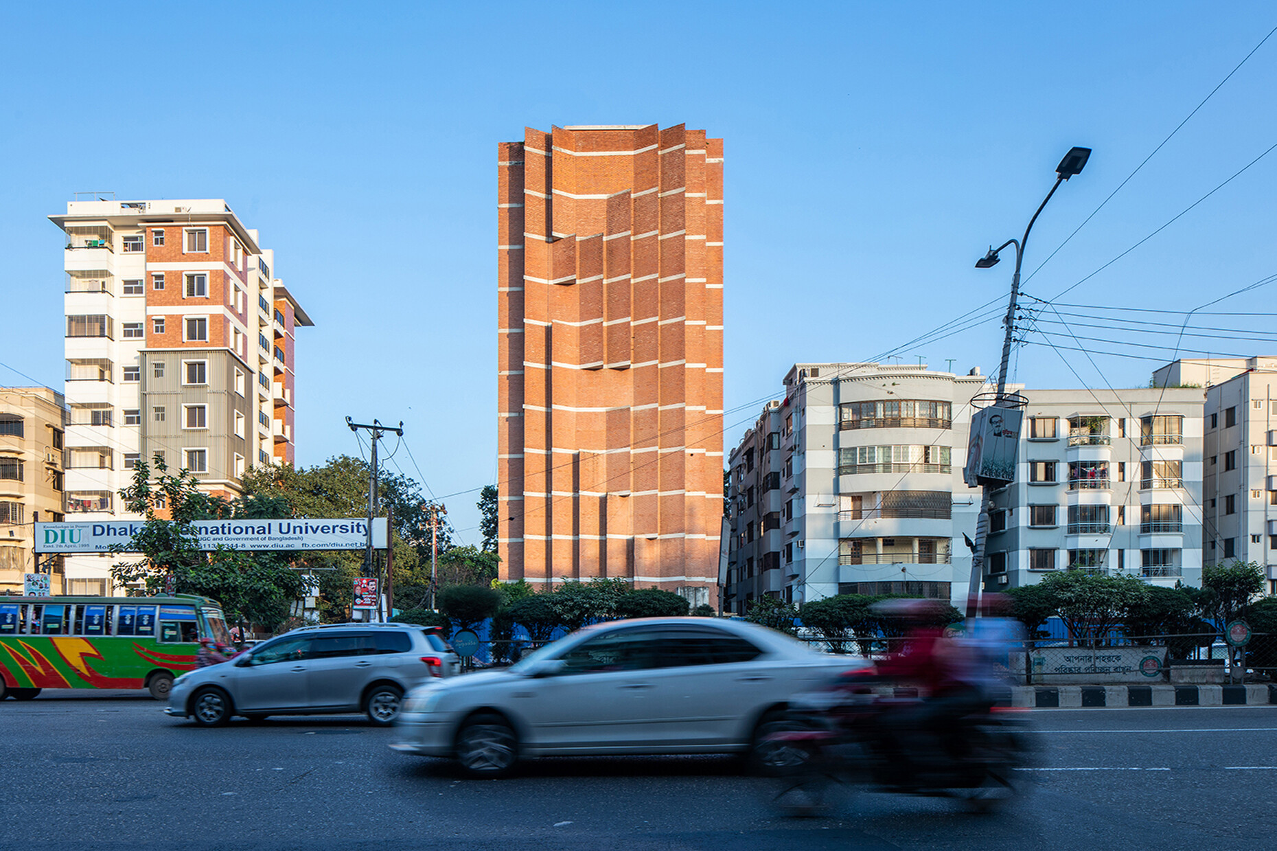 Neben dem Zusammenspiel aus Licht und Raum achtete Marina Tabassum auch auf ein angenehmes Raumklima in der Bait-Ur-Rouf-Moschee. So sorgen die Raumschichten im Zusammenspiel mit der perforierten Ziegelfassade und den nach oben offenen Lichtschächten für eine natürliche Durchlüftung. Dabei verzichtet sie bewusst auf technische Lösungen: "Ein Gebäude muss ohne künstliche Hilfsmittel atmen können. Die Durchlässigkeit der Gebäudehülle, offene Höfe und lange Veranden sind brillante Traditionen aus der Zeit vor der Klimaanlage, die heute noch ihre Gültigkeit haben", erklärt sie. Das Thema eines an das regionale Klima angepassten Bauens findet sich auch in anderen Projekten der Architektin, wie dem AR Tower, einem achtgeschossigen Bürobau im Westen Dhakas, der 2022 fertig gestellt wurde. Der expressive Baukörper, der als eine Art Landmarke in das heterogene Stadtviertel hineinwirkt, weist eine Fassade aus Backstein auf, die durch vertikale Fensteröffnungen gegliedert ist. Ein horizontaler Sonnenschutz und diagonale Lamellen ermöglichen Licht und Schattenspiele im Verlauf des Tages. Gleichzeitig reduzieren sie zusammen mit den beweglichen Glasöffnungen die Wärmeentwicklung im Innern. Ein ähnliches Konzept verfolgt das Projekt Comfort Reverie, ein zwölfstöckiger Wohnturm, der sich ebenfalls in Dhaka befindet. Die rhythmisch aufgefächerte Backsteinfassade ist so konzipiert, dass die Fensteröffnungen vor der tiefstehenden Westsonne geschützt sind und die Luft im Gebäude zirkulieren kann.