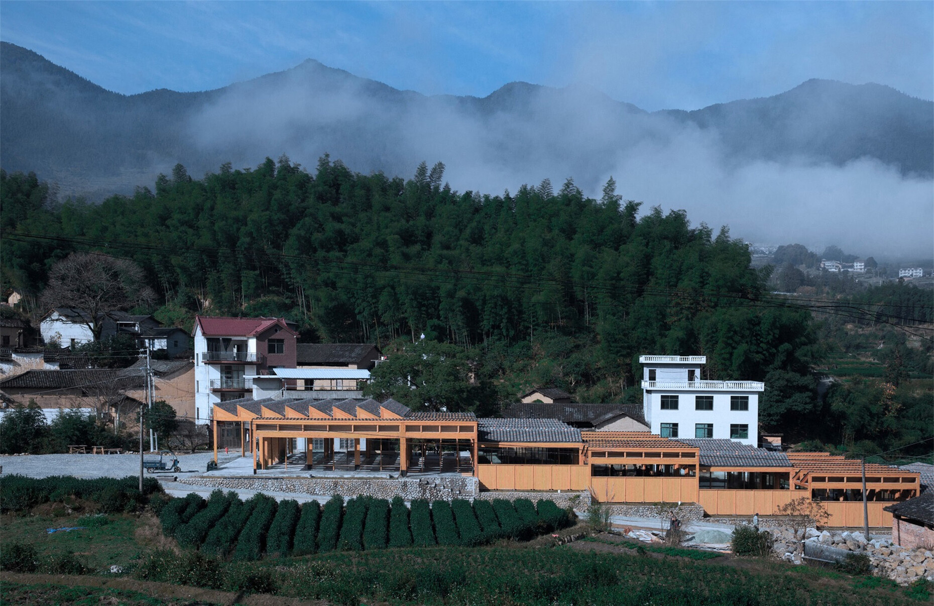 Ein Beispiel ist die Renovierung und der Ausbau einer Steinbrücke aus den 1950er Jahren, die nun die beiden Dörfer Shimen und Shimenyu verbindet. Dazu entwarf Xu Tiantian eine Überdachung aus Holz, in deren Mitte sich ein mit Bäumen bepflanzter Platz aufweitet. Die Brücke dient nicht nur als infrastrukturelle Notwendigkeit, sondern auch als Ort des Austauschs, an dem sich die BewohnerInnen beider Dörfer treffen können. Gleichzeitig bezieht sich der Entwurf auf die traditionellen mit Pavillons bestückten Wind- und Regen-Brücken, die Schutz vor dem Wetter bieten sollen. Das Thema des Zusammenkommens kennzeichnet viele Projekte in Songyang – wie etwa das Bambustheater, dass Xu Tiantian für das Dorf Hengkeng entwarf. Eine Freiluftbühne wird hier von einer Bambuskuppel gekrönt, die scheinbar aus der umgebenden Natur herauswächst. Für deren Form und Konstruktion ließ sich die Architektin von einer Schriftrolle des Malers Qiu Ying aus dem 16. Jahrhundert inspirieren. Ein weiteres Beispiel für die Verwendung des traditionellen Baumaterials sind die Bambuspavillons in der Teeplantagenregion Damushan, die auch das erste Projekt der Architektin in Songyang waren. In unterschiedlicher Größe am Rand der Teeplantagen platziert, fassen sie die Kulturlandschaft ein und können für Veranstaltungen oder als Aussichtspunkt genutzt werden.
