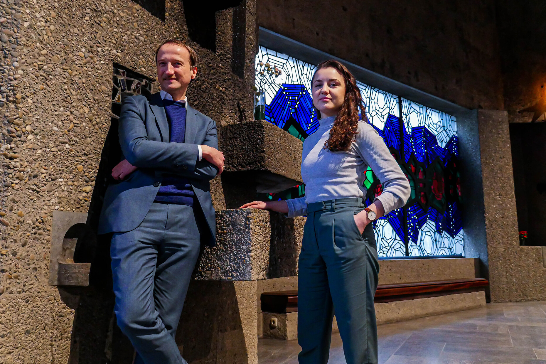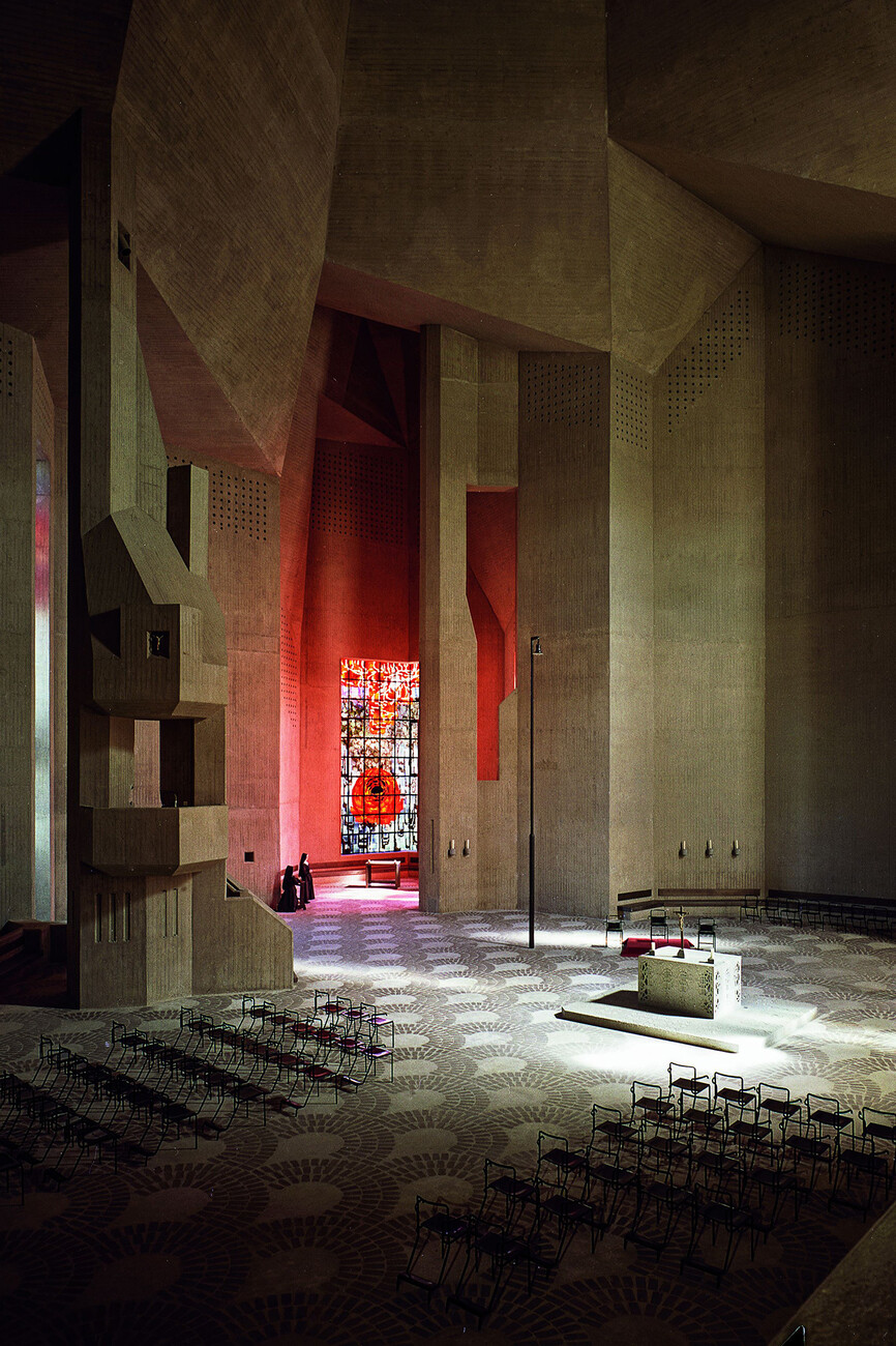 Wir treffen die Kuratoren der Ausstellung "Böhm 100: Der Beton-Dom von Neviges", Miriam Kremser und Oliver Elser, in der Kirche St. Ignatius im Frankfurter Westen. Es ist ein gräulicher Wintertag. Beim Betreten der Kirche umhüllt uns kühle Dunkelheit. Am Taufbecken entlang führen Treppen zu dem nur wenig helleren Kirchenraum, dessen farbige Glasfenster die Augen zum Flackern bringen. Die Frankfurter Kirche ist eng verwandt mit der Wallfahrtskirche Maria, Königin des Friedens in Neviges, die im Mittelpunkt der Ausstellung des DAM steht. Beide Bauten wurden von Gottfried Böhm in den 1960er Jahren entworfen, St. Ignatius 1964, Neviges 1968 eingeweiht. Und es gibt auch architektonisch zahlreiche Parallelen. Zum Interview sind wir also umgeben von der Böhm’schen Architektursprache.