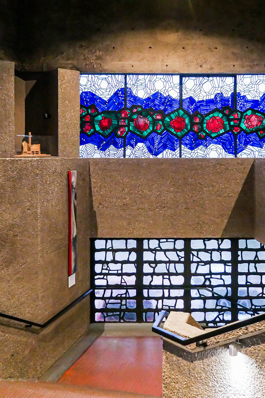 Beim Stichwort Oberflächen streicheln wir immer wieder andächtig über die unterschiedlichen Texturen des Betons an Wänden und Brüstungen. Wir gehen entlang der gefärbten Fenster, wo Oliver Elser und Miriam Klenser uns auf eine Besonderheit hinweisen: