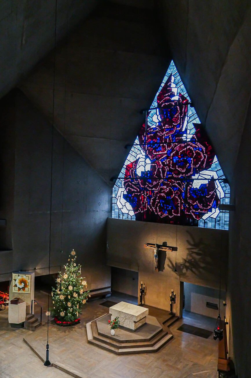 Miriam Kremser: Das gefaltete Betondach ist ein Element, das hier wie auch in diversen anderen Kirchen von Gottfried Böhm zu finden ist. Aber man muss sagen: Keines reicht in seiner Komplexität an das von Neviges heran. Auch bei der Fenstergestaltung kann man viele Parallelen entdecken, doch die Farbigkeit unterscheidet sich immens! In St. Ignatius haben wir viel dunklere, - violette und weinrote – Töne. In Neviges kann man die Farben und ihre Leuchtkraft geradezu als poppig beschreiben.