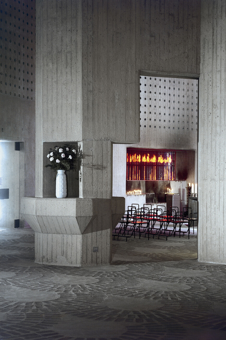 Oliver Elser: Es steckt eine unglaubliche Materialsensibilität in beiden Kirchen: Die Oberflächen des Betons werden unterschiedlich behandelt und kombiniert, immer wieder Gegenakzente platziert. So wie hier der Altar aus weißem Marmor – gewaltige Blöcke, die präzise, aber sichtbar gefügt werden.