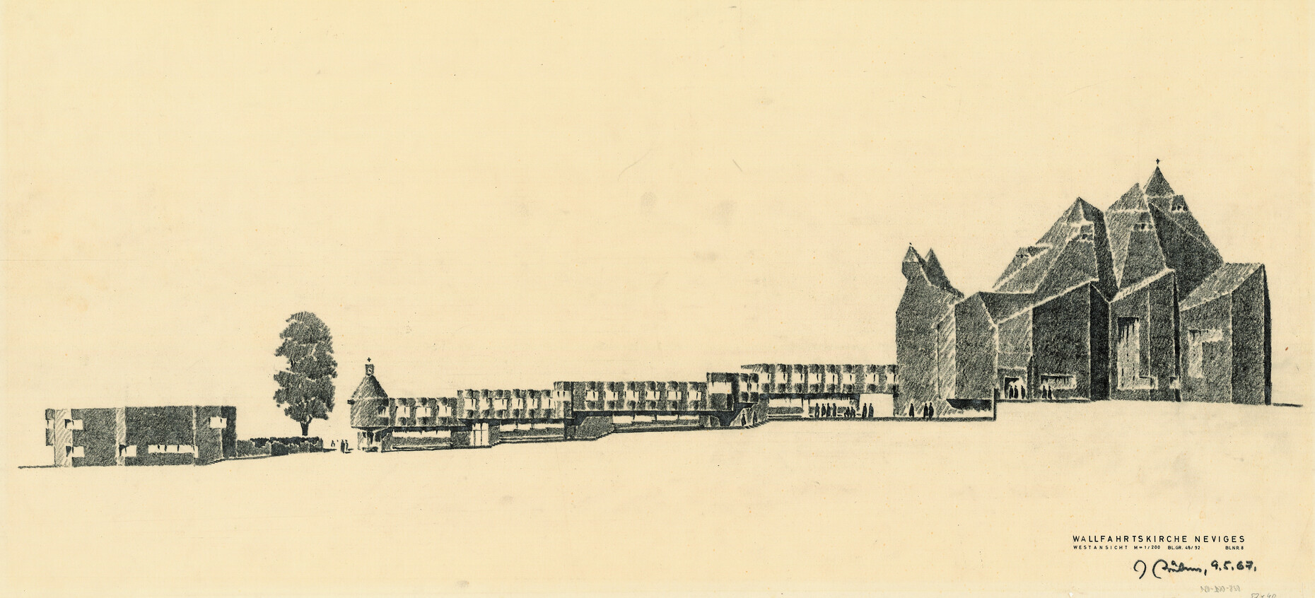 Miriam Kremser: Bereits 2006 hat das Deutsche Architekturmuseum eine umfassende Gottfried-Böhm-Ausstellung gezeigt. Doch den 100. Geburtstag wollten wir natürlich erneut feiern. Die Wallfahrtskirche ist ganz sicher eines der herausragendsten Projekte Gottfried Böhms. Und da wir den Vorlass des Architekten in unserem Archiv verwahren, können wir Aspekte des Bau beleuchten, die so noch nicht in einer Ausstellung thematisiert wurden.