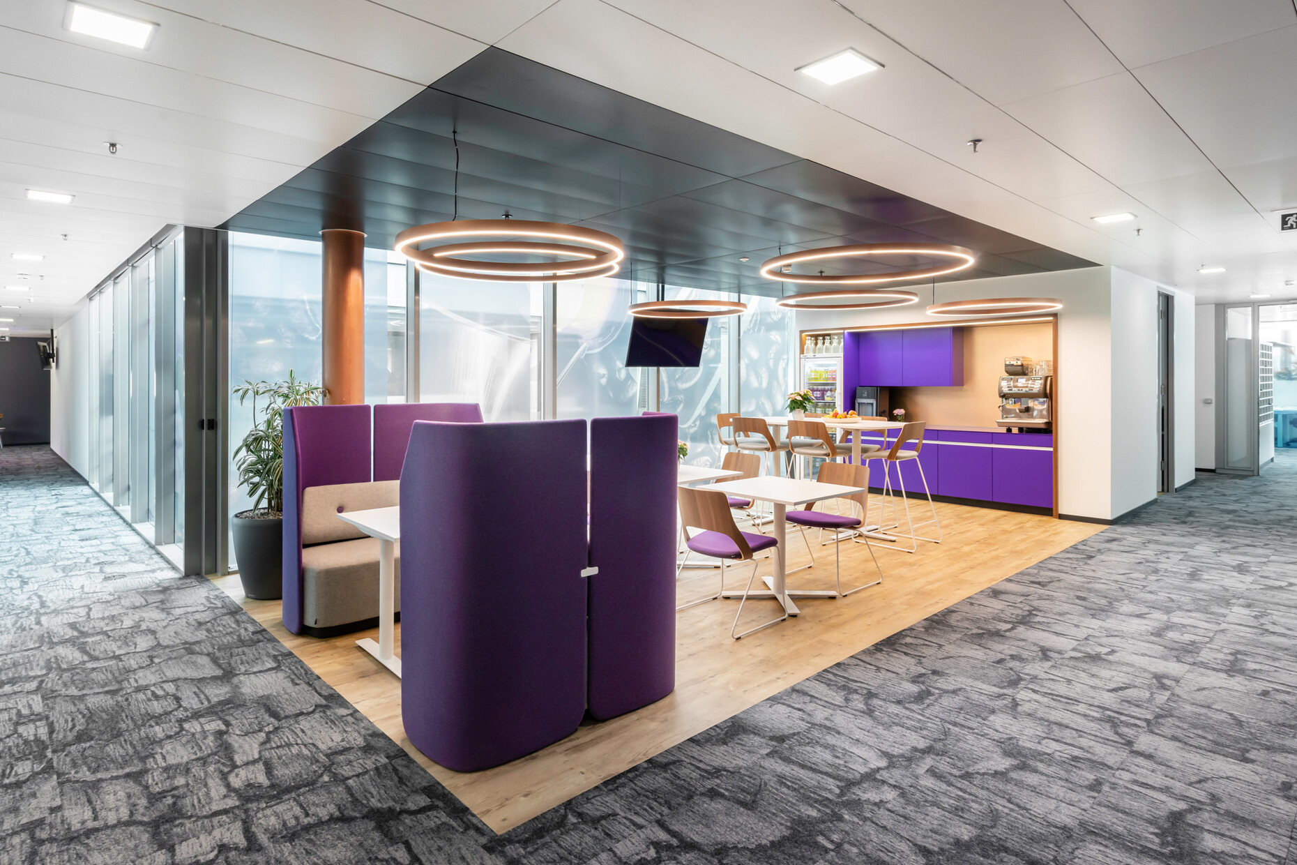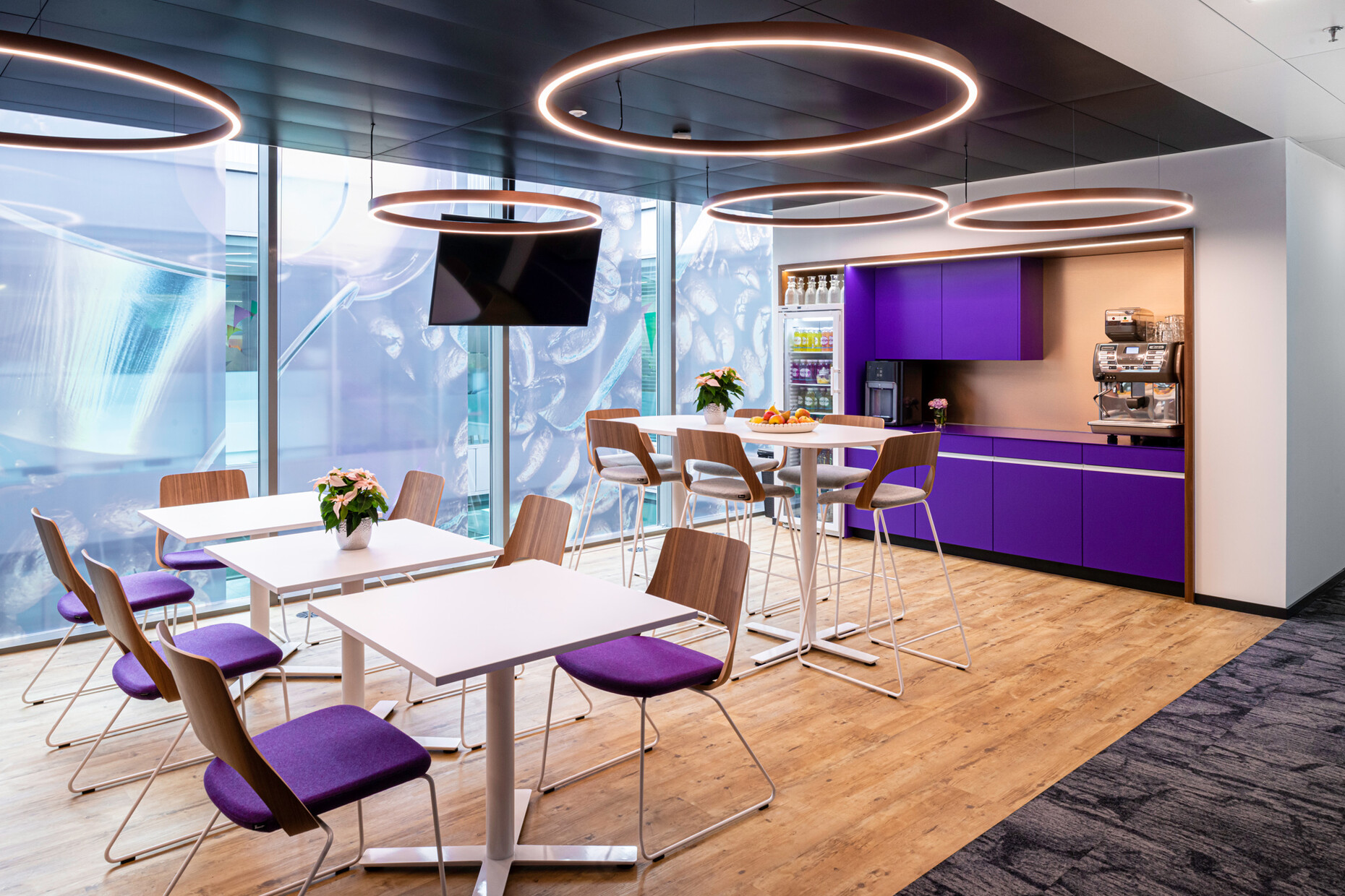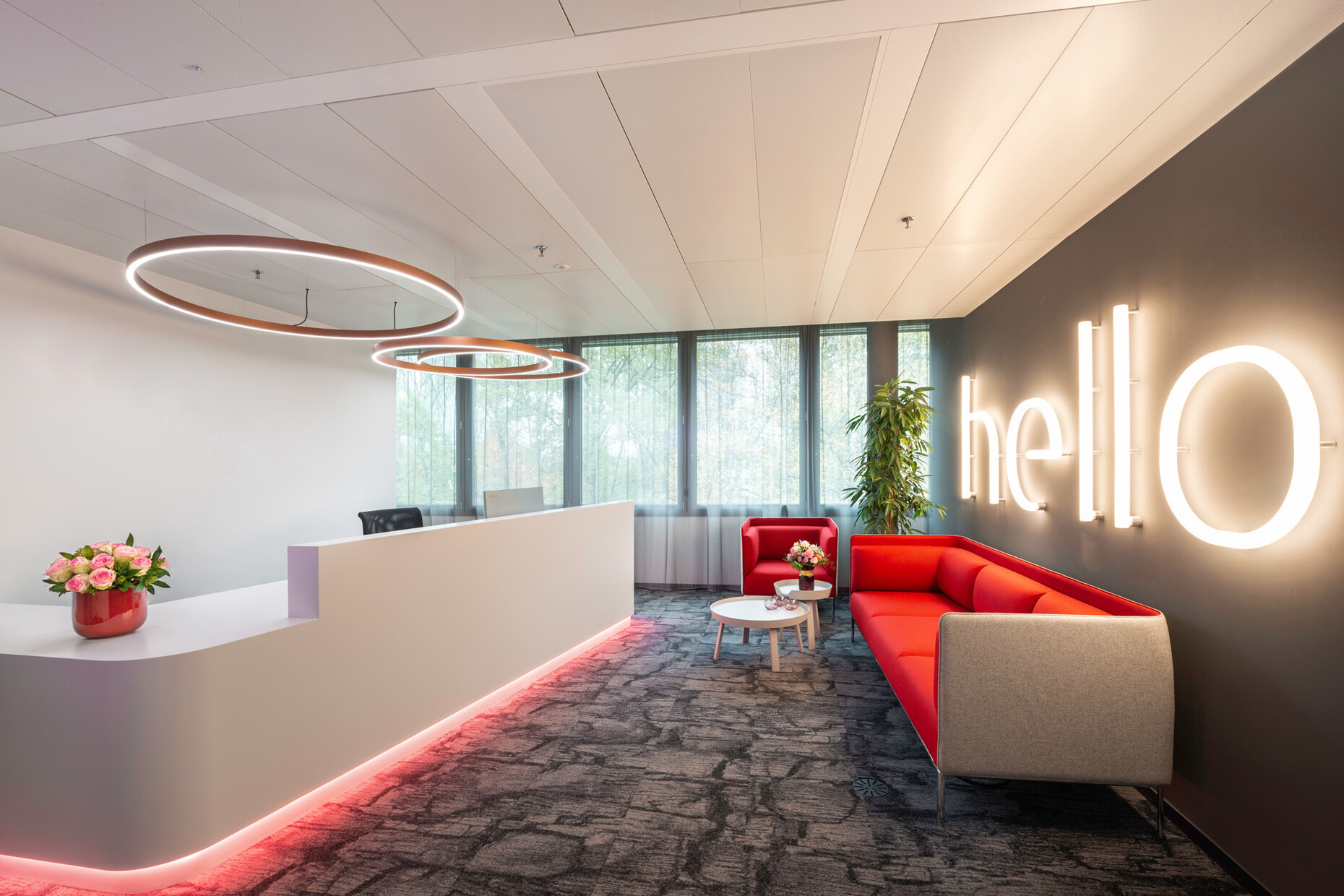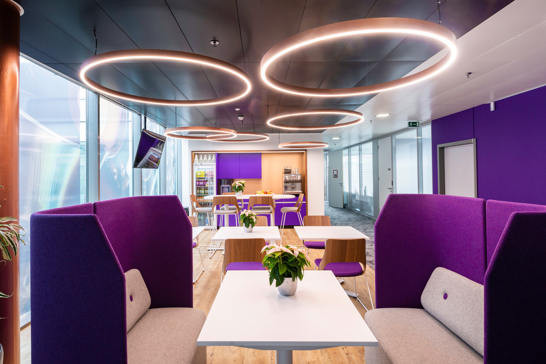 Das beginnt schon im Eingangsbereich, in dem der Besucher mit dem homogen leuchtenden "hello" der "Alphabet of Light"-Buchstaben begrüßt wird. Für die Verbesserung der Raumakustik in den Büroräumen wurde die Leuchte "Eggboard" aus der Serie "The Acoustic Light" ausgewählt. Durch ihre Materialität und die besondere Oberflächenstruktur absorbiert sie die umgebende Geräuschkulisse speziell im Frequenzbereich der menschlichen Stimme. Die Deckenleuchte "Everything" sorgt zusätzlich für eine zurückhaltende und effiziente Allgemeinbeleuchtung. Um den Meetingräumen ein stimulierendes, effizientes Licht zu verleihen, entschieden sich die Architekten für die Pendelleuchte "A.24 Circular". Sie kommt auch in den verschiedenen Kollaborationszonen, der Cafeteria und über dem Empfangstresen zum Einsatz und stellt einen dekorativen Kontrast zur Beleuchtung der Arbeitsplätze dar. Da ihre kreisrunde Form an das British Telecom Logo erinnert, passt sie auch perfekt zur Corporate Identity des Telekommunikationsunternehmens.