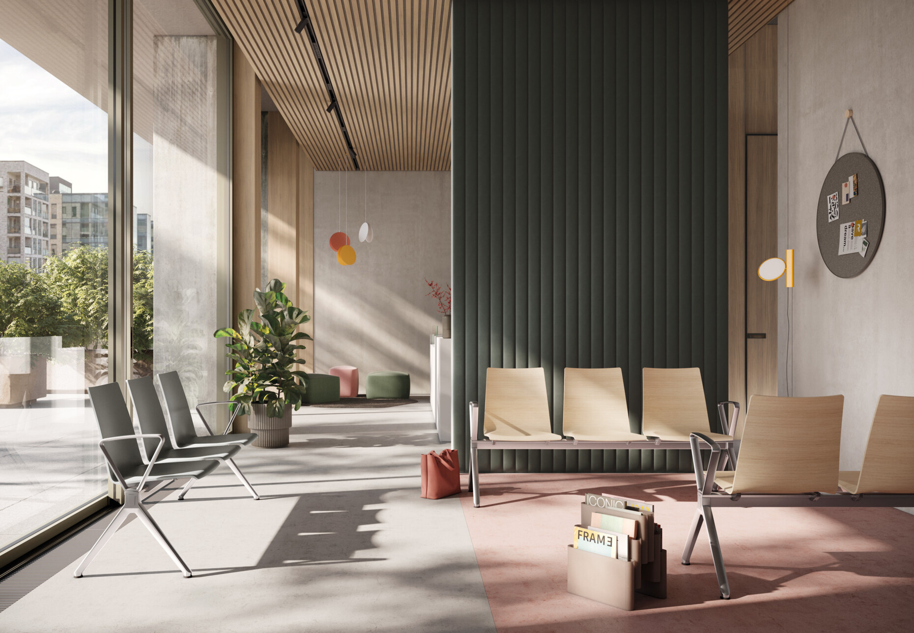 Wartebereiche werden dank der Kooperation von Roland Schmidt Design einladend: "wait" ist mit bis zu fünf Sitzen und unterschiedlichen Schalentypen pro Bank wählbar und kann mit einer großen Bandbreite an Gestaltungsoptionen in Material wie Farbe für jede Umgebung angepasst werden.
