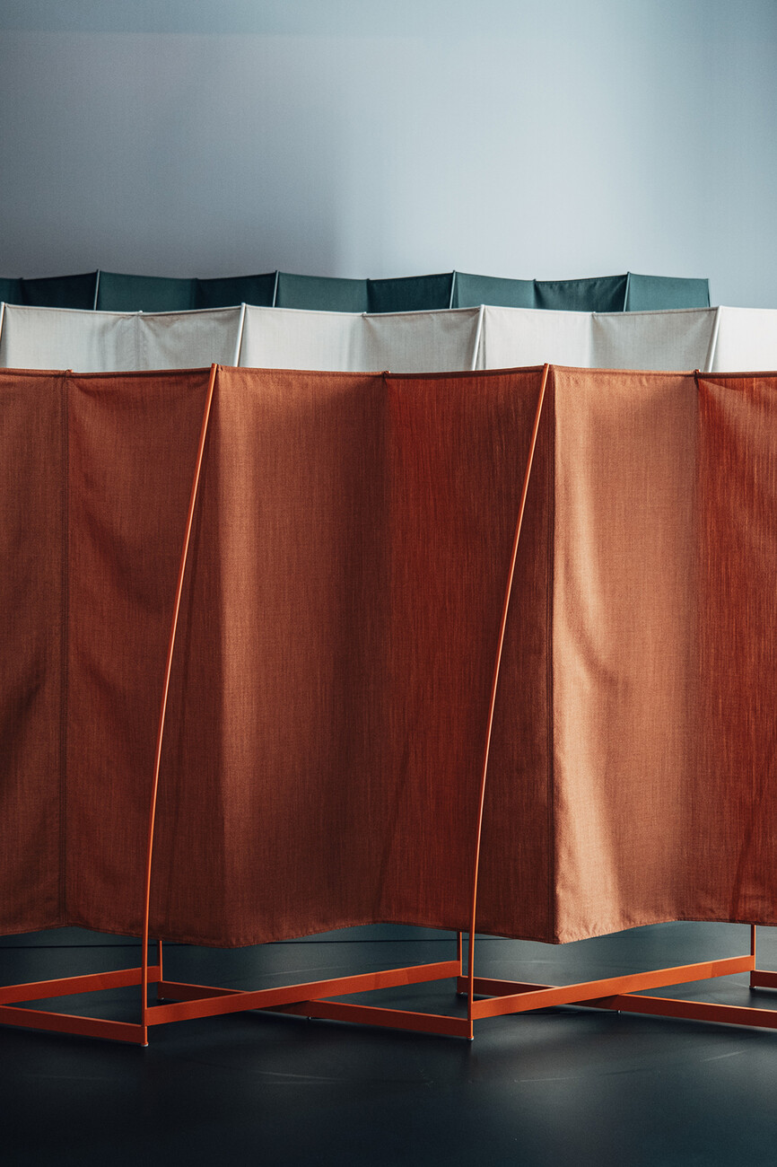 Aurel Aebi: Brunner hat die Idee extrem schnell umgesetzt, bis in die kleinsten Details. Wir konnten so ein raumbildenes Möbel entwickeln, das einfach zu handhaben ist. Die Komplexität liegt eher im Inneren, diese ist von außen nicht wirklich sichtbar. "Die Schönheit des Kerns" nenne ich das. Besonders ist auch, dass wir in der Gestaltung das Flair der Romandie aufgreifen konnten, die französischsprachige Schweiz, die Frankreich, Italien und Deutschland verbindet. Nur durch ein ideales Zusammenspiel entsteht ein perfektes Ergebnis und das gilt auch für "foild": Dynamisch, leicht sowie präzise und bis in die Details durchdacht. Dank des Scherengitters kann der Raumgestalter für den jeweiligen Bedarf entfaltet und wieder verstaut werden. Das Textil wird einfach auf die Struktur gehängt, nichts ist verschraubt oder verklebt, ganz im Sinne der Nachhaltigkeit. Wir als DesignerInnen und ArchitektInnen müssen uns angewöhnen, jeden Entwurf zyklisch in Materialisierung und Entmaterialisierung zu denken.
