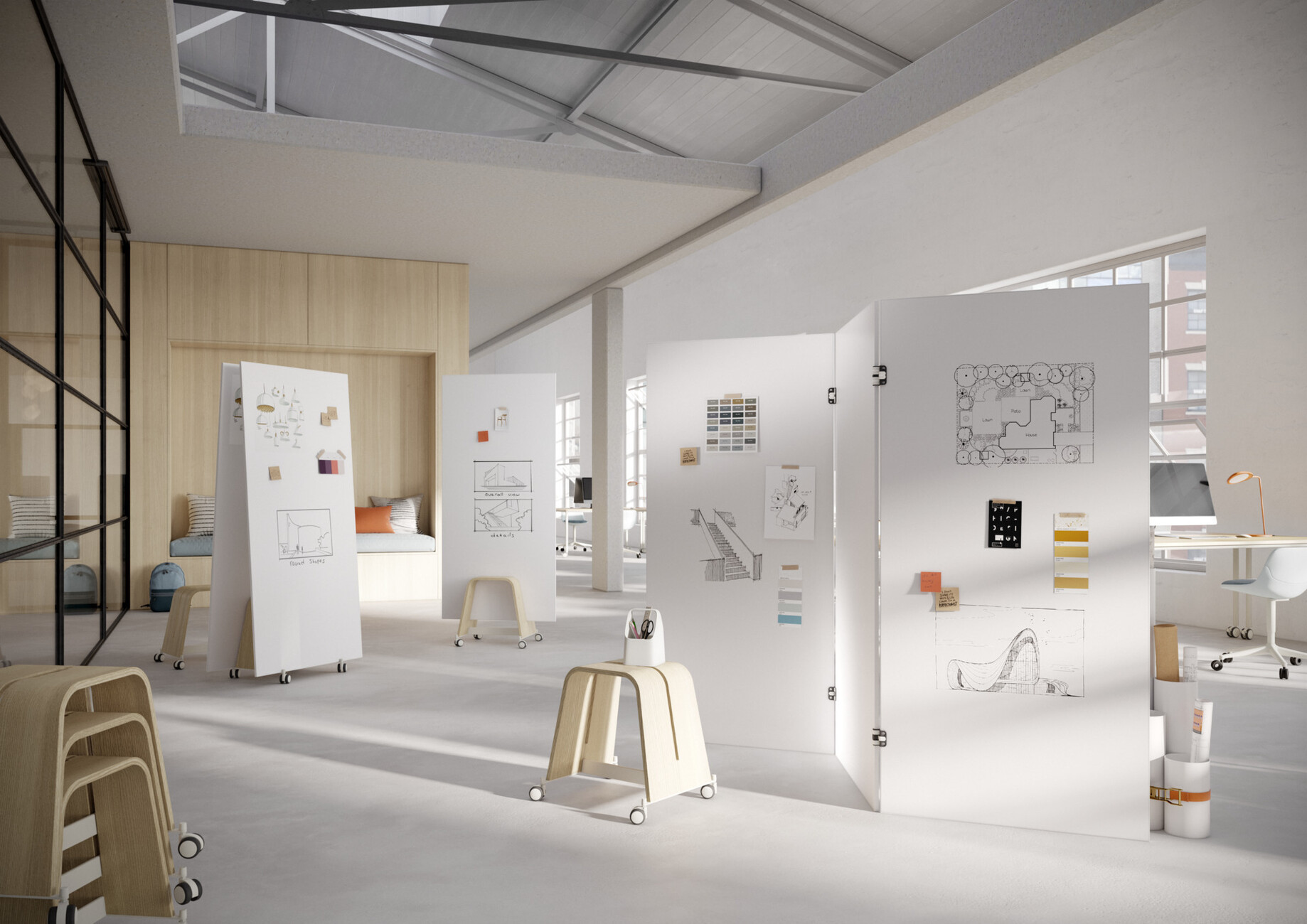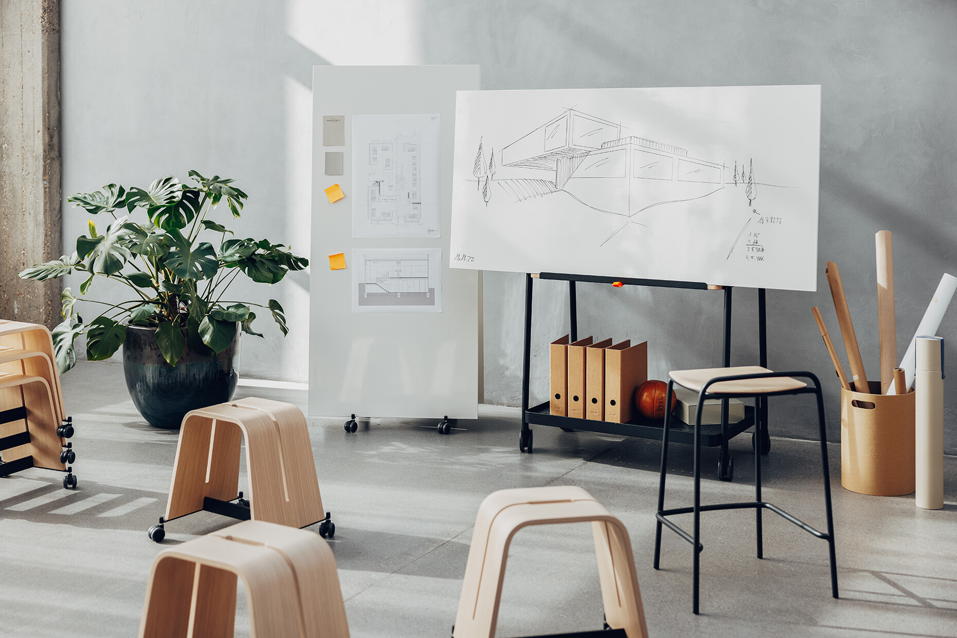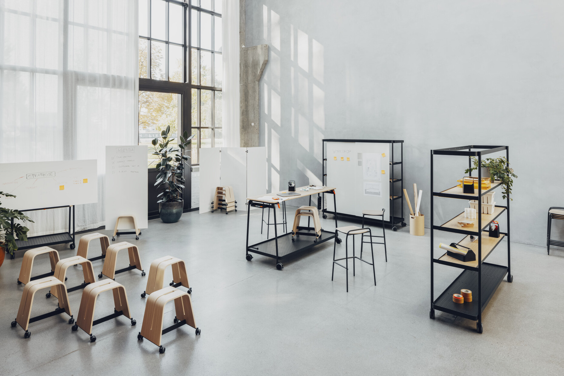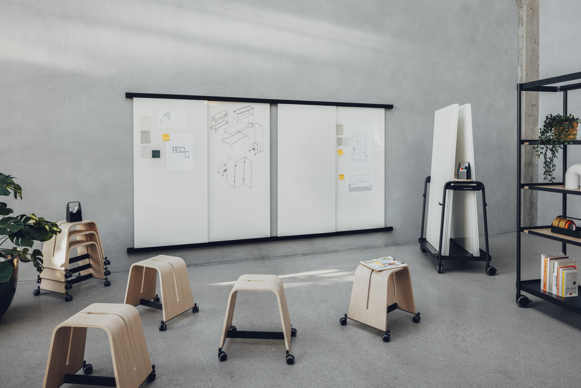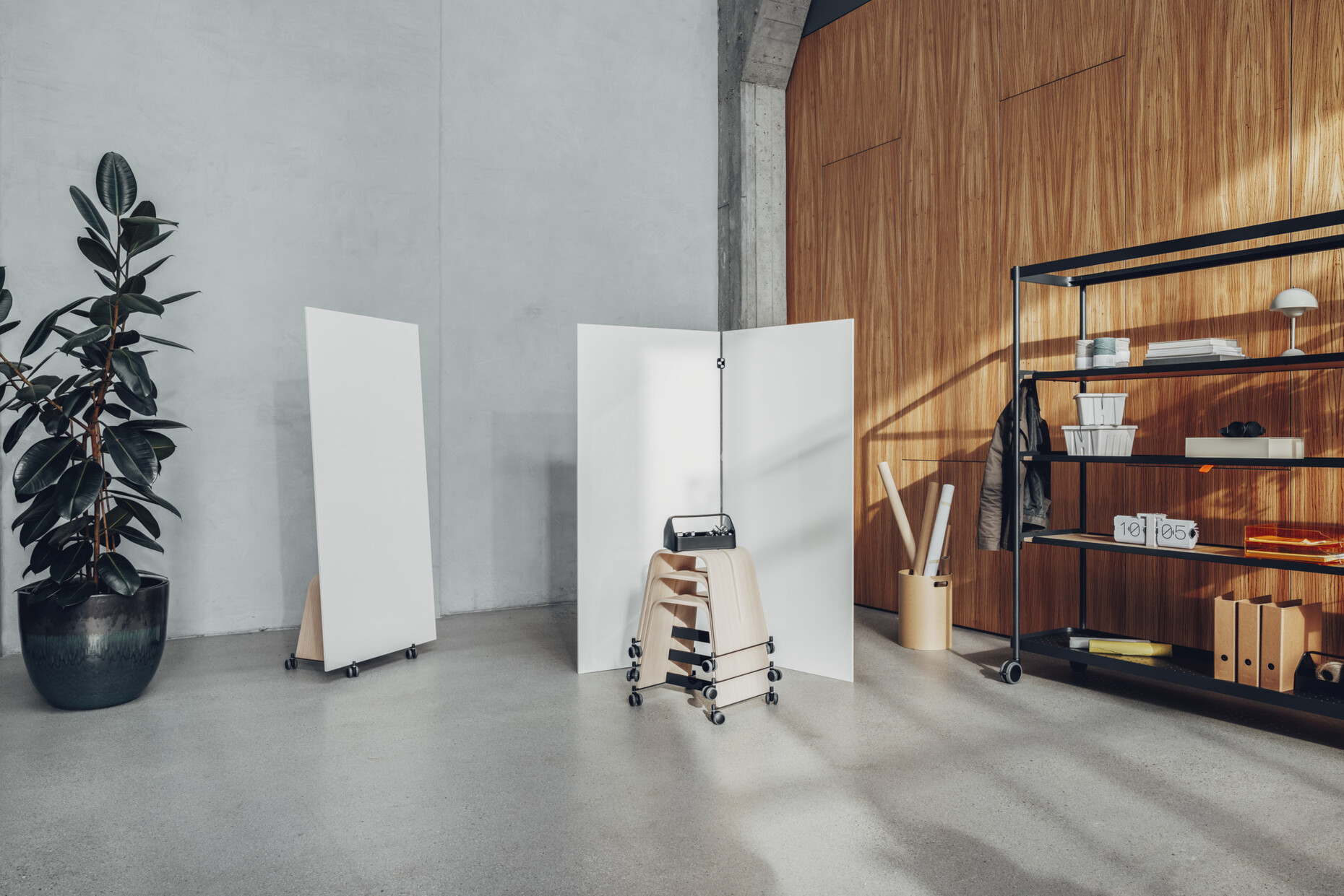 Wisch und weg – was als Werbeslogan manche Kindheit geprägt hat, wünscht man sich oft genug auch nach mancher Sitzung: Die Besprechung ist vorbei, die KollegInnen sind zurück am Platz, die Ideen sprudeln – nur das Whiteboard muss noch gewischt werden, Tische, Stühle wollen zurechtgerückt und Ablagen verräumt werden. Wertvolle Zeit geht verloren, die mit Aufräumen verbracht wird. Und vor allem: Was tun mit den ganzen wichtigen Stichwörtern auf den Whiteboards? Mühsam abfotografieren und digitalisieren? Diese Beobachtung hat auch das preisgekrönte Berliner Design-Duo Oliver Deichmann und Blasius Osko gemacht – und eine Lösung dafür entwickelt. "Wir haben untersucht, wie innovative Start-ups arbeiten und wie der agile Office-Alltag in modernen, internationalen Unternehmen aussieht. Die Ideenfindung im kreativen Workshop war eine gemeinsame Schnittmenge – und überall gab es dasselbe Problem: Nach dem Meeting mussten die Whiteboards gesäubert werden. Wir haben uns also gefragt, wie sich in dieser gewünscht flexiblen Szenerie Ideen sichern lassen. So sind wir auf ultraleichte Whiteboards zum Mitnehmen und Austauschen gekommen." Entstanden ist daraufhin die multifunktionale Serie "boards" für und mit Brunner, ein Werkzeugkasten, der zur agilen Projektraumgestaltung dient. Es ist nicht die erste Zusammenarbeit, denn die Berliner Designer haben für Brunner bereits die Sitzlandschaft "plot", den falt- wie rollbaren Stehtisch "pivot" sowie den ergonomischen Bürostuhl "dress" erdacht.