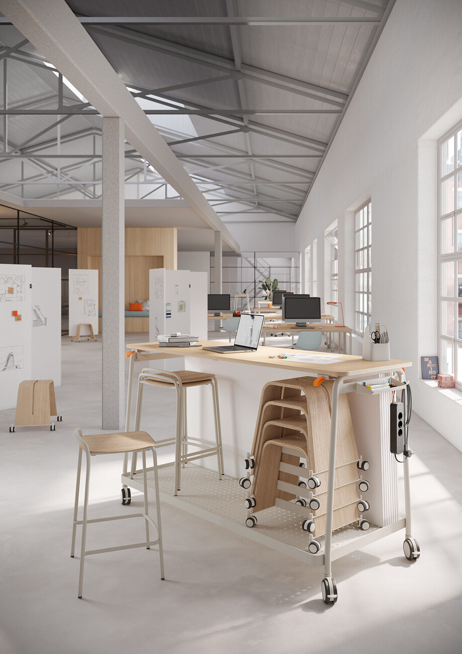 Die grundlegende Frage für die jüngste Kreation "boards" ist: "Warum nehmen wir die wichtigen Ideen nicht einfach mit?" Zentrales Element und Namensgeber der Serie bot daher das Whiteboard: Die Brunner "boards" sind leicht und flexibel. Sie werden von Möbelstücken und Zubehör begleitet, die Stauraum, Sitz- und Arbeitsplätze bieten. An den Arbeits- und Stehtischen mit NanoTec-, Eichenfurnier- oder HPL-Platte kann man arbeiten, wie man möchte. Dank arretierbarer Rollen gleiten sie problemlos und können nach Belieben fixiert oder bewegt werden. Genauso mobil sind das Regal und die stapelbaren Hocker. Hinzu kommt ein Lagerwagen, auf dem ganze 16 Whiteboards Platz finden. Alle Möbelstücke können zur Staffelei für die beidseitig beschreibbaren Whiteboards umfunktioniert werden.