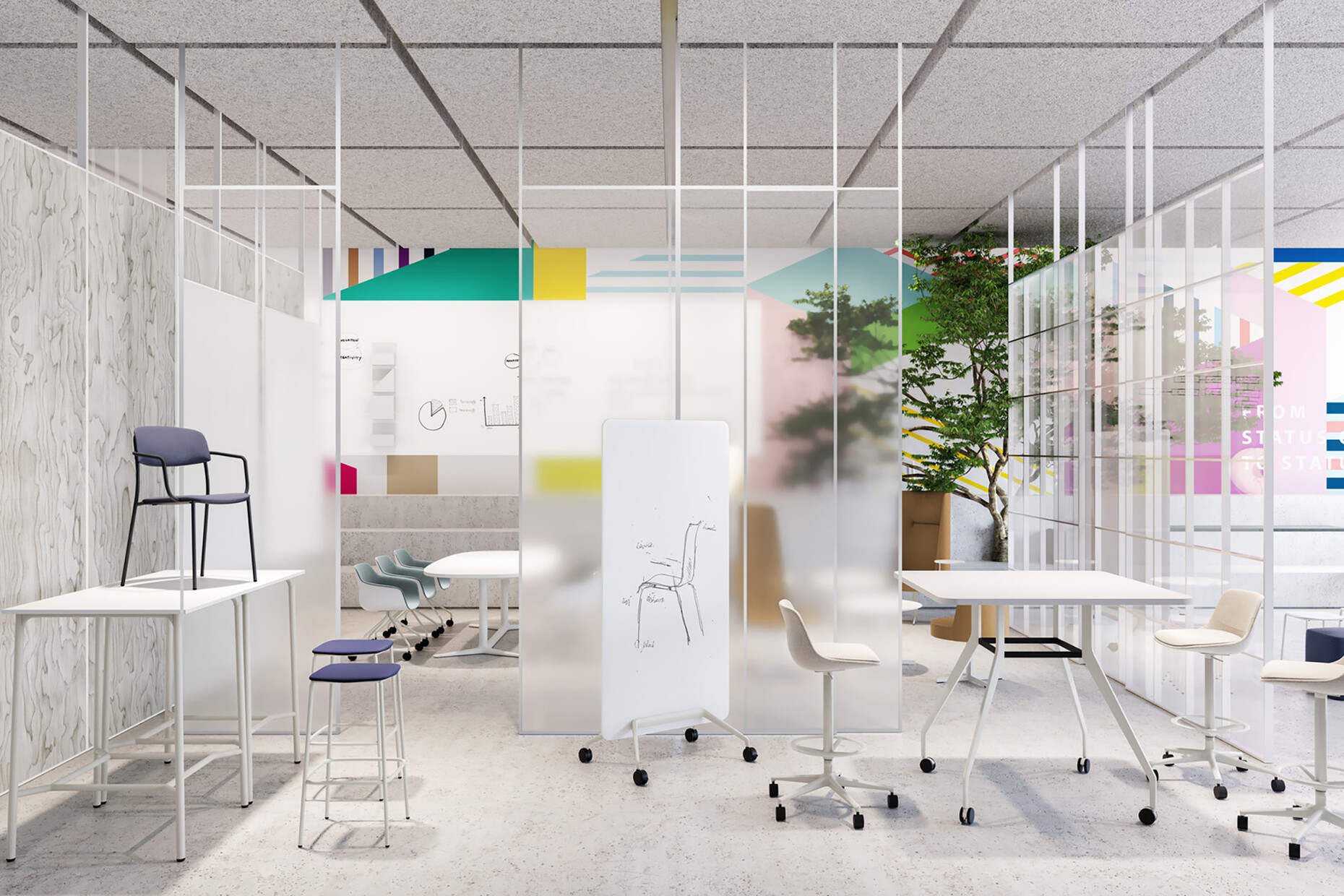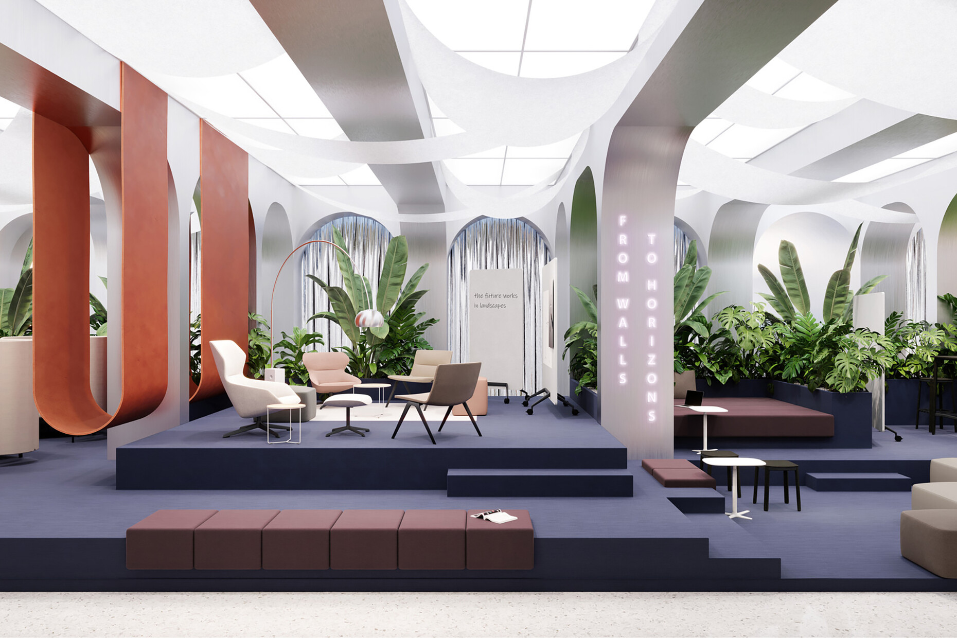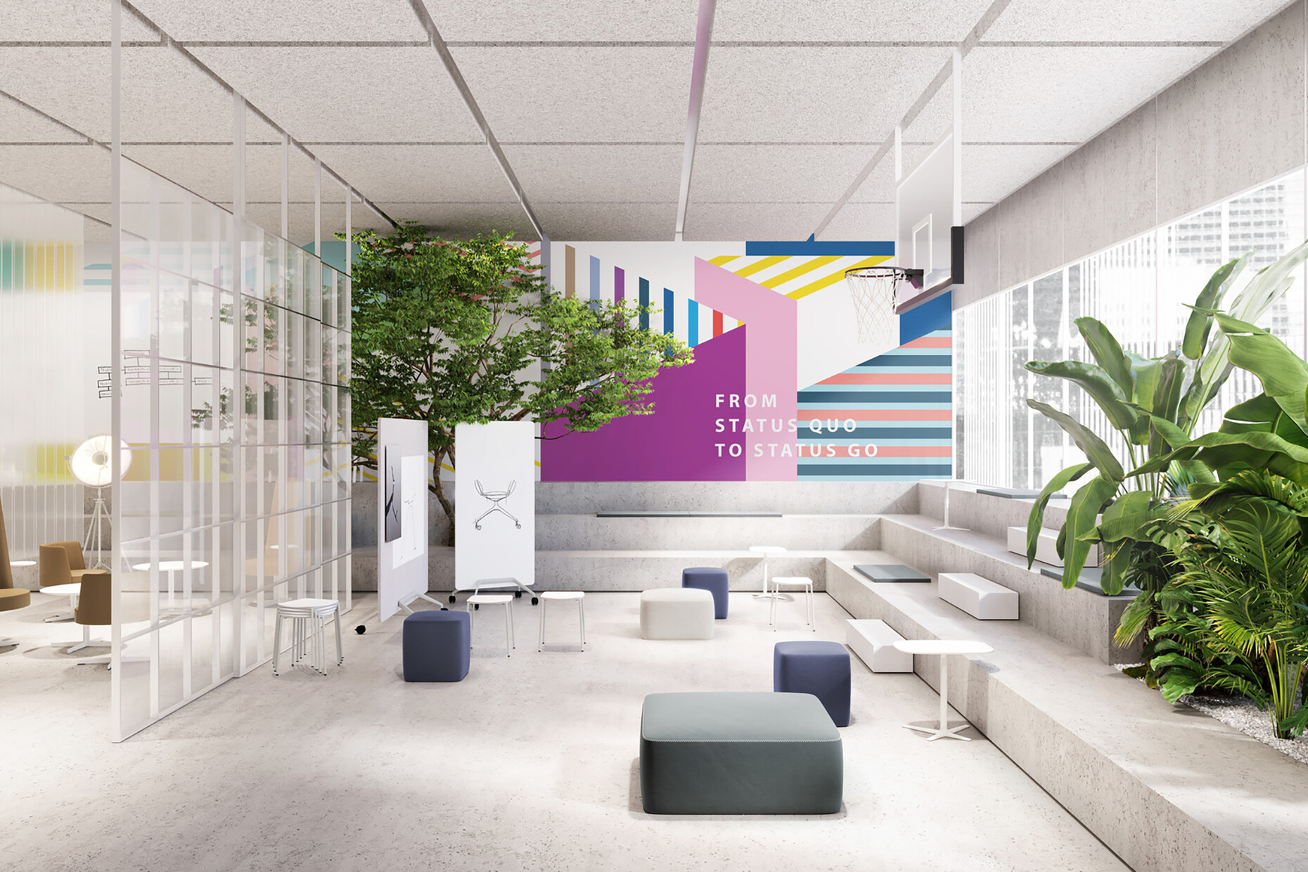 Dafür arbeitet Brunner mit fünf Thesen, die den Kulturwandel, Strukturwandel und ökologischen Wandel in der heutigen Arbeitswelt verdeutlichen sollen. Die erste These "From company to community" zeigt auf, wie aus abgesteckten Bürofeldern kommunikative Begegnungsinseln werden können. Ein Raumszenario dazu ist die "Cafeteria der Zukunft", die zur Stärkung von Körper, Geist und Gemeinschaft in Form einer entspannten Atmosphäre beiträgt. In der zweiten These "From status quo to status go" beschäftigt sich Brunner mit der digitalen Transformation in Unternehmen, die auch spezifische Raumkonzepte erfordert: So stehen beim agilen Workshop der Zukunft Funktionalität, Anpassungsfähigkeit und Veränderbarkeit im Vordergrund. Zum Einsatz kommen hier modulare Bauelemente, mit denen sich flexible Tech-Räume umsetzen lassen. Mit der dritten These "From address to attitude" skizziert Brunner eine Unternehmenskultur, bei der Arbeitswelten das individuelle Werteverständnis einer Marke widerspiegeln. Das zeigt sich in einer neuen Meetingkultur, wo Räume einen formellen wie auch informellen Austausch erlauben und gleichzeitig Platz für eine konzentrierte Zusammenarbeit bieten. Die vierte These "From walls to horizons" illustriert die Möglichkeiten offener Bürolandschaften und deren Auswirkungen auf Raumgestaltung und Möbelauswahl.