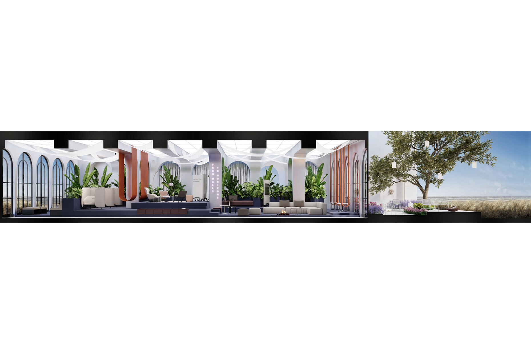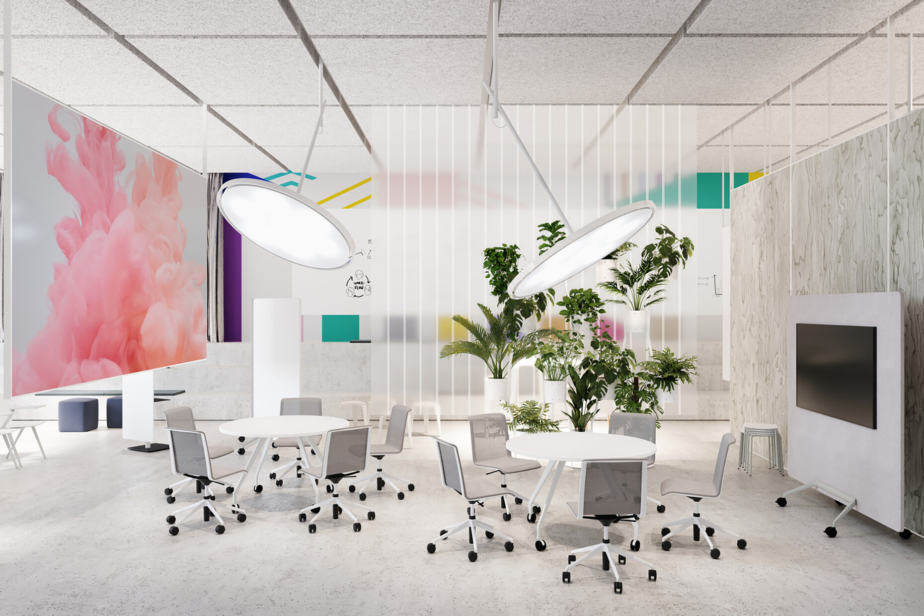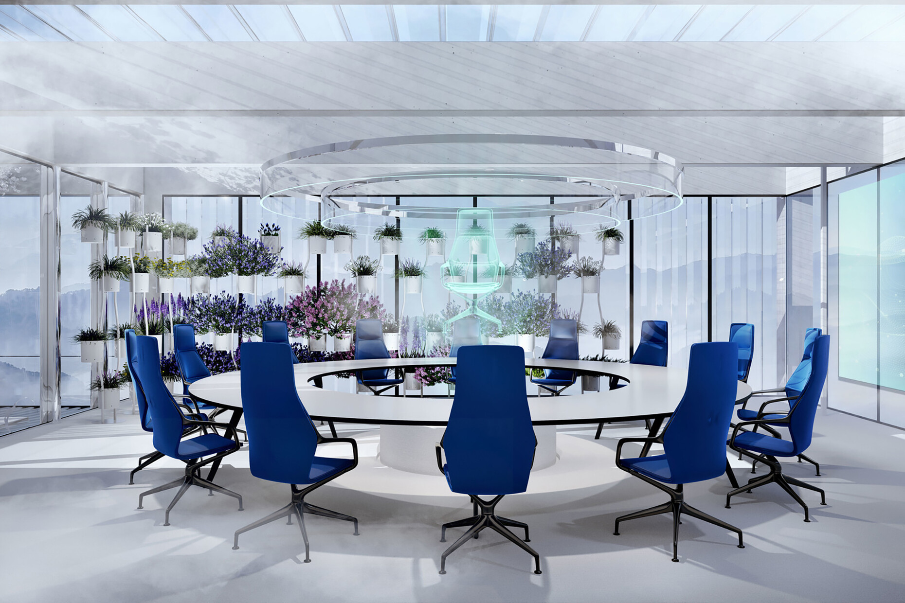 Dafür arbeitet Brunner mit fünf Thesen, die den Kulturwandel, Strukturwandel und ökologischen Wandel in der heutigen Arbeitswelt verdeutlichen sollen. Die erste These "From company to community" zeigt auf, wie aus abgesteckten Bürofeldern kommunikative Begegnungsinseln werden können. Ein Raumszenario dazu ist die "Cafeteria der Zukunft", die zur Stärkung von Körper, Geist und Gemeinschaft in Form einer entspannten Atmosphäre beiträgt. In der zweiten These "From status quo to status go" beschäftigt sich Brunner mit der digitalen Transformation in Unternehmen, die auch spezifische Raumkonzepte erfordert: So stehen beim agilen Workshop der Zukunft Funktionalität, Anpassungsfähigkeit und Veränderbarkeit im Vordergrund. Zum Einsatz kommen hier modulare Bauelemente, mit denen sich flexible Tech-Räume umsetzen lassen. Mit der dritten These "From address to attitude" skizziert Brunner eine Unternehmenskultur, bei der Arbeitswelten das individuelle Werteverständnis einer Marke widerspiegeln. Das zeigt sich in einer neuen Meetingkultur, wo Räume einen formellen wie auch informellen Austausch erlauben und gleichzeitig Platz für eine konzentrierte Zusammenarbeit bieten. Die vierte These "From walls to horizons" illustriert die Möglichkeiten offener Bürolandschaften und deren Auswirkungen auf Raumgestaltung und Möbelauswahl.