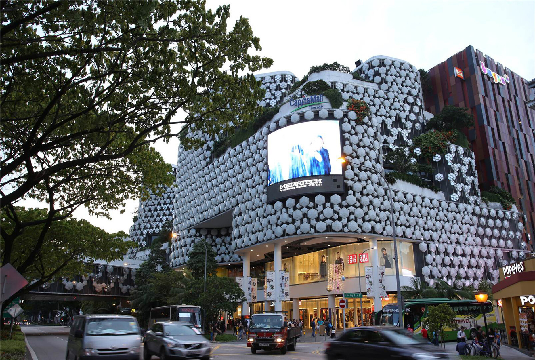 Auch das Einkaufszentrum Bugis+ in Singapur blieb erhalten, nachdem CapitaLand es 2011 übernommen hatte. Der Entwurf des vielfach abgerundeten Baukörpers stammt von WOHA Architekten, die wunderbar abstrakte Medienfassade aus leuchtenden Schneekristallen vom Berliner Büro realities:united. Unter dem alten Investor lief die Mall nicht besonders gut. CapitaLand veränderte vor allem die BesucherInnenführung und die Zugänglichkeit, seitdem laufen die Geschäfte besser und die Fassade zeigt sich noch immer als besonders spielerisches Stück Architektur. CapitaLand konnte mit dem Projekt beweisen, dass sie ein Herz für ambitionierte und durchaus verspielt experimentelle Architektur hat – und darüber hinaus auch weiß, wie man diese professionell und dauerhaft betreiben kann.