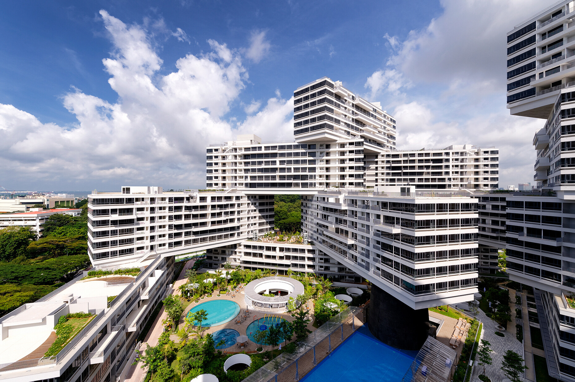 Einen Superlativ bietet auch die von CapitaLand entwickelte Shopping Mall Jewel am Changi Airport von Singapur, die ebenfalls von Safdie entworfen wurde. In deren Zentrum bildet die Architektur üppig begrünte Terrassen wie einen Indoor-Dschungel unter einem Glasdach, das sich in der Mitte nach unten öffnet, um den größten Indoor-Wasserfall der Welt zu formen. Und wenn wir auf die Wohnungsbauprojekte der CapitaLand blicken, dann sehen wir Mega-Projekte wie etwa "The Interlace" in Singapur von 2013, ein Entwurf von Ole Scheeren und RSP, der sechsgeschossige Wohnriegel zu einem gewaltigen Stapel übereinanderstellt als seien diese Bauklötze eines besonders kreativen Kindes. Zwischen den Blöcken bleiben große Lufträume frei, was den in den Wohnungen reichlich Licht, Luft und einen relativ weiten Ausblick garantiert.