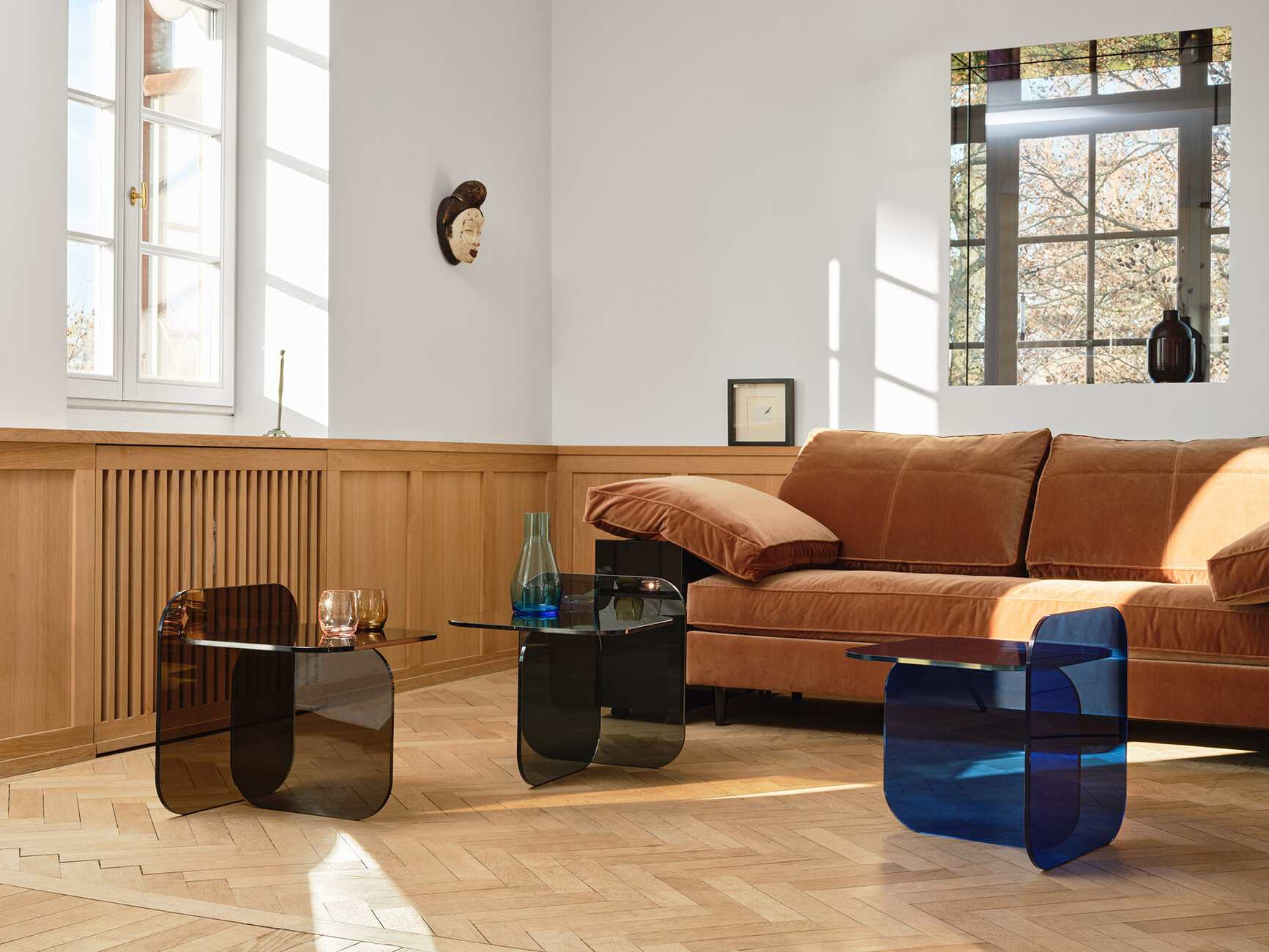 Das Designerduo OrtegaGuijarro hat mit dem "Sol Side Table" für ClassiCon einen Beistelltisch aus Glas entworfen, der bestehend aus drei unterschiedlich großen Platten wie eine Skulptur anmutet. In den Varianten Blau, Grau und Bronze wirkt die Konstruktion im Spiel von Licht und Schatten aus jeder Perspektive neu. "Unsere Arbeit zielt immer darauf ab, eine visuelle Spannung zu erzeugen", so OrtegaGuijarro. Im Detail wird die Version in Grau und Bronze aus durchgefärbtem Parsolglas gefertigt, während "Sol" in Blau aus Kristallglas mit Farbeinlage entsteht. Dank der Transparenz des Materials und den reizvollen Lichteffekten auf der Oberfläche, lässt sich "Sol" von ClassiCon spielend leicht in jede Innenraumgestaltung integrieren und setzt dennoch einen sichtbar zeitgenössischen Akzent. "Die Verwendung von Glas als einzigem Material hat es uns erlaubt, bei 'Sol' genau die reine Ästhetik beizubehalten, die uns vom ersten Moment an fasziniert hat", so Carlos Guijarro und Alex Ortega. (am)
