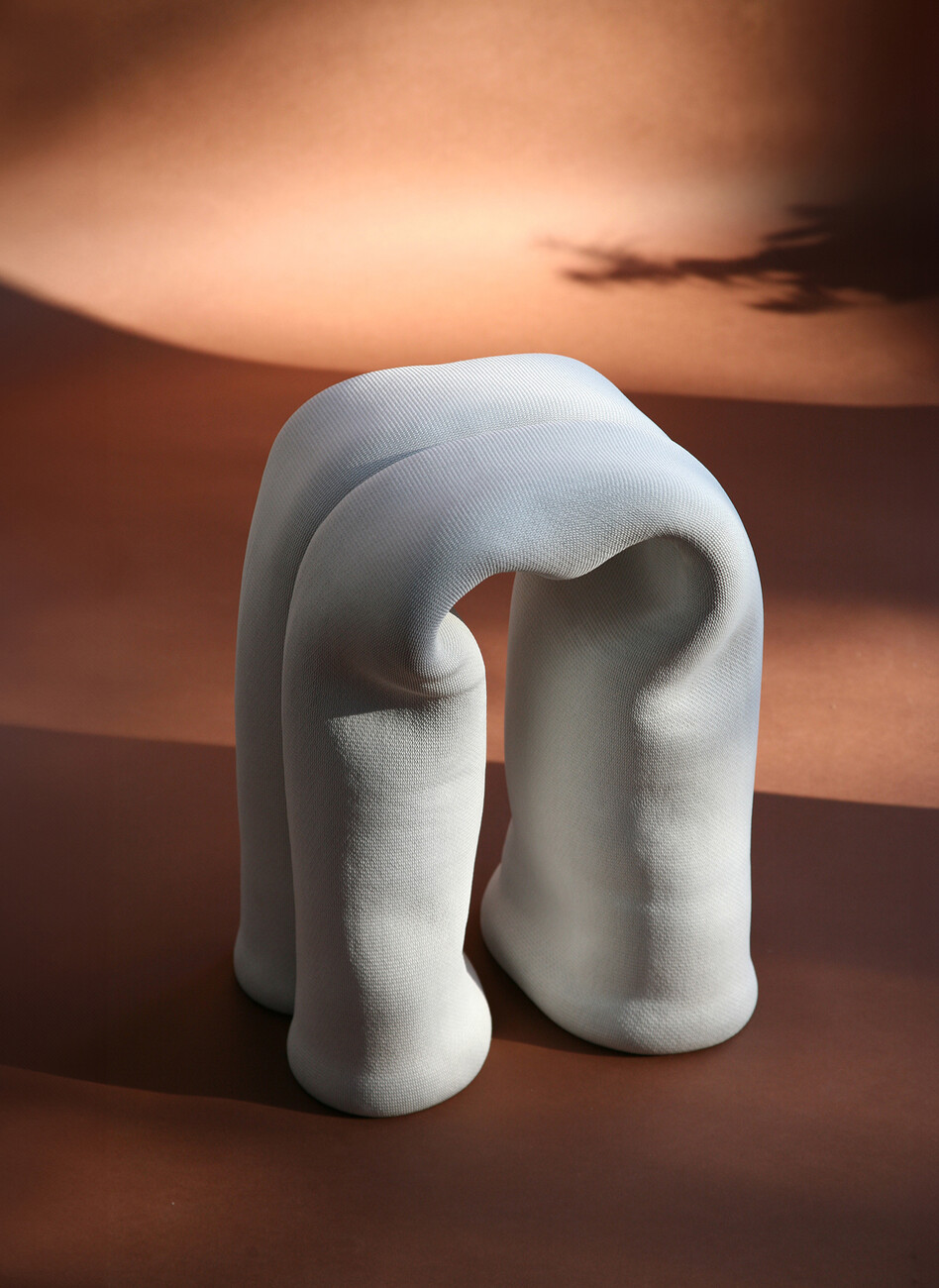 Eines der aktuellen Werke von Budde – dahinter stecken der Architekt Johannes Budde und die Brandmanagerin Meike Papenfuß – ist der kleine "Rug’n Roll" Betonhocker, der mit seiner knautschig fließenden Form so ungewöhnlich wie sympathisch daherkommt und eher an ein weiches Textilmöbel erinnert, als an ein Sitzobjekt aus hartem Baustoff. "'Rug’n Roll' ist nicht aus einem konkreten Designkonzept entstanden, sondern aus der Faszination für ein spannendes Industriematerial", erklärt Johannes Budde. Der Betonverbundstoff Concrete Canvas ist zunächst weich wie ein Teppich und lässt sich frei formen. Budde arbeitete eine bestimmte Rolltechnik aus, bei der er die Form seines Objekts nur grob vorgibt. Das Material selbst gestaltet quasi den Rest aus: Die Wellen und Falten, die sich beim Rollen ergeben, sind gewolltes Zufallsergebnis. Sie machen jeden Hocker zu einem Unikat. Nach der Formung wird jeder Hocker bewässert. Dank integrierter Schicht aus Betonpulver wird er auf diese Weise steinhart und robust, behält jedoch seine textile Oberfläche und weiche Optik. "Wir möchten dem industriellen Material durch Verwendung in einem anderen Kontext ein neues Leben geben", so Johannes Budde.