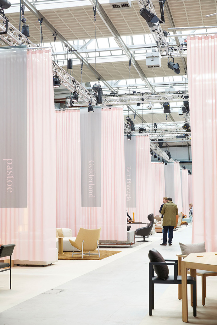 Für die Inneneinrichtung zeichnet wie im letzten Jahr das Studio Daphna Laurens verantwortlich, und übersetzt den kooperativen Fokus ideal: "Wir wollten eine offenere, transparentere Veranstaltung schaffen, ohne blockierende Wände und mit uniformen Flächen für die HerstellerInnen", so Daphna Isaacs. Alle Schauräume haben so die gleiche Farbe, wie auch die Darstellung der jeweiligen Logos einheitlich ist. Auf diese Weise soll eine Mischung aus Ausstellung und kommerzieller Veranstaltung geschaffen werden. Als Raumtrenner dienen Vorhänge – waren diese im letzten Jahr noch in Puderrosa und Schiefergrün getaucht, hat das Duo dieses Mal goldene und beige Töne ausgesucht und sie mit Ziegelrot kontrastiert. "Vieles in unserer Arbeit ist Intuition. Wir wollten natürlich für Destination: Design eine positive Stimmung schaffen, die aber neutral genug ist, damit jede Marke damit arbeiten kann", erklärt Laurens Manders.