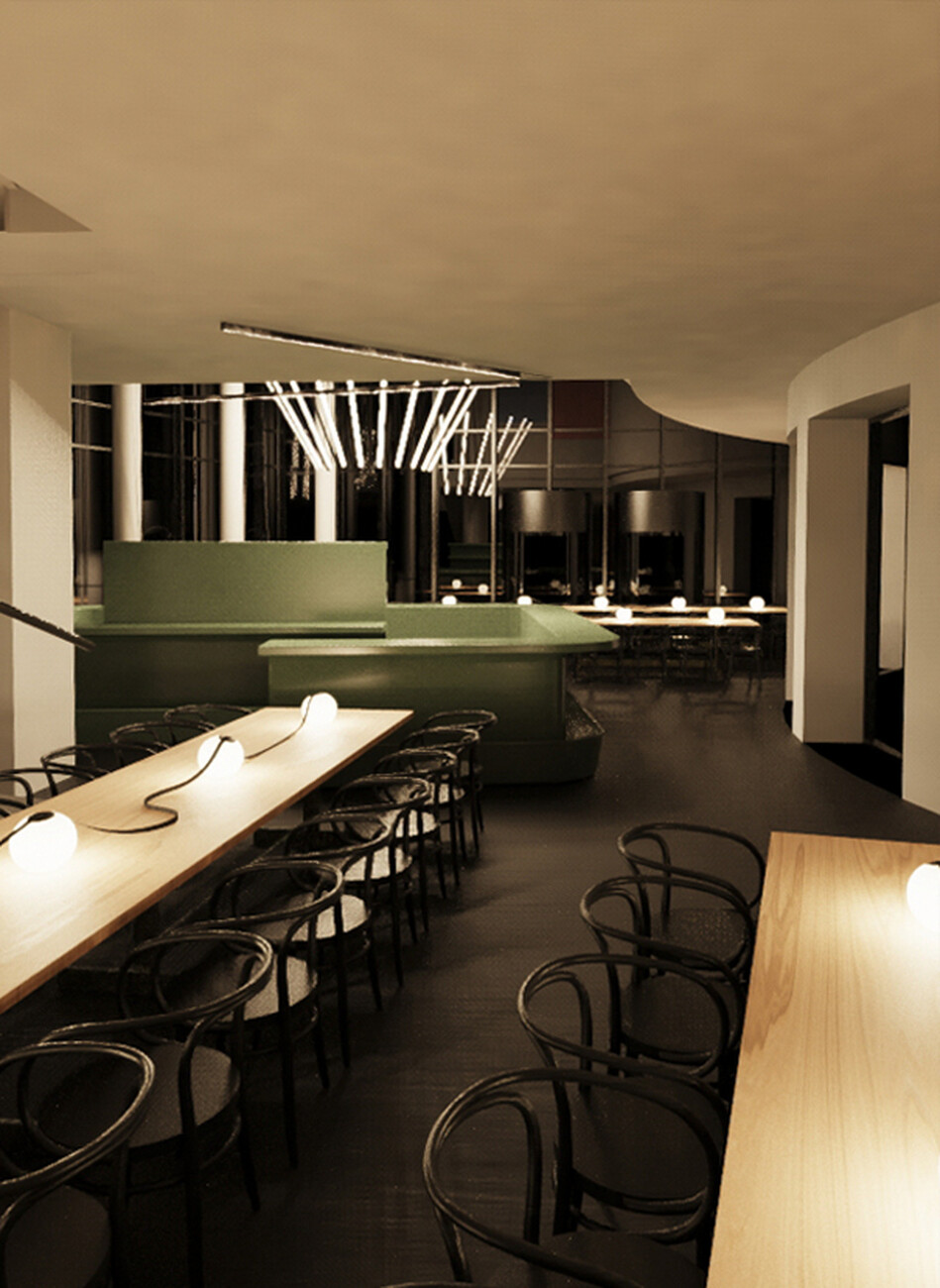Für das Beleuchtungskonzept hast du zwei unterschiedliche Produkte aus deinem Portfolio ausgewählt: Die Leuchtenfamilie "Ayno", die du für Midgard entworfen hast sowie das Beleuchtungssystem "Plusminus", das für Vibia gerade auf den Markt gekommen ist. Der Grundriss des Badias Schirn Café ist außergewöhnlich – rund und mit hohen Decken. Wie bespielt ihr den Raum?