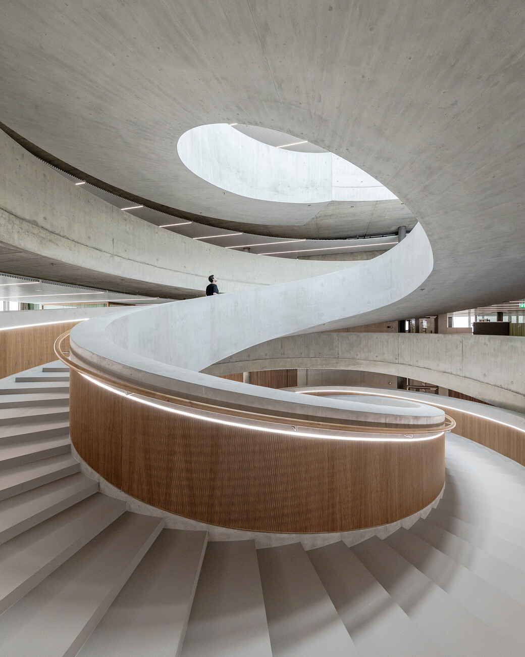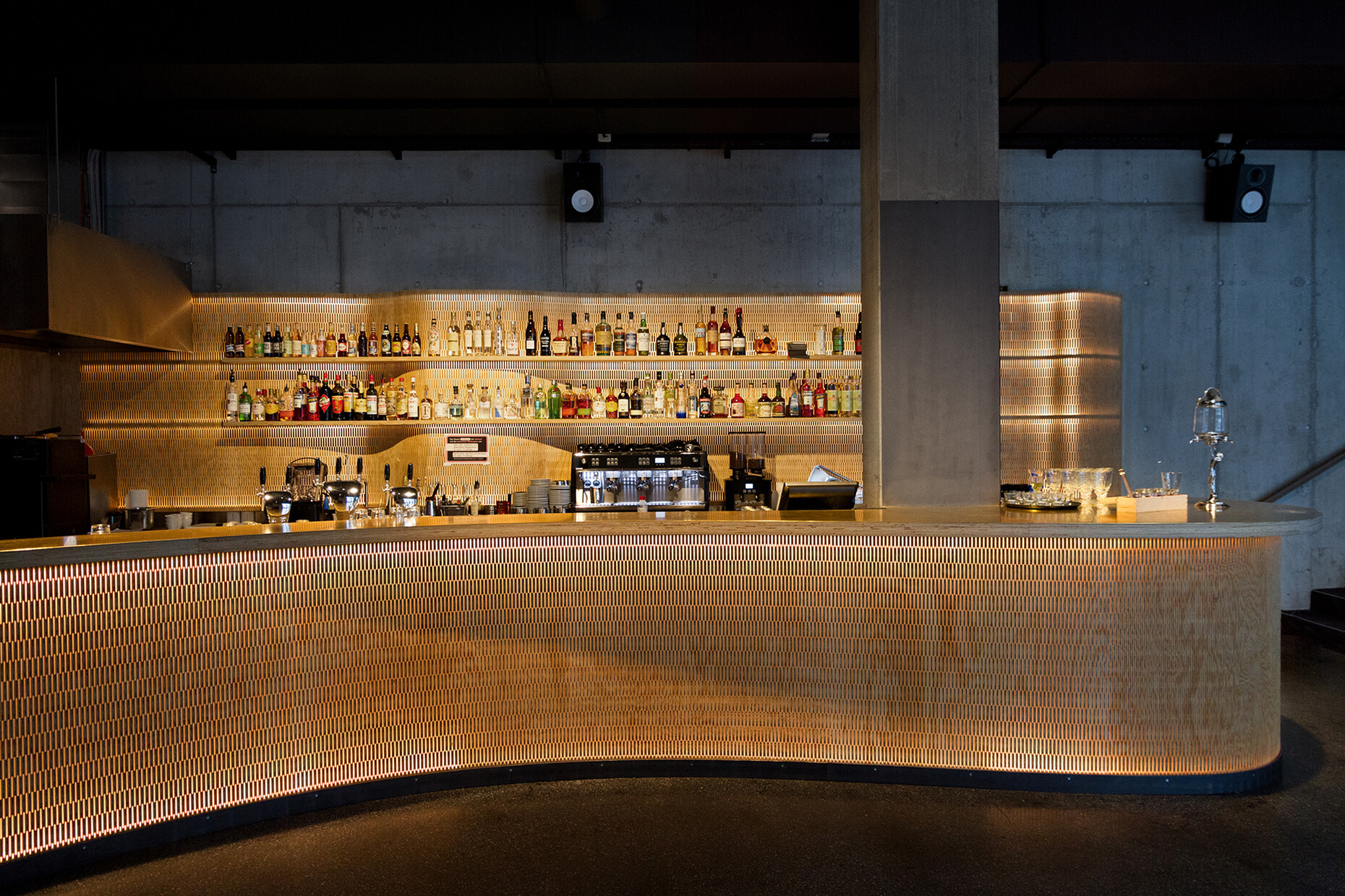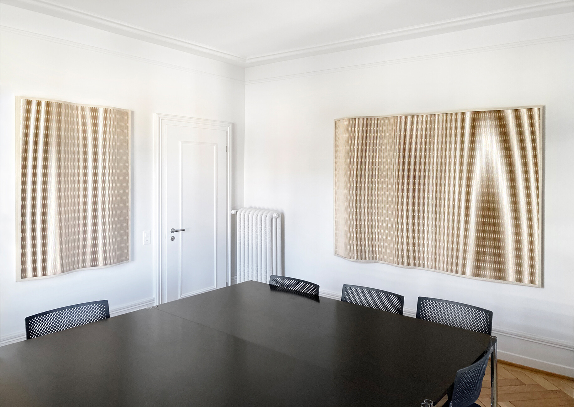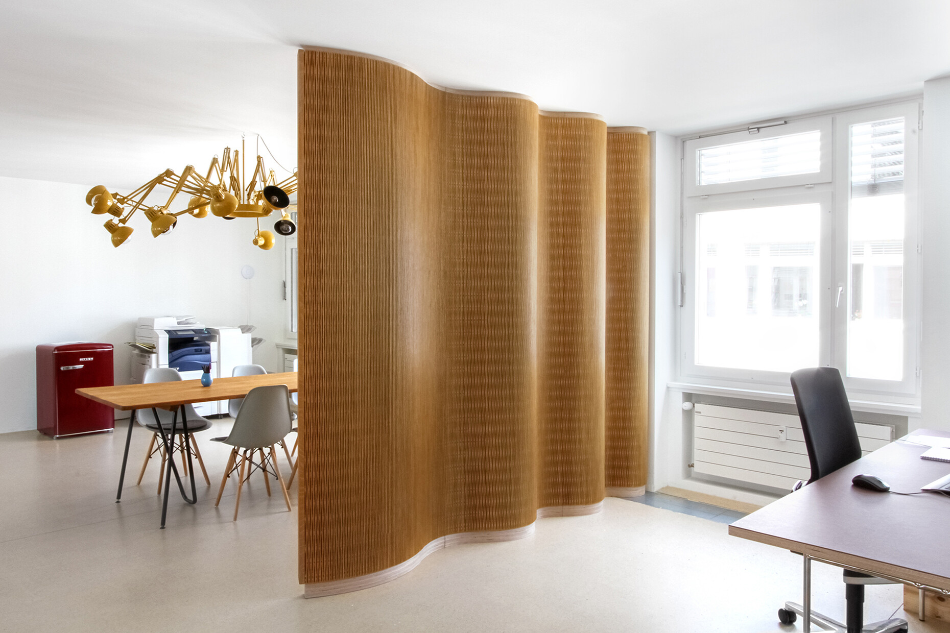 "Unser Schwerpunkt liegt ganz klar im Innenausbau", so Pablo Lunin. Neben der Biegsamkeit und Optik sind es besonders die akustischen Eigenschaften, die für Innenarchitektinnen und -architekten interessant sein dürften. Wellenförmige Paneele schweben so bereits an Kirchendecken oder verkleiden die Wände in Konzertsälen. Für Großraumbüros eignen sich auch vorgefertigte Kassetten mit einem textilen Vlies an der Rückseite, die Wandschmuck und Schallschutz in einem sind. "Das Besondere ist, dass das Material sowohl im historischen Kontext als auch in einem modernen Kontext seine Wirkung entfalten kann", sagt Serge Lunin und zeigt auf ein Element aus Arvenholz mit einer starken Maserung. "Das könnte ich mir zum Beispiel gut auf einer schlichten Betonwand vorstellen." Neben der Akustik ist die Lichtdurchlässigkeit eine weitere reizvolle Eigenschaft des flexiblen Holzes. Sie kam unter anderem im Zürcher Kulturzentrum Kosmos zur Geltung, wo die hinterleuchtete Holzverkleidung den Raum in ein warmes Licht tauchte. Wer sich diesen Effekt nach Hause holen möchte, kann im kleinen Onlineshop zudem Tisch-, Hänge- und Stehleuchten von Dukta bestellen. Zu dem Möbelportfolio gehören zudem Wandpaneele mit schmalen Regalbrettern aus MDF sowie der Loungestuhl "Tschair", den Dukta zusammen mit dem Architekten Elias Leimbacher entwickelt hat. Neben neuen Anwendungsbereichen für ihr Material suchen Pablo und Serge Lunin momentan nach Möglichkeiten, es günstiger herzustellen. Ein Meilenstein in der Unternehmensgeschichte ist zudem die endgültige Anerkennung durch das Europäische Patentamt. Pablo Lunin sagt: "Für uns ist die definitive Erteilung des Europapatents ein entscheidender Faktor für die längerfristige Zusammenarbeit mit unseren ausländischen LizenzpartnerInnen."