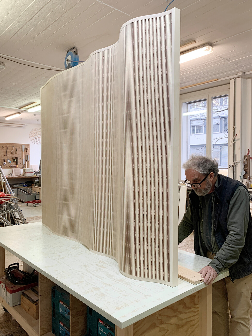 Herausforderungen führen oft zu den besten Ideen. Serge Lunin arbeitete als Dozent im Fachbereich Gestalten mit Holz an der Zürcher Hochschule der Künste, als im Jahr 2006 ein Student eine Liege in gebogenem Holz umsetzen wollte. "Mit den konventionellen Holzbiegetechniken durch Dampf oder einer Schichtverleimung war das nicht möglich“, erinnert er sich. Der gelernte Tischler kam aber auf eine andere Idee: Er schnitt das Holz versetzt zu beiden Seiten ein, sodass die einst soliden Leisten beweglich wurden. "Durch Experimente gelang es, diese Schnittfolge auch auf eine Fläche zu bannen", sagt er. Eine Massivholzplatte wird auf diese Weise formbar wie eine Gummimatte.