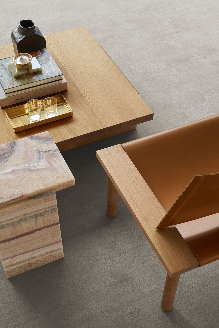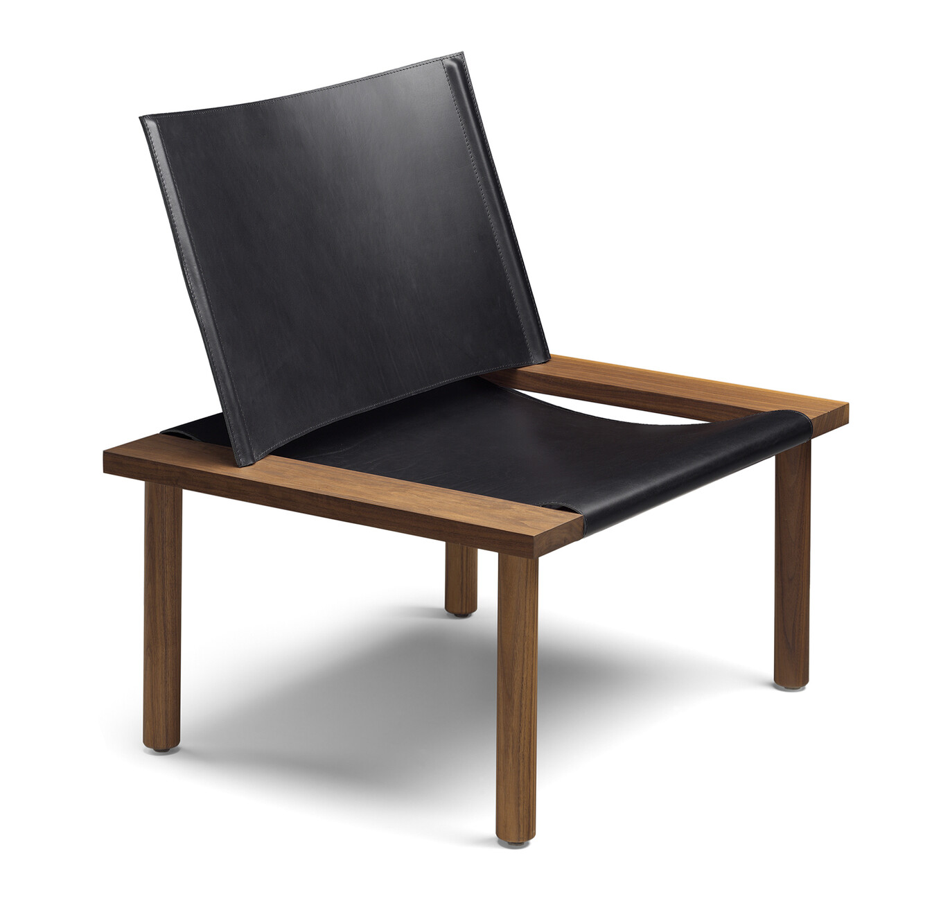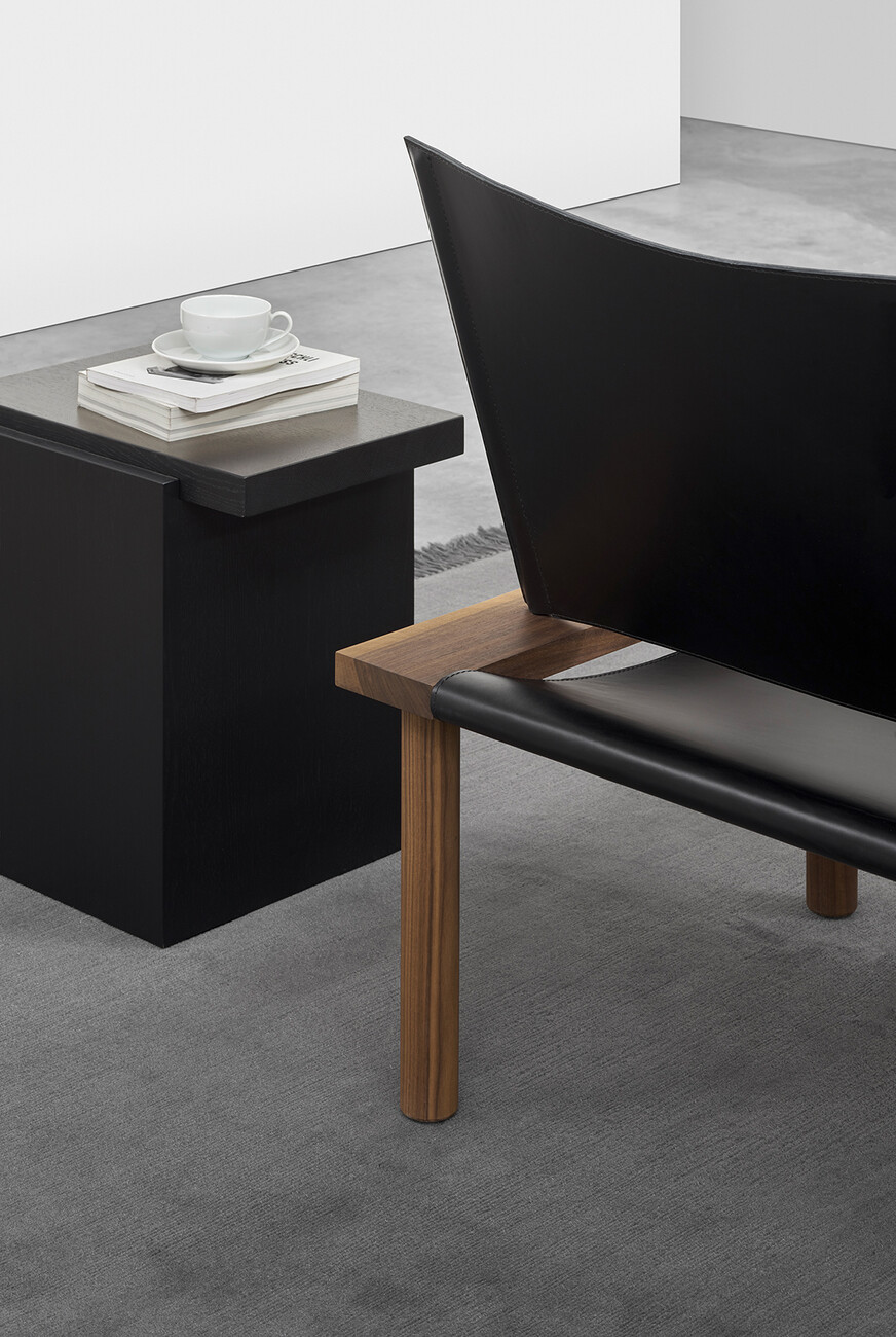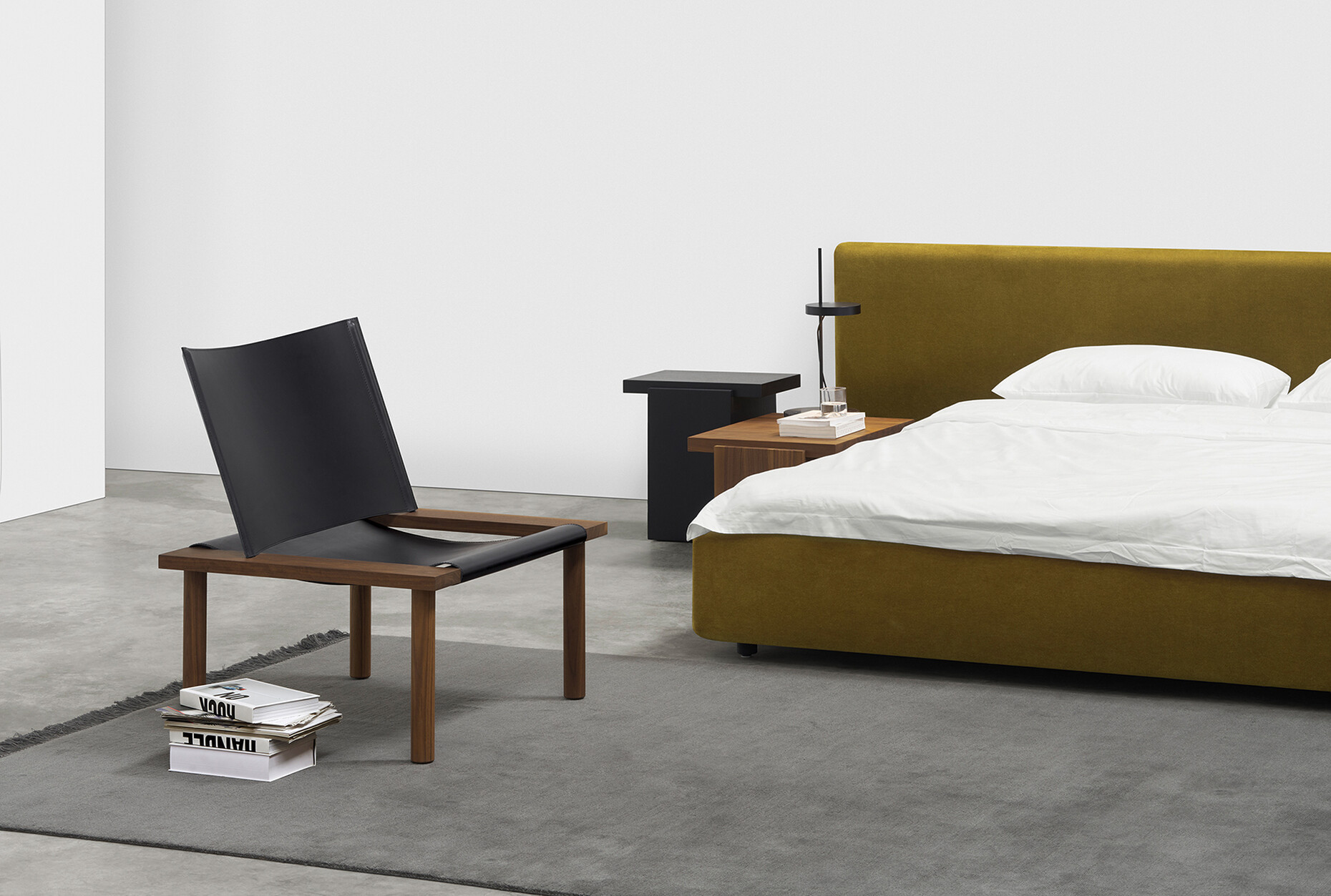 "Ilma" von Jonas Lutz für e15 besteht in der Basis aus einem quadratischen Massivholzrahmen, gefertigt aus europäischer Eiche oder dem in Europa heimischen Nussbaum sowie einer breiten Bahn aus samtweichen Gurtleder, auf der Platz genommen werden darf. In Natur, Brandy und Schwarz bietet diese einen robusten wie komfortablen Sitzplatz. Den Rücken schmiegen darf man indes an die großzügige, leicht gebogene Lehne, die auf dem Rahmen mit zwei Streben befestigt ist, den Körper ideal stützt und ebenso mit Leder bezogen ist. Wird der Stuhl nicht verwendet, bildet das Gurtleder formal eine nahezu gerade Linie. Für den festen Stand von "Ilma" sorgen vier gerundete Stuhlbeine, die aus dem gleichen Holz wie der Rahmen gefertigt sind und so einen harmonischen Abschluss bilden. Jedes Element von "Ilma" hat eine eigene Präsenz, wirkt unabhängig und ergibt im Zusammenspiel eine ungewöhnlich klare Form, für die Jonas Lutz den klassischen Sessel weitergedacht hat. (am)