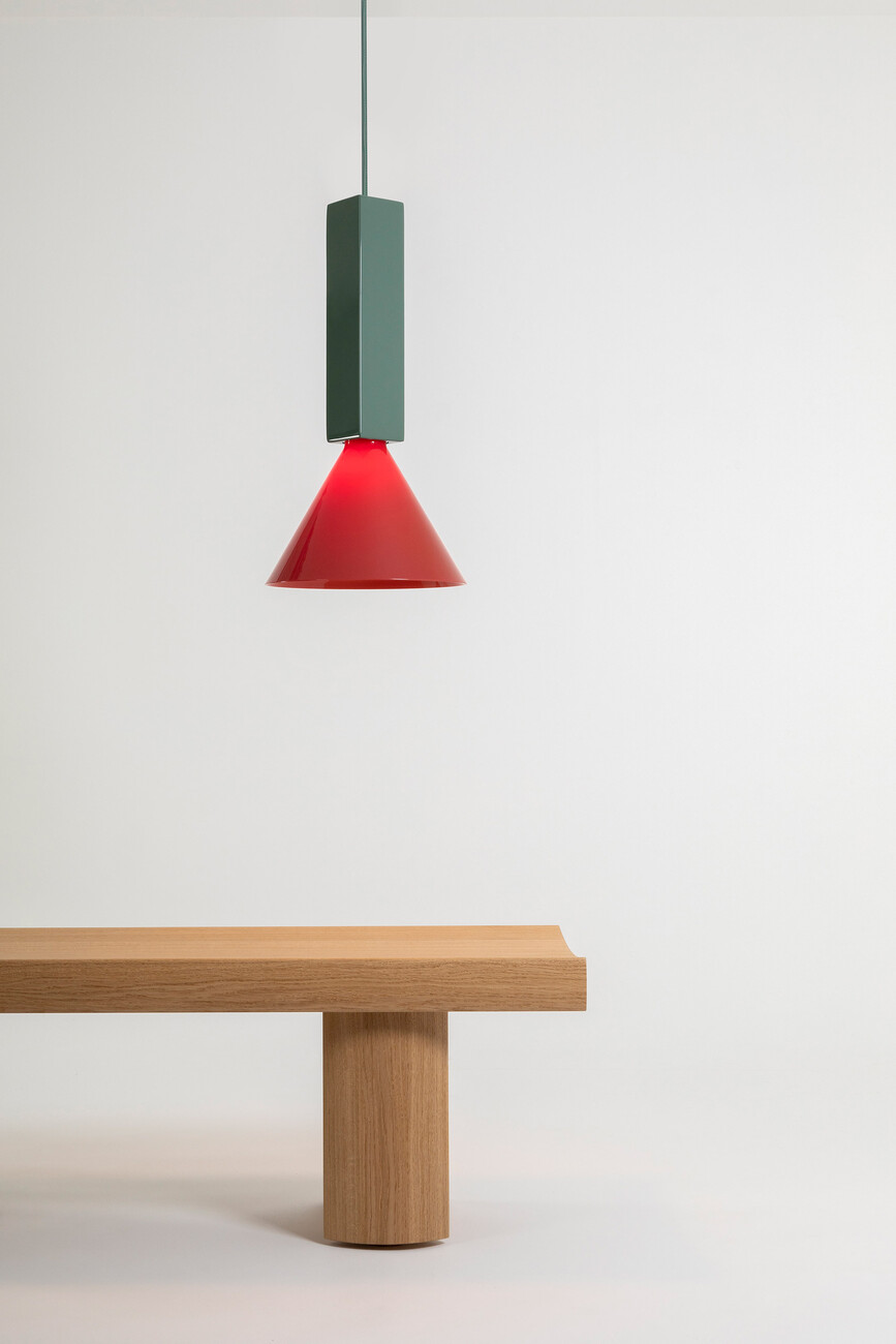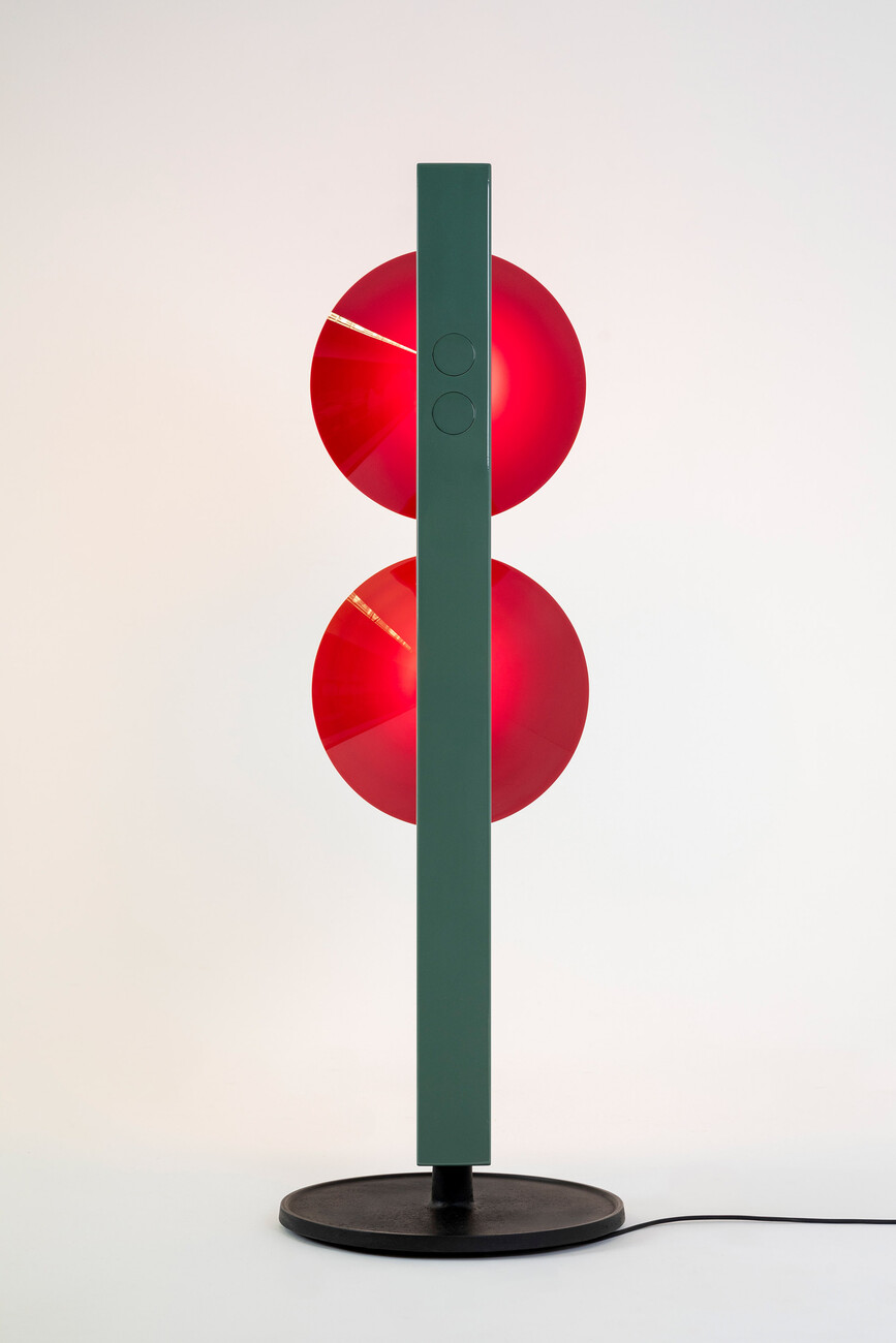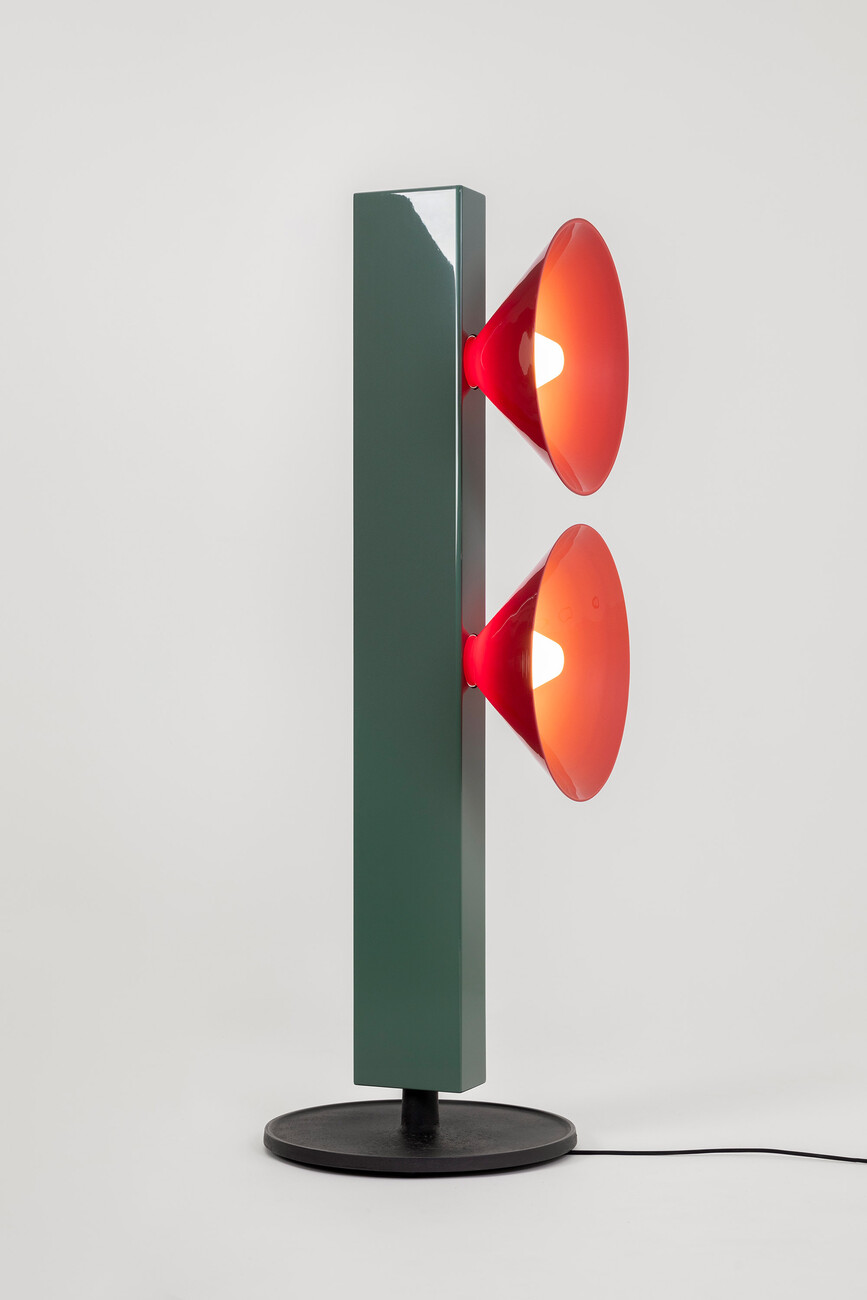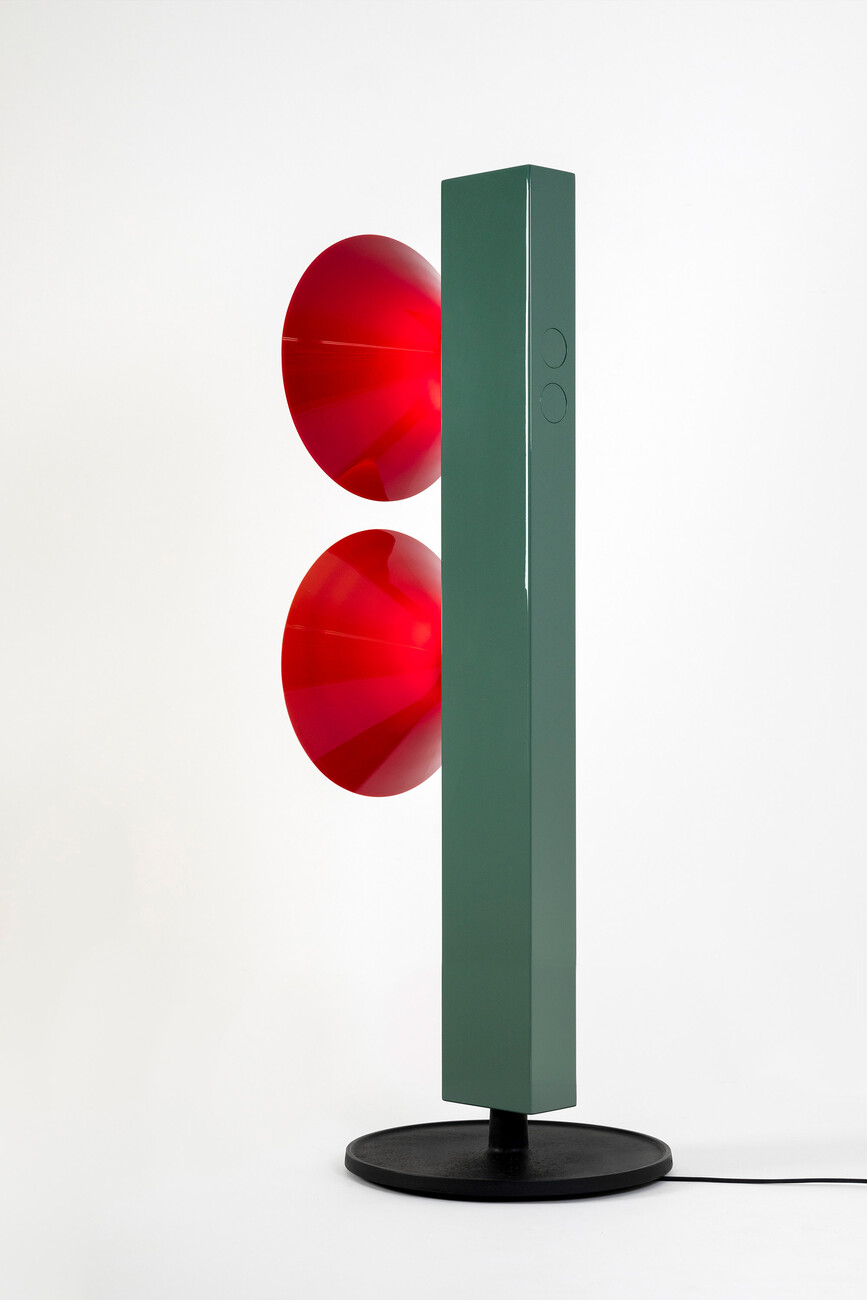 Die Intensität der Lampen bei den mehrflammigen Modellen kann einzeln angewählt werden und schafft so mit einer Kombination aus direktem und indirektem Licht unterschiedliche Stimmungen. Verstärkt ist die formale Parallele zu einer Signalanlage anhand der großflächigen, runden Druckschaltern, die in den Korpus eingelassen sind. Die Form des Kegels begleitet Barber Osgerby bereits seit ihren Anfängen als Designer: "Beim technischen Zeichnen wird die konische Form bei orthografischen Darstellungen genutzt, um die Ansicht des gezeichneten Objekts zu definieren. Es ist ein Code, der tief in unserem Gedächtnis verankert ist." Auch hinsichtlich des Empfangens von Informationen ist der Kegel mit dem Menschen nah verbunden, denn die kegelförmigen Zellen in unseren Augen verarbeiten alle Farbinformationen. "Kegel laden zum aktiv werden ein", so Edward Barber.