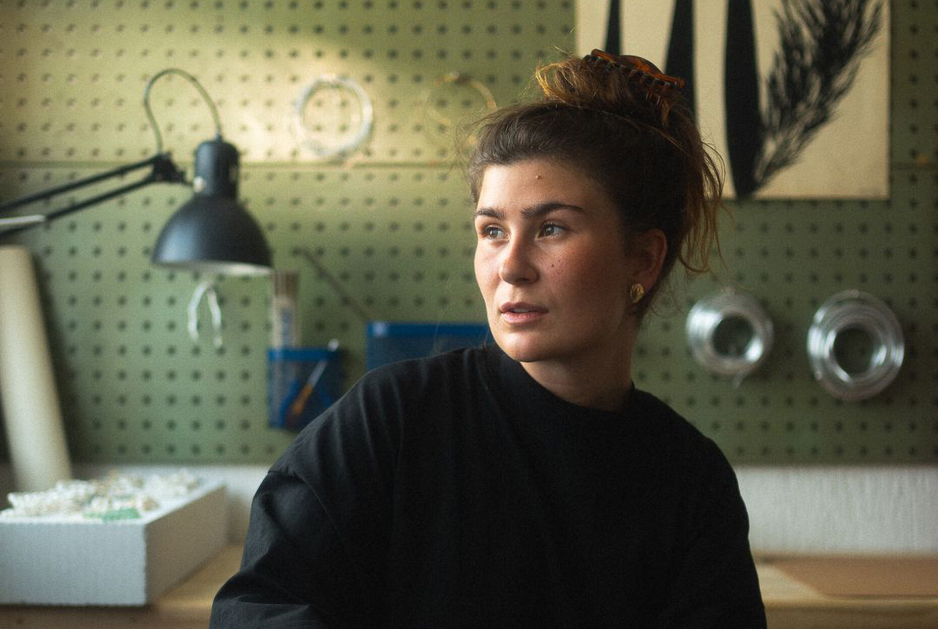 Durch ihren Vater, einen Zinngießermeister mit eigener Werkstatt, kam Elena Kayser schon früh mit Design und Produktion in Berührung. "Mein Papa hat meine Entwicklung als Designerin maßgeblich geprägt", sagt die 25-Jährige. "Ich war schon als Baby im Maxi-Cosi dabei, wenn er in der Gießerei gearbeitet hat." Stefan Kaysers Werkstatt liegt im malerischen St. Ingbert im Saarland. Es ist ein großes, L-förmiges Gebäude, unter dessen Dach sich neben einem geräumigen Lager, einem Büro und einem Verkaufsraum auch verschiedene Produktionsräume befinden. In der sogenannten Dreherei ist Elena Kayser fast täglich an einer alten Werkbank anzutreffen, wenn sie an neuen Schmuckstücken für ihr Label Studio Èna arbeitet. Neben hochmodernen Laser- und Fräsmaschinen finden sich hier auch alte Werkzeuge, die zum Teil noch aus Kayserzinn-Zeiten stammen. Elena Kayser und ihr Vater sind direkte Nachfahren von Jean Kayser, der Mitte des 19. Jahrhunderts für die Produktion der weltberühmten Kayserzinn-Objekte verantwortlich war. Da Zinnguss heute kaum noch gefragt ist, werden in der Werkstatt hauptsächlich Gravuren für Industrie und Werbung gemacht. Aber auch antike Kayserzinnvasen und -schalen werden hier restauriert und aufpoliert.