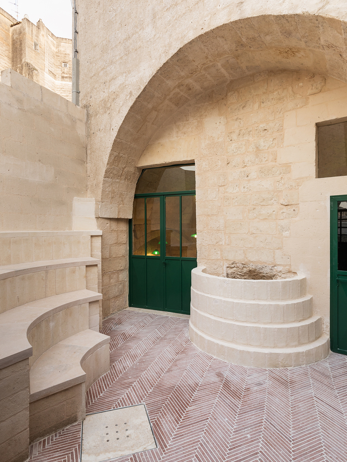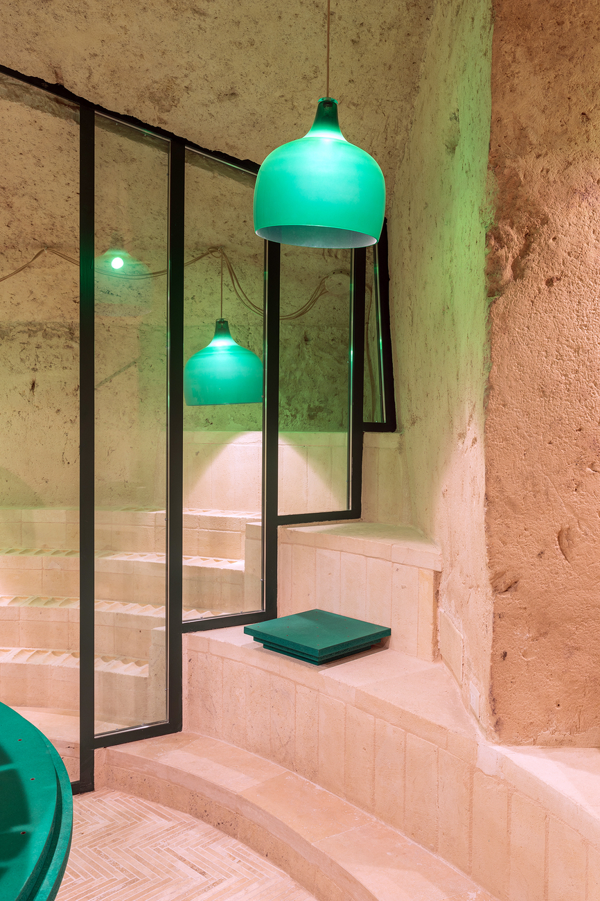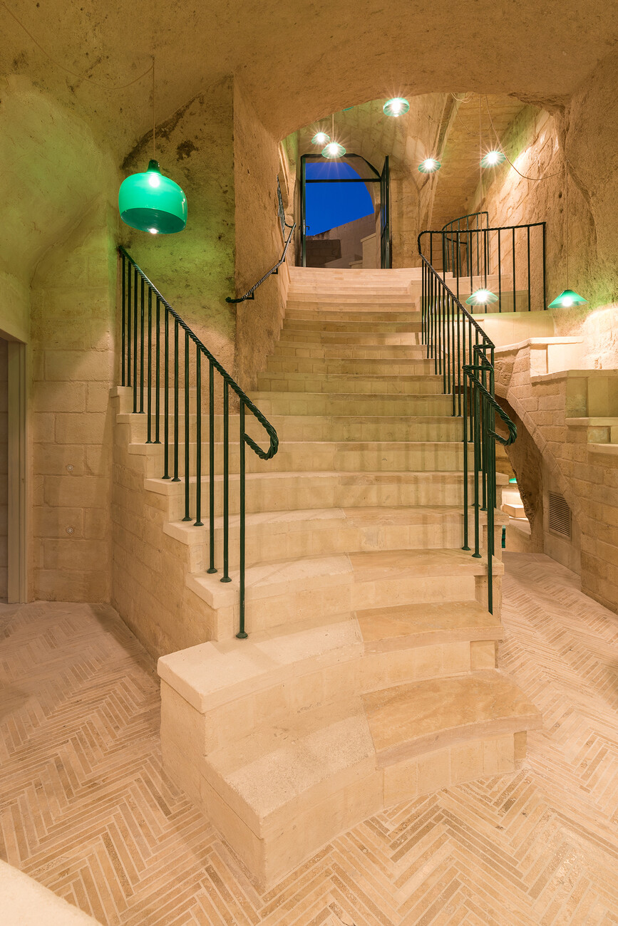 Präzise wurde von den Architekten herausgearbeitet, was die einfache Architektur der "Sassi" prägt: Der Stein der Wände wurde roh belassen und die grünen Leuchten hängen mit "langer Leine" von der Decken – und erinnern