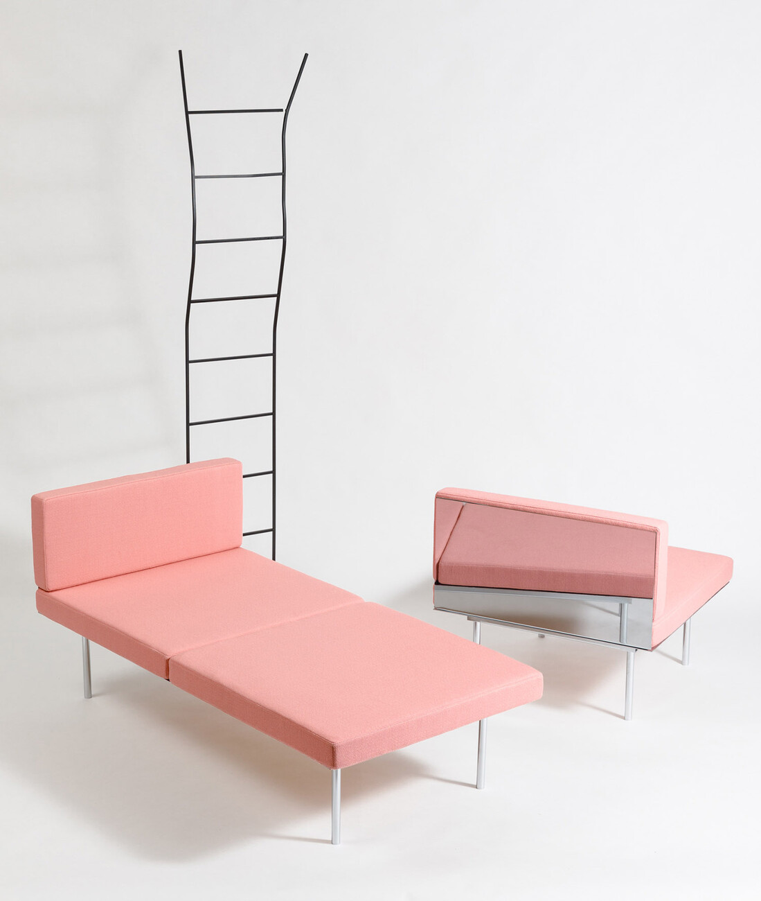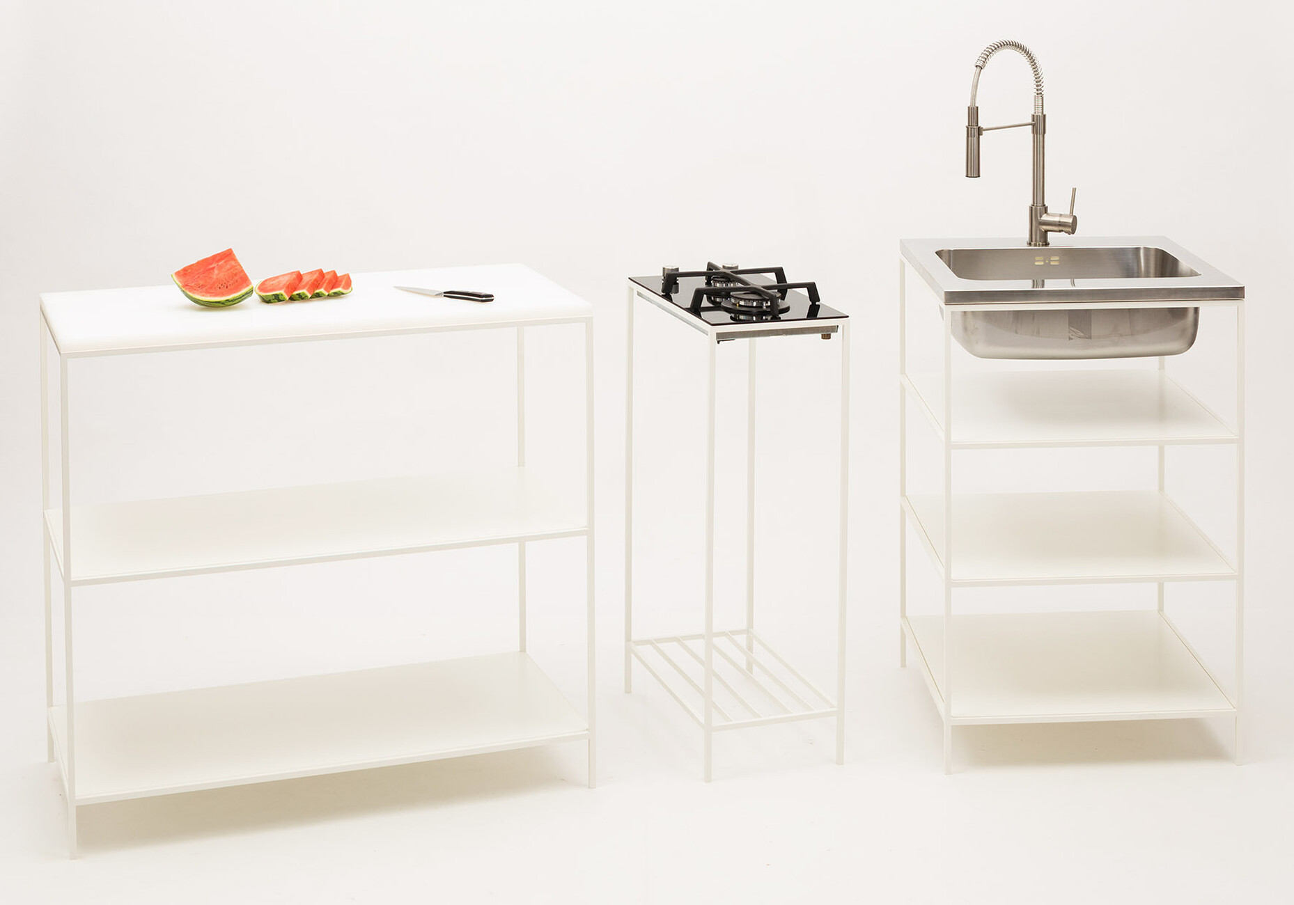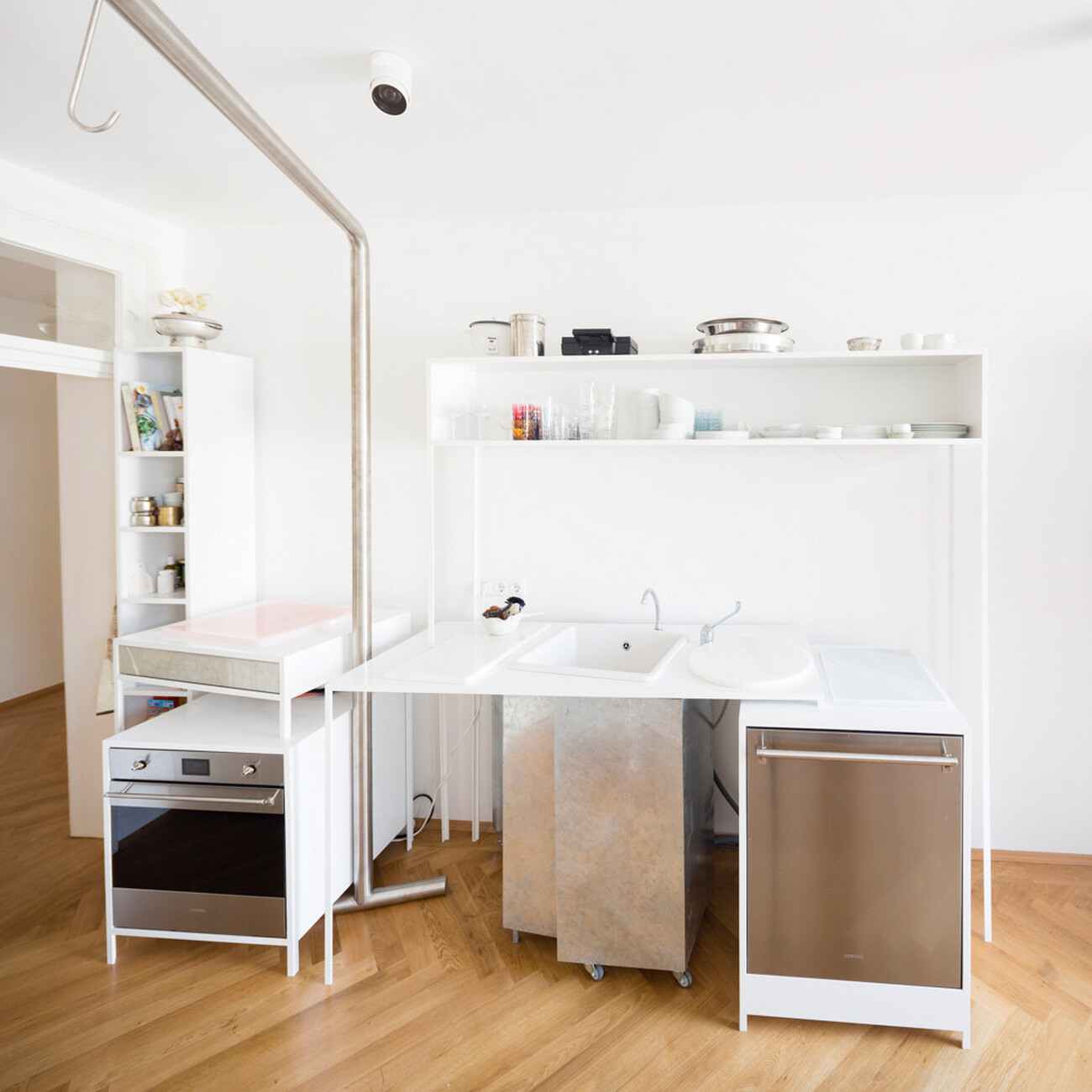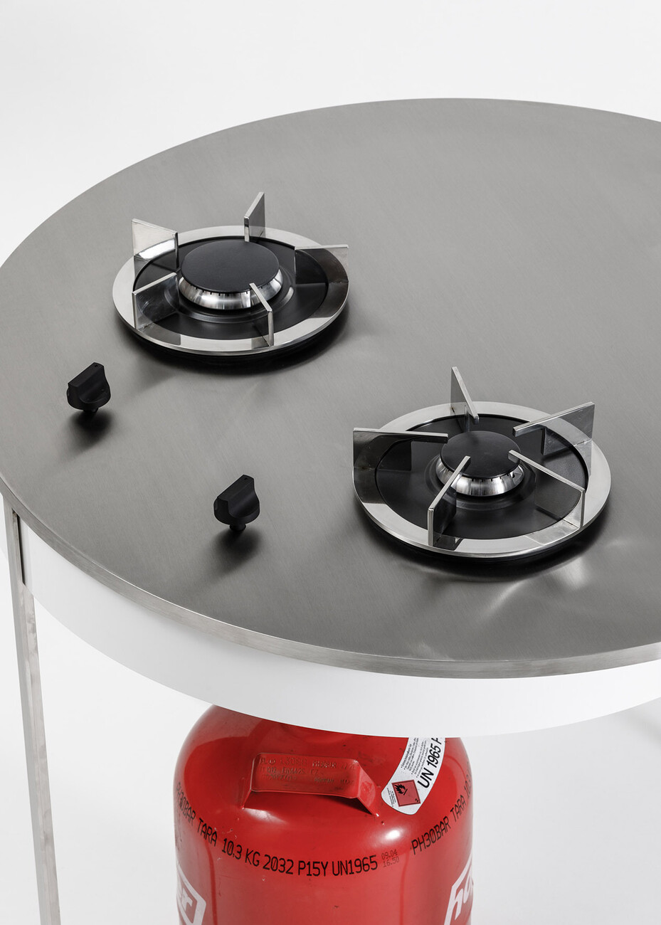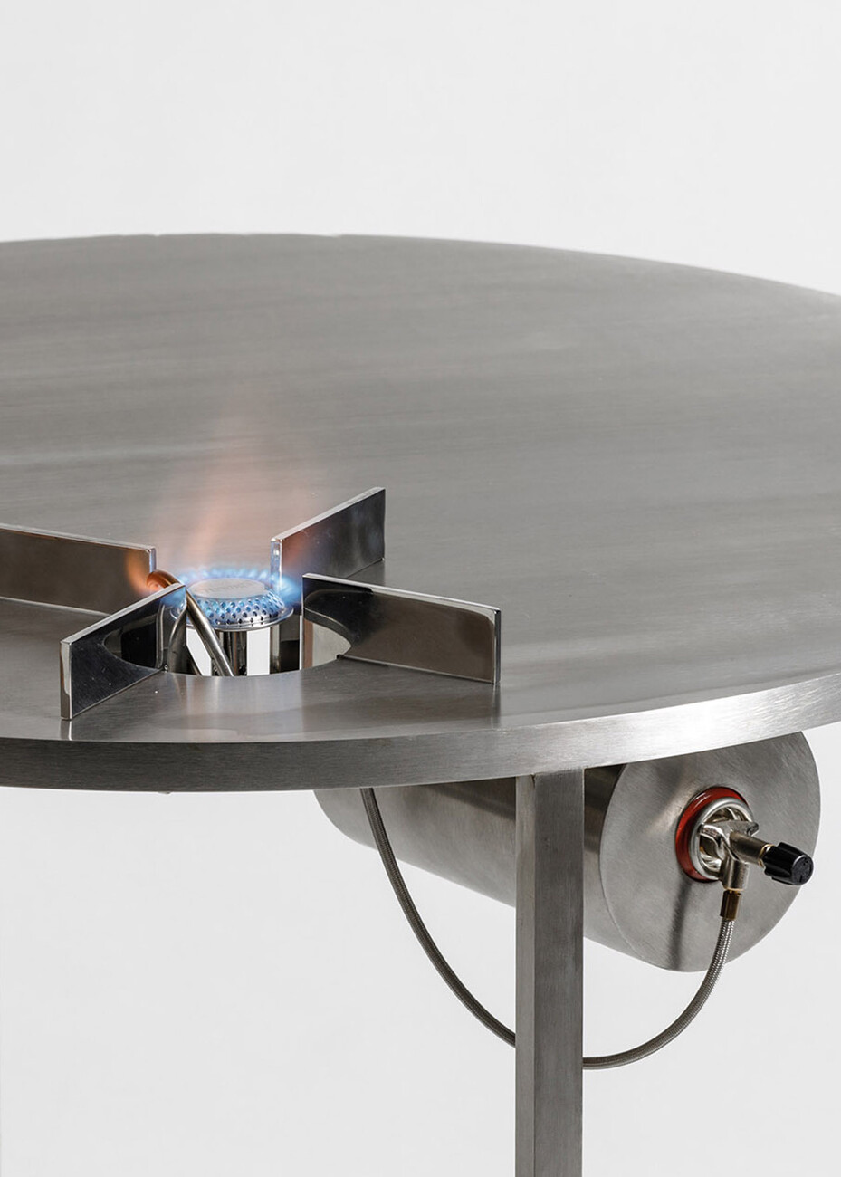 Während in den sozialen Medien sanft gerundete Sofas in wolligen Kuschelbezügen und grobe Teppiche aus ungebleichten Jutefasern hoch- und runterjagen, kommen aus der Kreuzberger Hinterhofwerkstatt Möbel und Objekte von ausgesuchter Künstlichkeit und Härte. Barhocker, die auf vier stockdünnen Beinchen balancieren. Tische mit eingebautem Gasbrenner zum Kochen. Metallisch-glänzende Küchenmodule auf Rollen. Gepolsterte Stühle in Schreifarben. Scharfkantige Treppen aus verzinktem Blech. "Unsere Entwürfe sind alles Gegenstände in dem Sinn, dass sie ein Gegenüber sind", sagt Simon Ertl, einer der beiden Gründer von Ertl und Zull. "Dass sie einem im Weg stehen, gegen einen stehen. Sie sind nicht nur gemacht, um uns in ihrer Funktionalität zu gefallen und zu dienen. Sie sind eigene Charaktere, mit denen man eine Beziehung aufbaut." Die ungute Begegnung eines Schienbeins mit einer Metallkante ist übrigens einkalkuliert. Da ist der Designer schmerzfrei: "Das intensiviert doch nur die Beziehung zum Objekt", sagt er lachend.
