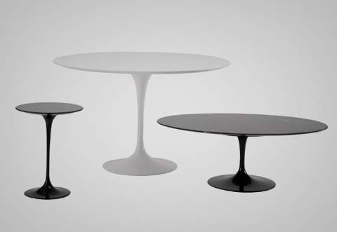 Tische geben Räumen ein Gesicht, ihr Charakter kann tonangebend sein. Das Material ist dabei nicht nur für Nutzungsszenarien im Innen- oder Außenbereich, als Ess- oder als Konferenztisch entscheidend. Es gibt obendrein den Takt für die Formgebung und für dekorative Optionen vor. Eero Saarinens „Tulip Table", ein Klassiker aus den fünfziger Jahren, hat auf seiner kreisrunden Marmorplatte dünne Maserungen, welche den tulpenförmigen Tischfuß um filigrane organische Linien ergänzen. Luca Nichettos „Blackstone" für Moroso wiederum setzt auf Porzellanlaminat im Verbund mit Glas. Die dunkle Tischoberfläche, die von vier Stahlbeinen getragen wird, zieren Rosenmotive. Dazu wurden die Fotografien von Massimo Gardone auf Porzellan gedruckt – eine romantische und bewusst kitschige Note, welche im Kontrast zur ansonsten schlichten Form des „Blackstone" steht. Weniger die Tischfläche denn die Beine geben in Alfredo Häberlis „Stabiles"-Tischen den Charakter an. Alexander Calders Stahlskulpturen waren die Inspiration für die Entwicklung und Formgebung der hölzernen Unterkonstruktion, deren skulpturaler Ausdruck in den Blick fällt. Christophe de la Fontaine und Stefan Diez hingegen beschränkten sich in ihrem Entwurf für den „Bent Tisch" auf die nüchternen Möglichkeiten von Aluminium und machten die Konstruktionsmethode zum formgebenden Element: Mit Lasertechnik schnittgelocht, faltet sich die Oberfläche des Tischs seitlich nach unten und übernimmt so auch gleich die tragende Funktion.