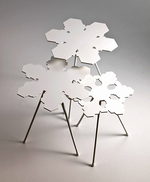 Fertigungstechniken wie Lasertechnologien oder fünfachsige CNC-Fräsen erweitern die Konstruktions- und Formoptionen von Tischen. Entwurfs- und Herstellungsprozesse sind dabei über Softwareschnittstellen miteinander verzahnt und gehen ineinander über. So entwickelte das schwedische Architekten- und Designtrio Claesson Koivisto Rune einen Beistelltisch, dessen Oberflächenform sich an Schneekristallen orientiert. Gemäß dem Leitspruch des amerikanischen Fotografen Wilson Bentleys, der für seine Schneekristallaufnahmen berühmt ist, zeigt sich dabei, dass alle Schneeflocken unterschiedlich sind und keine zweimal vorkommt. Die weißen, kristallförmigen Flächen von „Snowflake" werden mit einer speziellen Software in unendlichen, zufallsbedingten Variationen generiert. Eine CNC-Fräse fertigt die Tischflächen mithilfe der jeweiligen Entwurfsdaten aus kristallweißem Mineralwerkstoff. Statt immer gleicher Tische entsteht durch diesen Produktionsprozess ein Cluster aus lauter verschiedenen Kristallvarianten – ein schwedisches Schneegestöber, das auf Singularität setzt und doch serienproduziert ist.