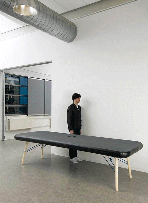 Dünn und leicht statt schwer und massiv präsentiert sich auch der „Air Table" von Jasper Morrison. Passend zu seinem Namen, der sein luftiges Erscheinungsbild benennt, ist das Polypropylen des Möbels weiß oder beige gefärbt. Abgerundete Kanten und optisch kaum erkennbare Verbindungsfugen zwischen Tischplatte und –beinen kommen noch hinzu. Der Charakter des Möbels zeigt sich fließend, leicht und wie aus einem Guss gefertigt. Philippe Malouin ging mit dem Entwurf des „Grace Table" sogar noch einen Schritt weiter: Die Luft gehört bei diesem aufblasbaren Objekt mit zur Konstruktion. Verpackt nimmt das Gummimaterial der Tischoberfläche nur 110 Zentimeter mal drei Zentimeter ein und kann in einer Tasche verstaut werden. Aufgepumpt hingegen breitet sich der Tisch mit seinen Holzbeinen auf drei Metern Länge aus und ist rundherum stabil.