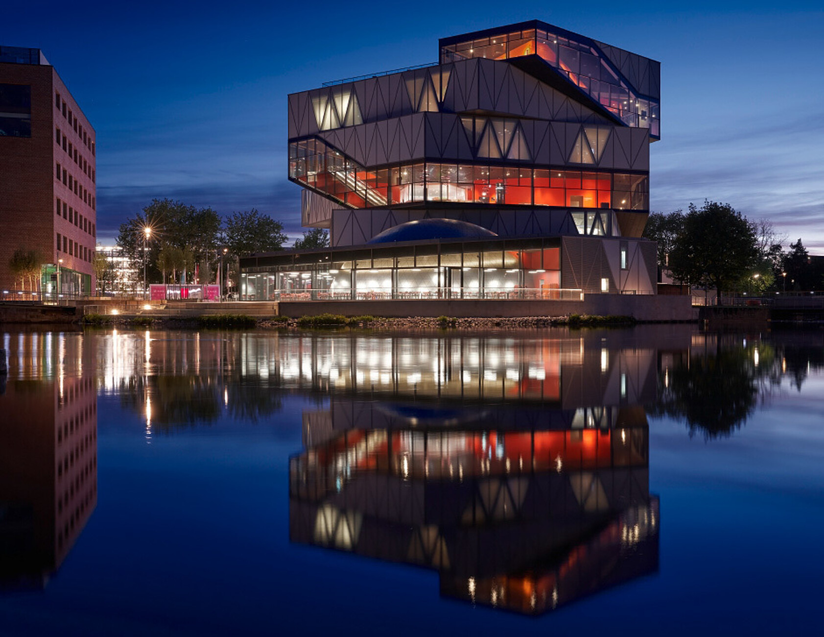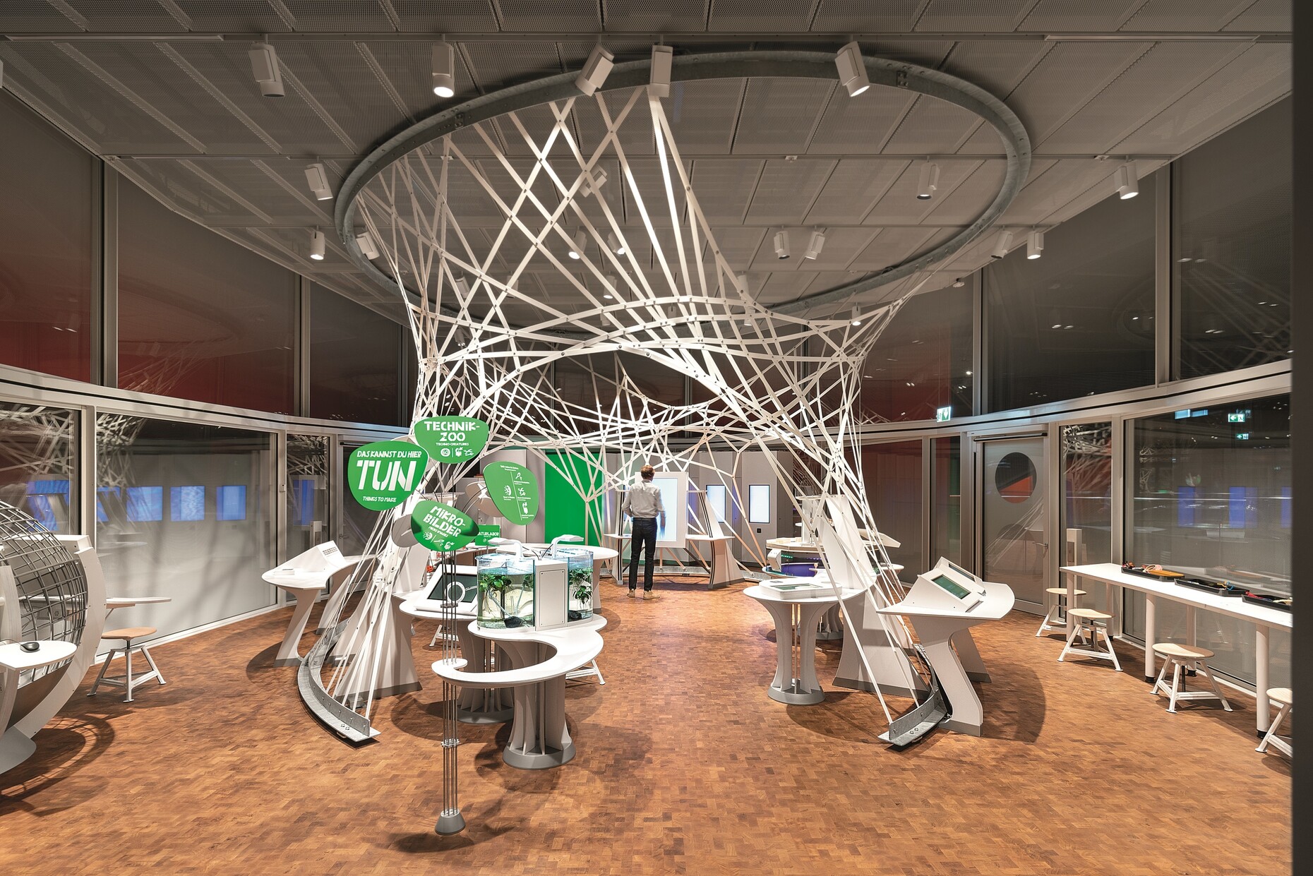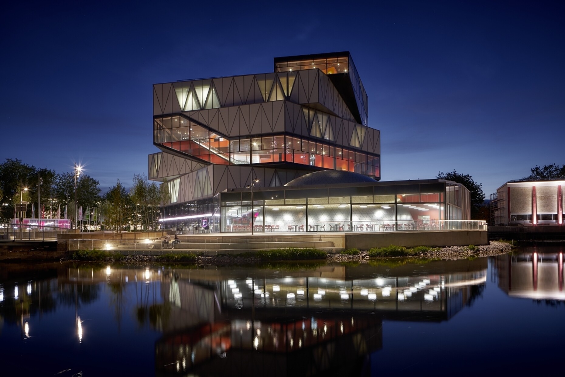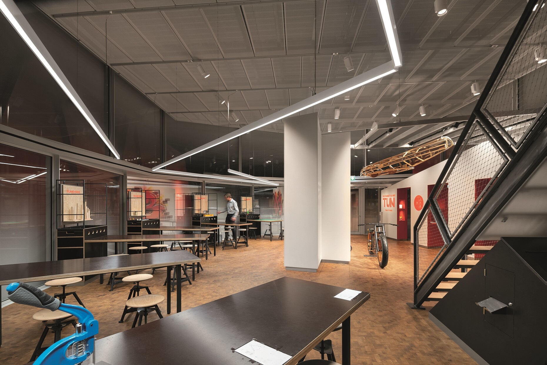 Wissen Sie was beim Bau einer Staumauer zu beachten ist? Wie man die Gravitationskräfte außer Kraft setzt und ein Wassertropfen fällt? Antworten auf diese Fragen erhalten Sie im Science Center Experimenta in Heilbronn am Flussufer des Neckars. Sauerbruch Hutton Architekten ergänzten für die Entdeckungsreise durch die Wissenschaft den Bestandsbau mit einem dynamischen Neubau: Geschossblöcke in Form von unregelmäßigen Fünfecken wurden aufeinandergestapelt und mit einer in Dreiecke unterteilten Fassade verkleidet. Im Inneren schraubt sich das Atrium wie eine Spirale bis in den fünften Stock und verbindet die Themenbereiche miteinander. Viel Tageslicht, Schrägen und wechselnde didaktische Exponate stellen hohe Anforderungen an die Lichtlösungen. In Zusammenarbeit mit Zumtobel entwickelte maierlighting Sonderleuchten, die sich flexibel an die wechselnde Raumsituation anpassen lassen. "Zumtobel ist bekannt für die Entwicklung hochqualitativer Lösungen", so Lichtplaner Jens Maier. Die Office-Leuchte "Light Fields Evolution" stellt mit patentierter Mikropyramiden-Optik die lichttechnische Basis für die Sonderleuchte. Dank einer Diffusorschicht ist die Beleuchtung blendfrei und liefert auch bei steilen Abstrahlwinkeln eine für das Auge angenehme Lichtverteilung. Mit der Sonderlichtlösung ist so ein Wechsel zwischen Akzent- und Grundbeleuchtung möglich, die in die offen liegende Technikdecke eingebaut wurde. Kontraste, die seitliche Abstrahlung und der Schattenwurf lassen sich mit dem maßgeschneiderten System präzise planen. "Es ist wirklich beeindruckend, was das Produkt in den Ausstellungswelten leistet, es ist die Basis unserer Arbeit", so Jens Maier.