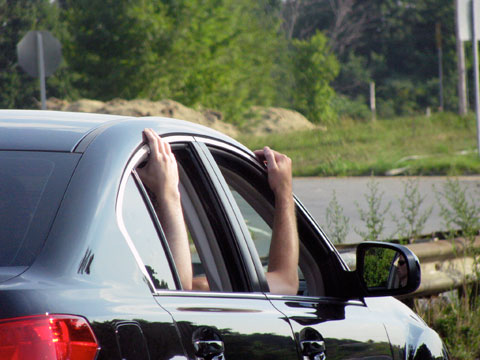 Die Klimaanlage, die inzwischen als Ausstattung mehr und mehr verbreitet ist, funktioniert allerdings nur, wenn das Fenster zu und der Arm im Wageninneren bleibt. Abgekapselt von Straßenlärm und öffentlichem Leben machen es sich moderne Pkw-Nomaden heute am liebsten hinter düster getönten Scheiben allein mit Becherhalter und iPhone bequem. Die Konsequenz zunehmender Autoprivatheit persiflierte in den vierziger Jahren schon der Surrealist Boris Vian in einer Kurzgeschichte, in der eine Gruppe „Clockwork Orange"-Durchgeknallter nachts im rosarot verglasten Auto durch Paris rast, um Fußgänger wie Bowlingfiguren umzunieten. In steril abgeschlossenen Wohlfühlzonen, so die Moral von der Geschichte, verschieben sich surreal Perspektiven und Realitäten. Dass in einer Welt vollklimatisierter Wohnkapseln, wo die Leute kaum mehr aus ihren Wohnungsfenstern schauen, das Arm-aus-dem-Fenster-halten-Ritual ausgerechnet in der „Air-Conditioned Nightmare"-Nation Amerika noch lebendig ist, scheint geradezu ein Wunder. Während sich Amerikaner ansonsten in Hightech-Temperaturzonen einschließen, die Fenster in Zügen genauso zugefroren sind wie die in Bürotürmen und Hotels, gilt beim Autofahren noch die Freiheit der Straße, wird die Verbindung zur Außenwelt gesucht, übt man sich in einer Offenheit, die sonst kaum mehr existiert.