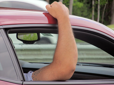 Die Akzeptanz des „Arm-raus"-Rituals ist jedoch nicht überall so selbstverständlich akzeptiert. In Deutschland steckt wohl ein gewisser Klassendünkel dahinter, als würde die Geste nur von einer bestimmten Schicht praktiziert. Es bleibt oft Fake, wie Spoilerkitsch und Felgenschick: Demonstrativ wird mit einer Hand gelenkt und geschaltet, während die andere Hand aus der schicken Metallic-Wunsch-Karosse baumelt. Vielleicht fehlt es den Deutschen aber auch nur an Lässigkeit. In anderen Ländern mit besserem Wetter und einer anderen Kommunikationskultur, wo mehr mit Gesten gesprochen wird, scheint der Arm jedenfalls schneller aus dem offenen Autofenster zu wandern. Ein bisschen Dolce Vita ist dabei, wenn die Italiener ihre Autofenster wie eine fahrende Bühne bespielen, man sich nicht im keimfreien Wohlfühlkosmos verschanzt, mit dem Wind auf dem Unterarm das unangestrengte Gefühl warmer Tage und beschaulicher Sparzierfahrten beginnt.
