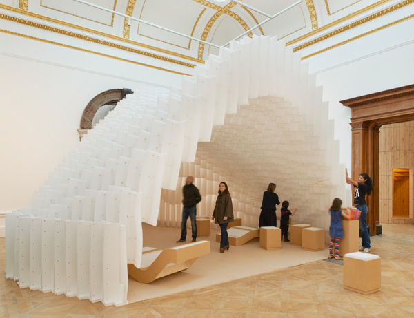 Die höhlenartige Installation von Diébédo Francis Kéré sieht mittlerweile viel bunter aus. Nicht nur Kinder bestücken sie mit den bunten Halmen. Foto © Royal Academy of Arts, James Harris