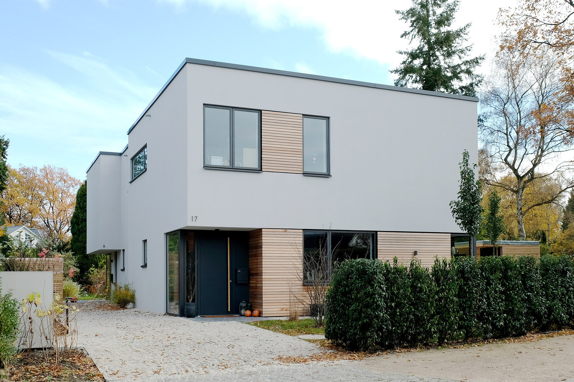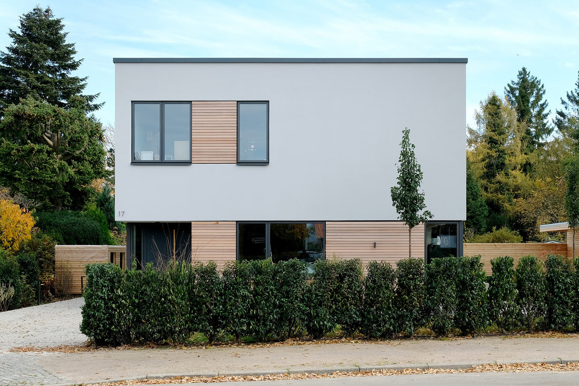 Klare Linien prägen das Hamburger Doppelhaus der Bauherrenfamilie Müller-Wiefel: Der Flachdachbau, der von Leifpeter Reichwald vom Büro Architekt Reichwald GmbH entworfen wurde, orientiert sich dazu an der klassischen Moderne und am Bauhaus. Heller Putz und bündig platzierte Fenster bestimmen das Erscheinungsbild der Fassade. Ergänzt wird diese durch horizontal verlegte Holzpaneele, die dem Doppelhaus eine zusätzliche Wärme und Natürlichkeit verleihen. Neben gelungenen Fassadendetails war den BauherrInnen eine optimale Funktionalität sowie die kohärente Verknüpfung von äußerem Erscheinungsbild und innerer Gestaltung wichtig. Das gilt auch für die jeweiligen Badezimmer, bei denen sie sich für Produkte von Geberit entschieden.