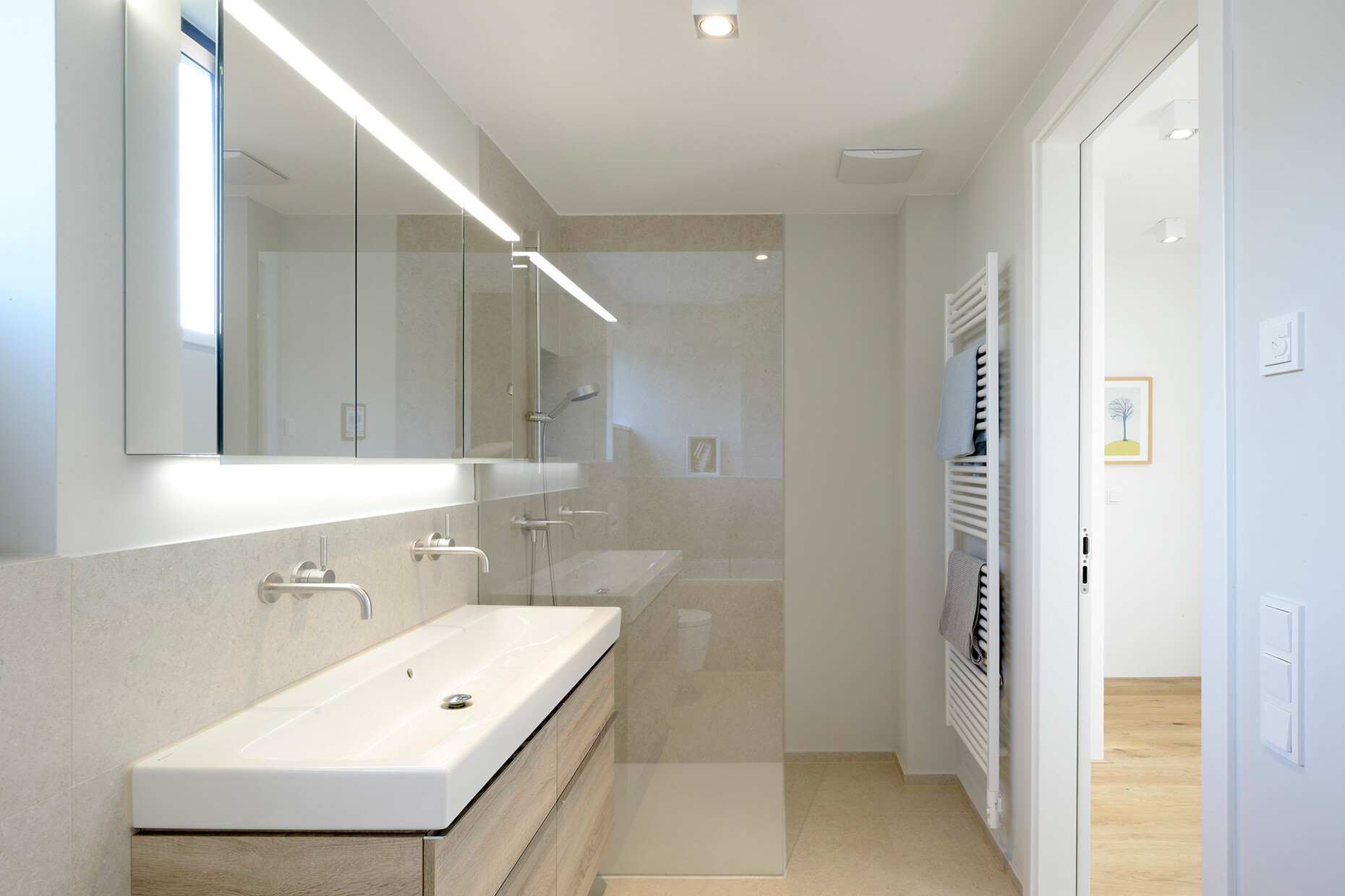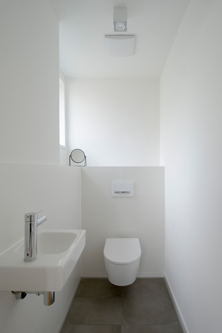 Die Badezimmer und Gäste-WCs der beiden Haushälften sind entsprechend funktional und reduziert gehalten, was sich unter anderem an der Anordnung der Sanitärgegenstände zeigt: Sie ermöglicht es den Familienmitgliedern, gleichzeitig Bad, Dusche und Waschtisch zu nutzen, ohne sich gegenseitig zu stören. Entsprechend der minimalistischen Architektursprache entschied sich Familie Müller-Wiefel für eine Sanitärausstattung in klassischem Weiß. Sowohl die Keramikfliesen wie Natursteinbeläge in den Farbtönen Natur, Weiß und Anthrazit als auch die Möbelfronten in Holzoptik greifen das warme Erscheinungsbild der Fassade auf und erzeugen ein natürliches Raumgefühl in den Bädern. Um den minimalistischen Ansatz auch im Detail umsetzen zu können, bilden die Bereiche vor und hinter der Wand eine Einheit. Zum Einsatz kam deshalb das Vorwandinstallationssystem "GIS" von Geberit, bei dem alle Bauteile aufeinander abgestimmt sind. Dieses ermöglicht nicht nur eine optimale Produkt- und Ausführungsqualität mit minimaler Montagezeit, sondern auch eine reduzierte Gestaltung. Beispiele dafür sind die in das Vorwandsystem integrierte Ablagenischenbox für Shampoo und Duschgel oder das Installationselement der rahmenlosen Duschtrennwand. Im Bad der von Familie Müller-Wiefel genutzten Doppelhaushälfte kommt zudem ein "Geberit iCon-Unterschrank" für den Waschtisch in Eiche Melamin Holzstruktur mit dem beleuchteten dreitürigen Spiegelschrank "Geberit Option Plus" zum Einsatz. Beides schafft genügend Stauraum, um den Wunsch nach einem minimalistischen Ambiente umsetzen zu können. "Dadurch entsteht ein cleaner Eindruck, der auch im Alltag aufrechterhalten werden kann", sagt Architekt Leifpeter Reichwald dazu.