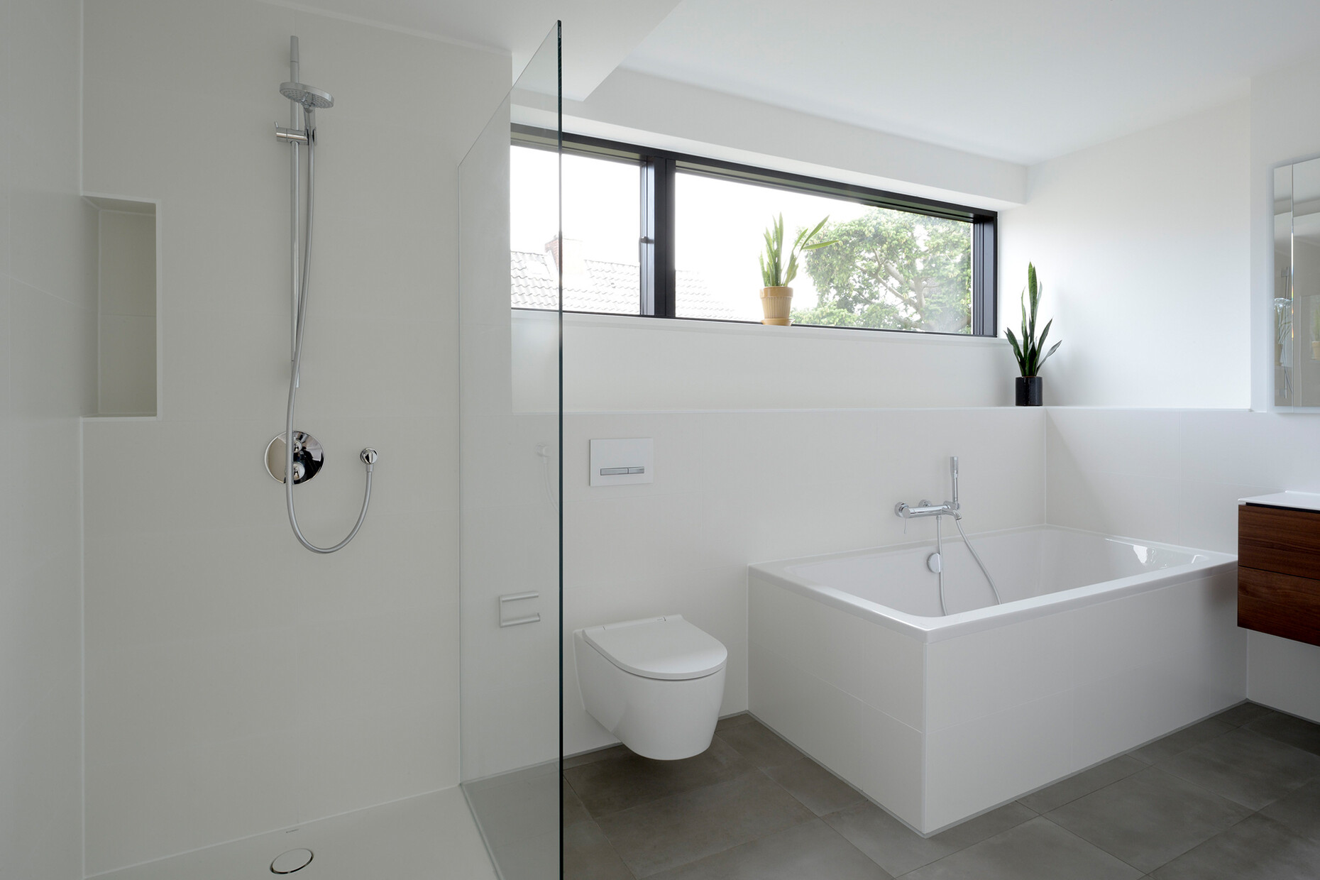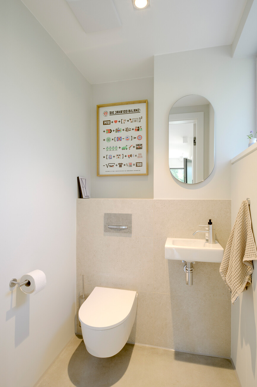 Dass die Reduktion auf das Wesentliche nicht automatisch Abstriche beim Komfort bedeutet, zeigt das Dusch-WC "Geberit AquaClean Sela" im Hauptbad der Familie: Dort verfeinert die integrierte WhirlSpray-Duschtechnologie einen pulsierenden Duschstrahl durch dynamische Luftbeimischung. Die Reinigung mit "Geberit AquaClean Sela" ist dabei nicht nur hygienischer und komfortabler als mit Papier, sondern spart bei der Nutzung auch Wasser ein. In der vermieteten Haushälfte kam die Badserie "Geberit ONE" zum Einsatz – zum Beispiel in Form des WCs, das ohne sichtbare Befestigungsschrauben auskommt und nachträglich in unterschiedlichen Höhen installiert werden kann. Hinzu kommen ein Waschtisch mit Wandarmatur und Unterschrank sowie ein Spiegelschrank mit Beleuchtung. Der Waschtisch-Ablauf ist am hinteren Rand des Beckens platziert. Dadurch ist er nicht direkt dem Wasserstrahl ausgesetzt, was die Bildung von Wasser- und Kalkrückständen erschwert. In den Hauptbädern beider Haushälften wurde zudem die Badewanne „Geberit Tawa“ wie auch die Duschfläche "Geberit Setaplano" mit einem praktischen Kammeinsatz und einem kantenlosen Ablaufbereich verbaut. Letztere ermöglicht als bodenebene Walk-in-Dusche ein hohes Maß an Bewegungsfreiheit, das die Großzügigkeit der Bäder um ein barrierefreies Duscherlebnis ergänzt.