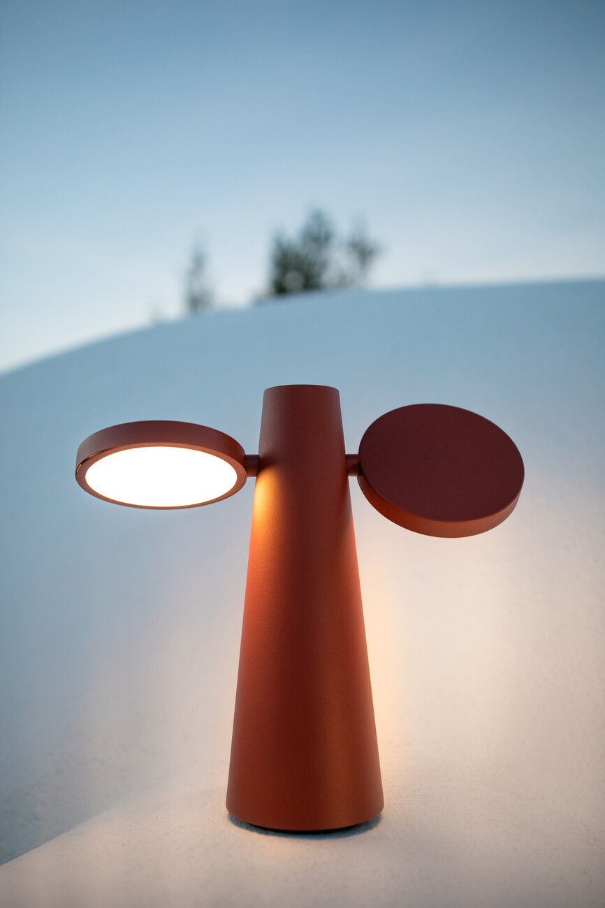 Die originelle kabellose Tischleuchte von Fermob, die kürzlich mit einem Red Dot Design Award in der Kategorie "Produktdesign 2024" ausgezeichnet wurde, ist sowohl eine Beleuchtungslösung als auch ein dekoratives Objekt. Ihr Name "OTO" leitet sich von ihrer Form ab: An einer zentralen konischen Säule sind zwei "Augen" angebracht. Diese sind um 360° schwenkbar, so dass die gewünschte Lichtrichtung je nach Situation eingestellt werden kann. Dies ermöglicht eine Vielzahl von Einsatzmöglichkeiten: als Tisch- oder Nachttischleuchte, als dekorativer Strahler auf einem Sideboard oder im Restaurant. Durch eine Schlaufe am Sockel kann die Leuchte auch kopfüber aufgehängt werden. Farbtemperatur und Lichtintensität werden über einen Touch-Schalter moduliert. Mit einer Höhe von 27 Zentimetern ist "OTO" in den Farben Beige, Grau, Schwarz und Ockerrot erhältlich.