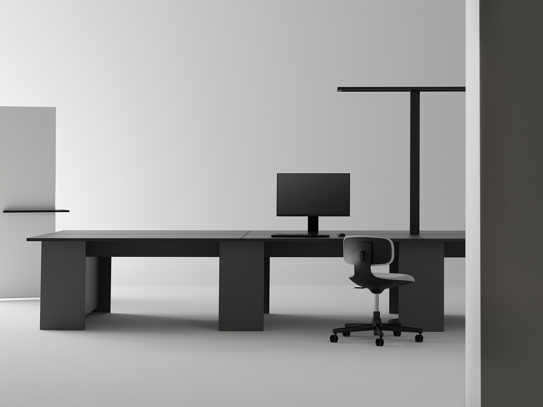 Angelehnt an das Konferenztischprogramm haben Relvāokellermann nun mit Sebastian Waibel, dem Geschäftsführer des Büromöbelherstellers Gumpo, das gemeinsame Portfolio um die "dito Workbench" erweitert. "Wir haben unsere Kollektion immer auch als Minibewegung gegen die knalligen Loungemöbel-Büros empfunden. Denn nicht jedem liegt diese Atmosphäre und viele Menschen arbeiten nach wie vor gerne – ganz "normcore" – an einem Tisch. Daher war klar, dass wir uns mit der Typologie Schreibtisch weiterhin beschäftigen und an das Hier und Jetzt anpassen wollen", so Waibel. Aus den Platten, Böcken und Holztraversen der "dito Workbench" lassen sich so ganz einfach verschiedene Arbeitsinseln zusammenstellen und zu Formationen kombinieren. Im Material setzt Gumpo auch bei der Erweiterung überwiegend auf nachhaltige Holzwerkstoffe. "Gumpo war und ist ein holzverarbeitender Betrieb und wir wollen unsere Fertigungstechnologien und unser Know-How in zeitgemäße Produkte übersetzen, ohne unsere Vergangenheit und Identität aufzugeben. Dass wir die komplette 'dito'-Serie im eigenen Haus produzieren, ist auch für unsere Kunden ein Vorteil, denn wir können relativ problemlos auf individuelle Wünsche eingehen", so Sebastian Waibel. Dem angenehm reduzierten Charakter der Ursprungskollektion steht die "dito Workbench" um nichts nach: Mit breiten Tischbeinen und geometrischen Linien wirkt das Design klar und grafisch.