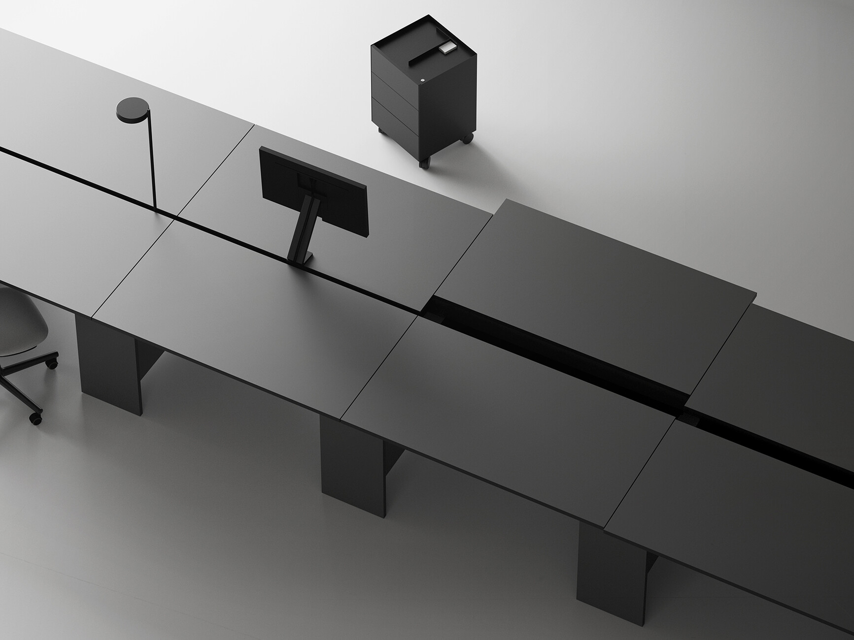 Der obligatorische Kabelsalat bleibt verborgen, da er verdeckt über die Böcke in einen zentralen Kanal geführt wird. Die Steckdosen sind indes unter einer Schiebeplatte stets gut erreichbar. Bei Bedarf kann die "dito Workbench" ganz einer Werkbank entsprechend mit weiteren Accessoires ausgestattet werden, seien es Leuchten oder Abschirmwände. Zudem können die Unterkonstruktion und Tischplatten mit unterschiedlichen Oberflächen belegt werden, von der Melaminharzbeschichtung über Furnier bis hin zu supermatten Schichtstoffen. "Aufgrund der aktuellen Pandemie stehen wir jetzt vor einem Moment des Übergangs und der Anpassung in Bezug auf das moderne Büro. Telearbeit ist etwas, das von Unternehmen immer häufiger eingesetzt wird, aber der Büroraum bleibt der Hauptarbeitsplatz. Sein sozialer und kollaborativer Charakter wird noch wichtiger als zuvor – ebenso ist das Büro auch ein Ort für konzentriertes Arbeiten. Mit der "dito Workbench" hatten wir das Ziel, ein Tischsystem zu entwickeln, das alle wesentlichen Funktionen integriert, ohne zu technisch zu wirken. Es ist ein Arbeitstisch, der je nach Bedarf geplant werden kann: offener, um die Kommunikation zu fördern, oder mit Sichtschutzwänden, wenn beispielsweise Privatsphäre wichtig ist. Wir glauben, dass Büromöbel die Menschen bei ihrer Arbeit unterstützen, als Leinwand für ihre Handlungen dienen und Möglichkeiten zur Kommunikation und zum Selbstausdruck bieten sollten, während sie gleichzeitig für die Technologie und die Werkzeuge von heute vorbereitet sein müssen.", so Relvãokellermann.