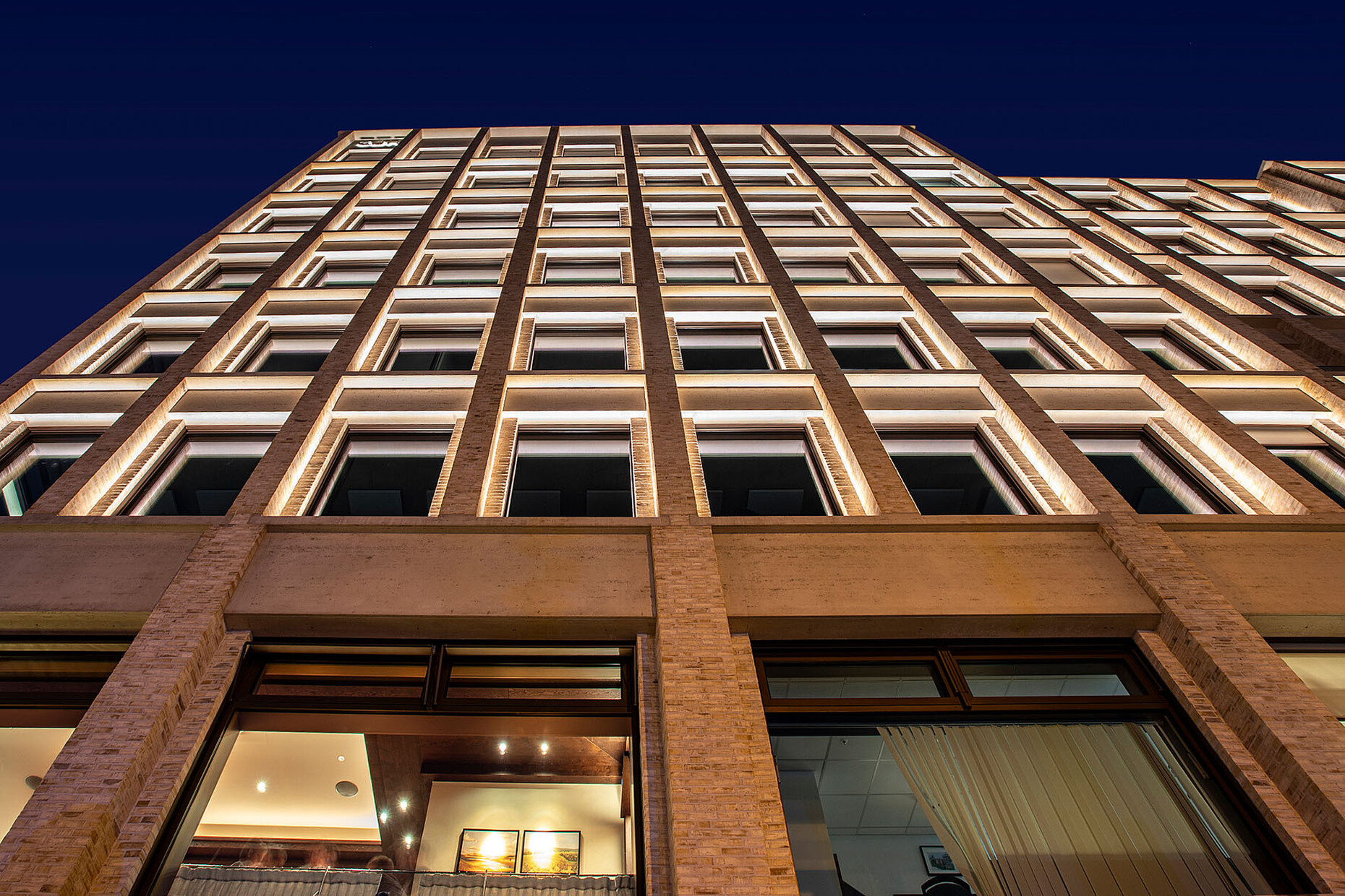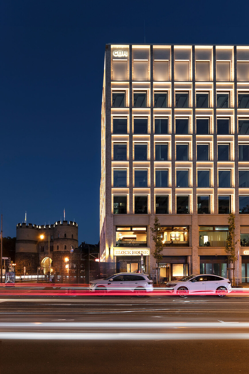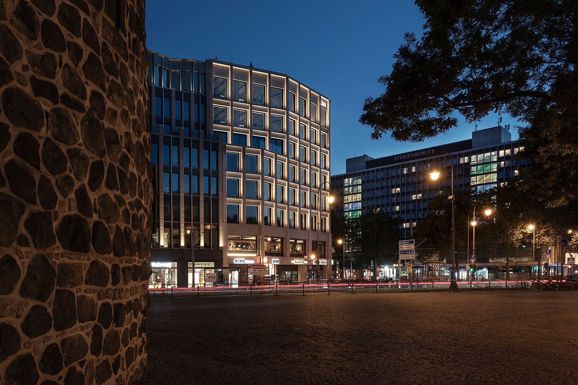 Dudler erfüllt die architektonische Aufgabe, indem er für das Geschäftshaus vermeintliche Gegensätze kombiniert. Zum einen bringt er Bewegung in den Grundriss und die Fassade. Zum anderen fügt sich seine Architektur in die Blockstruktur der Umgebung ein: Mit einer Kombination aus geschlemmtem Ziegel für die Pfeiler und Werksteinelementen für die Sturzbereiche reflektiert das Gebäude auch die Materialität des denkmalgeschützten Stadttors. Die Symmetrie der Fenster bringen architektonische Aufgeräumtheit. In die Fensterlaibungen des achtgeschossigen Baus sind 133 Edelstahlgehäuse mit Blendrahmen eingelassen, und LED-Leuchten von ADO Lights akzentuieren die Struktur. Die flächenbündige Glasabdeckung verhindert starke Verschmutzung und sorgt für optische Einheitlichkeit.